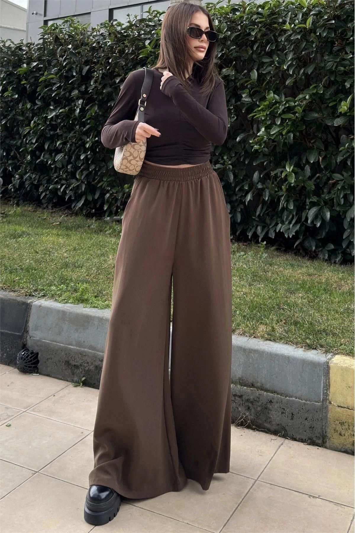 Kahve Beli Lastikli, Cepli, İspanyol / Bol Paça Özel Kumaş, Rahat Kalıp Pantolon - Tesettüre Uygun