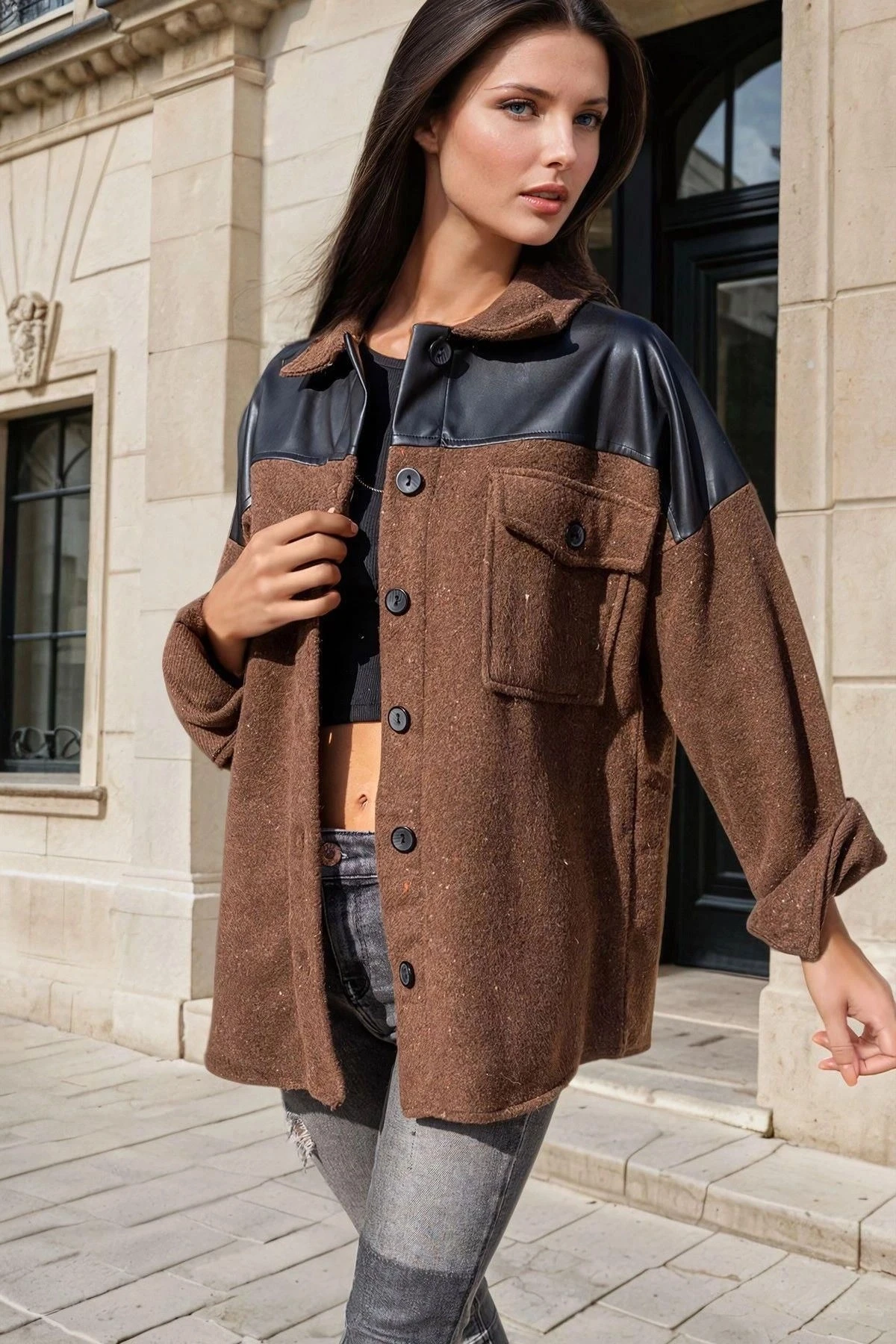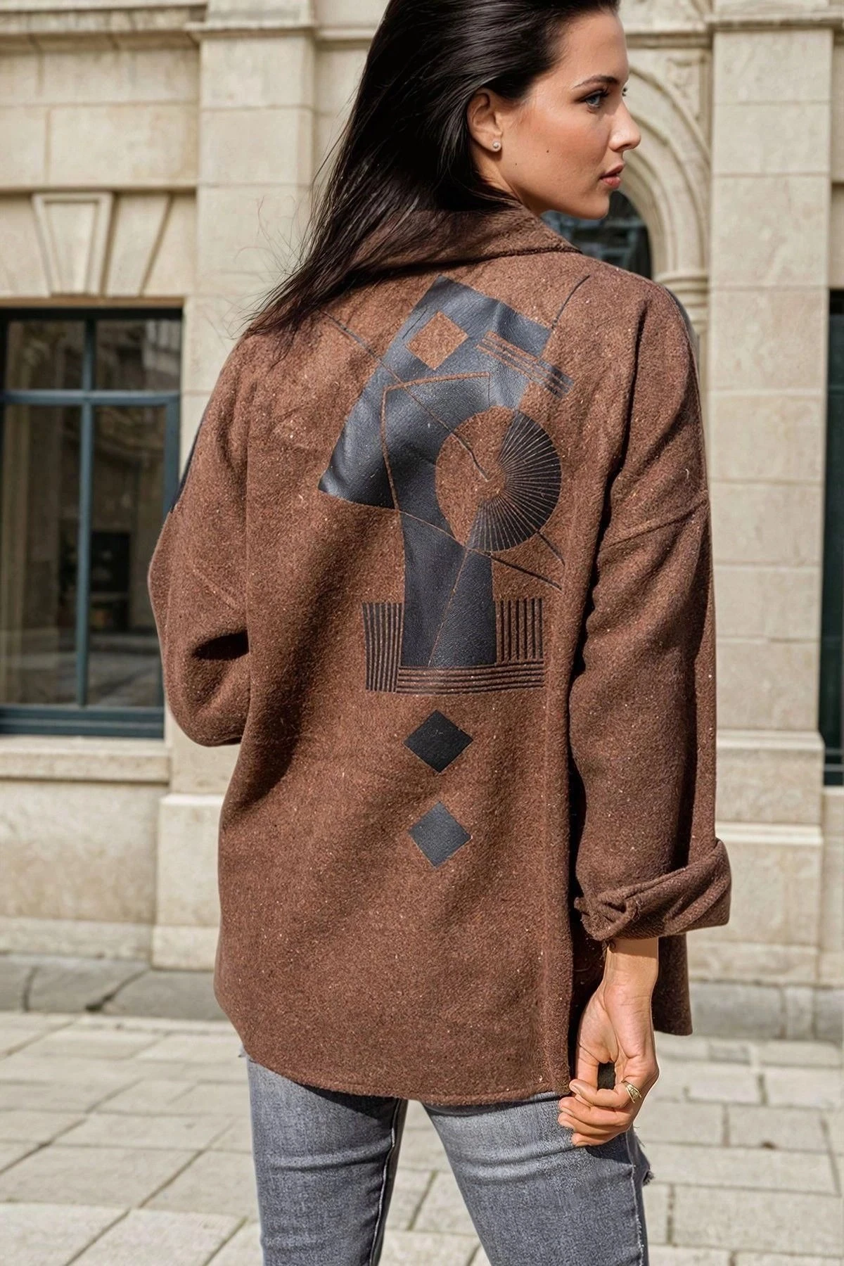Kahve, Deri Detaylı, Desenli Kaşe Gömlek