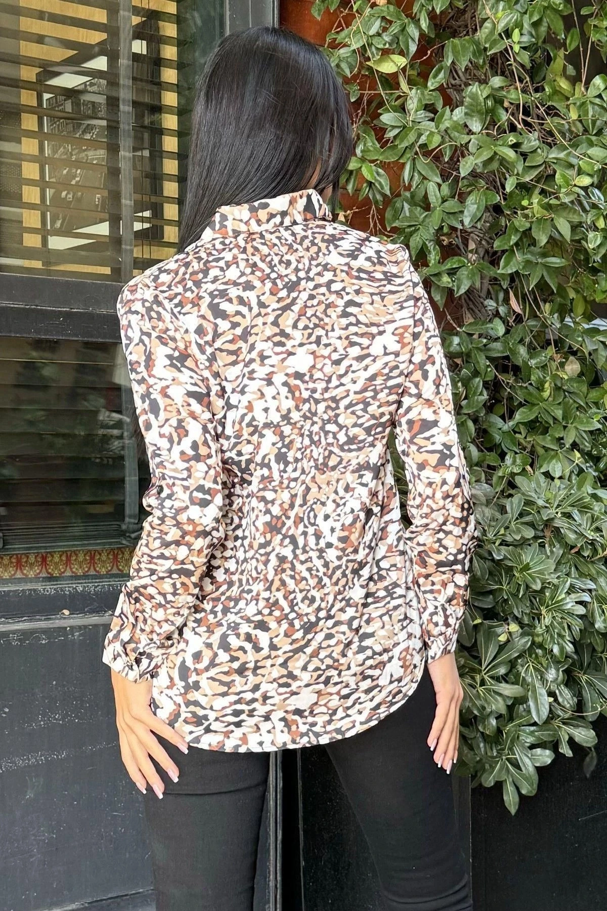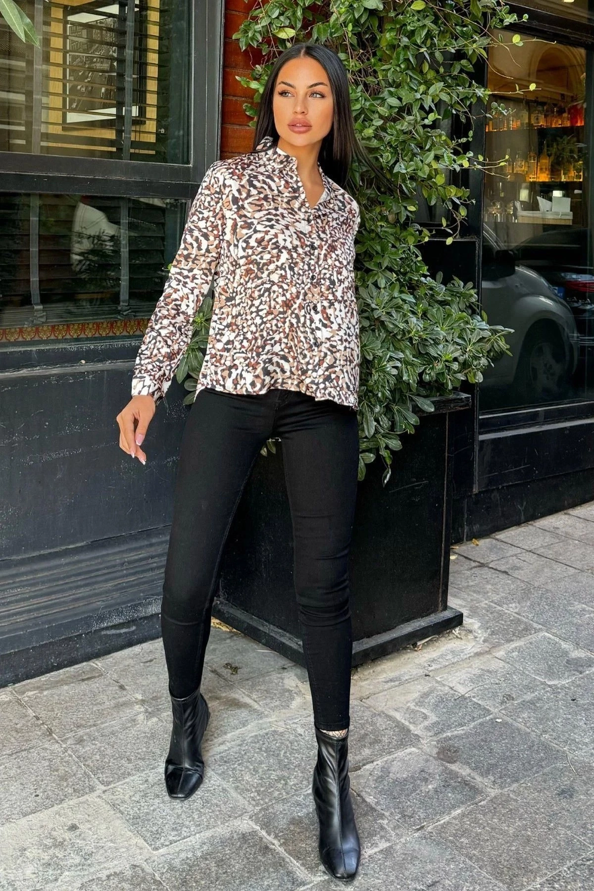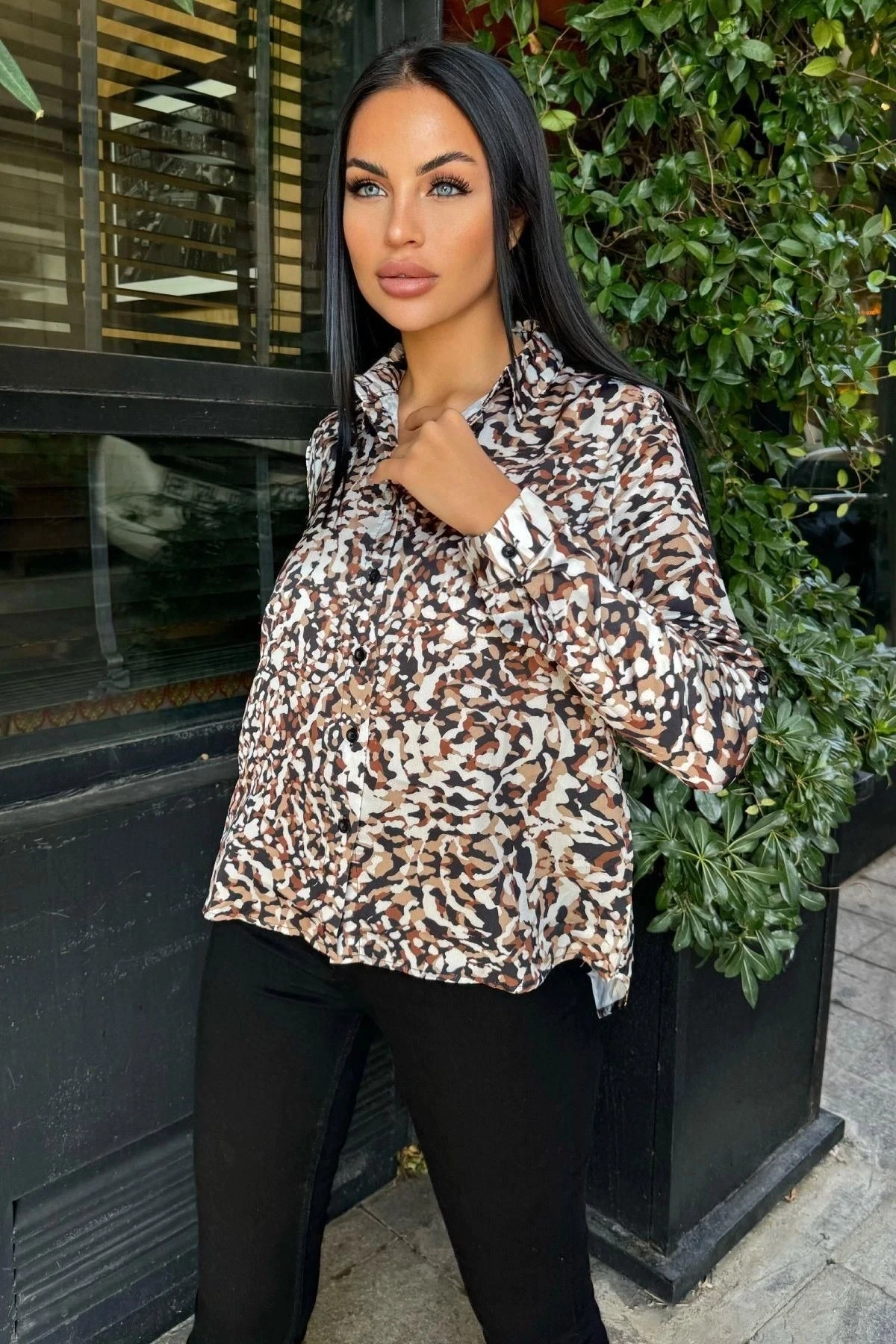 Kahve Leopar Desenli, Uzun Kol, Klasik Kesim, Saten Gömlek