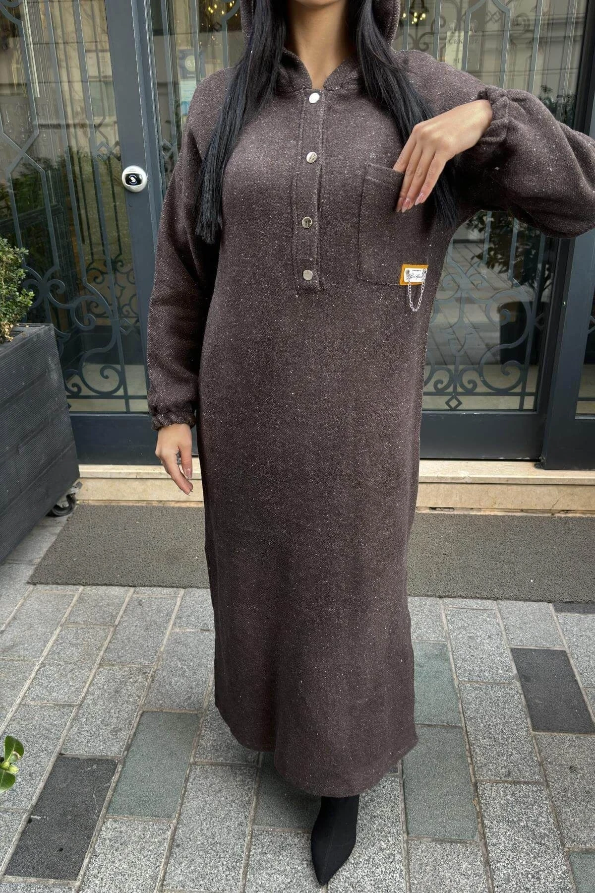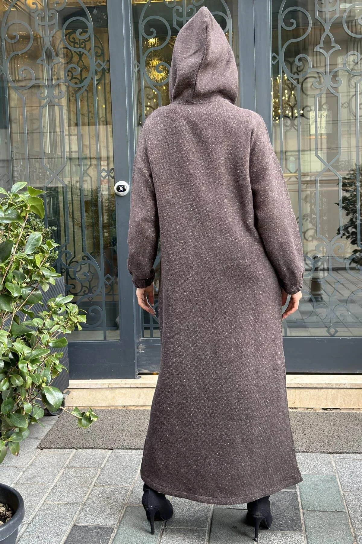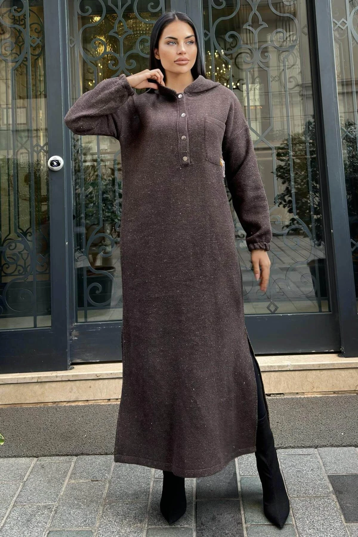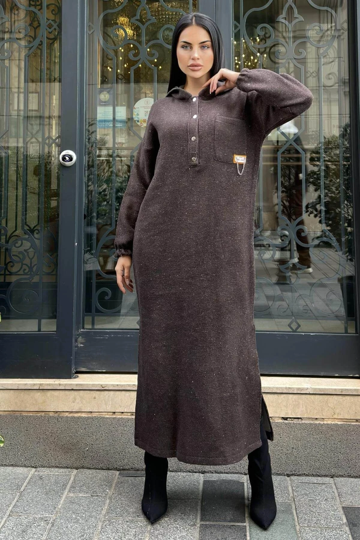 Kahverengi Çift Taraflı Kapüşonlu, Yırttmaç Detaylı, Duble Yumoş Kaşe Uzun Elbise