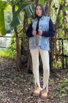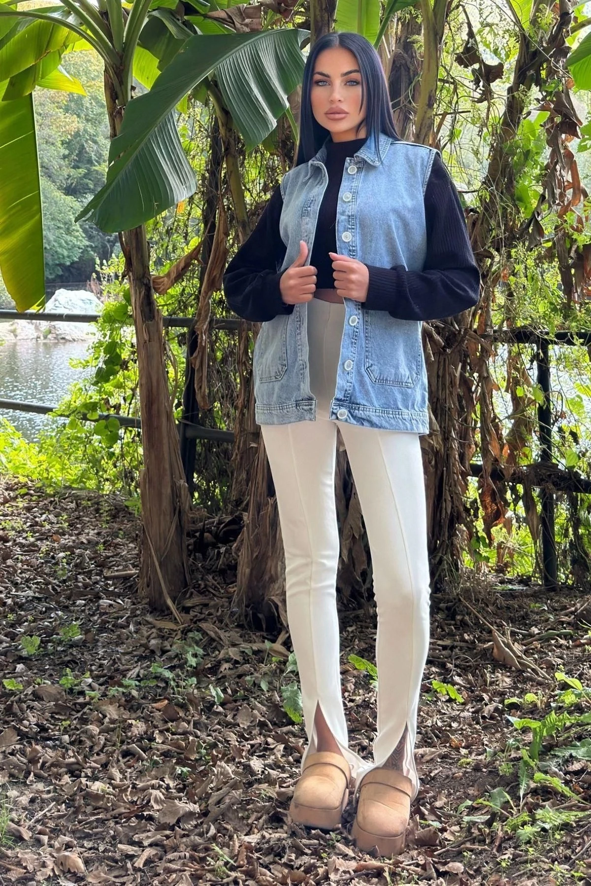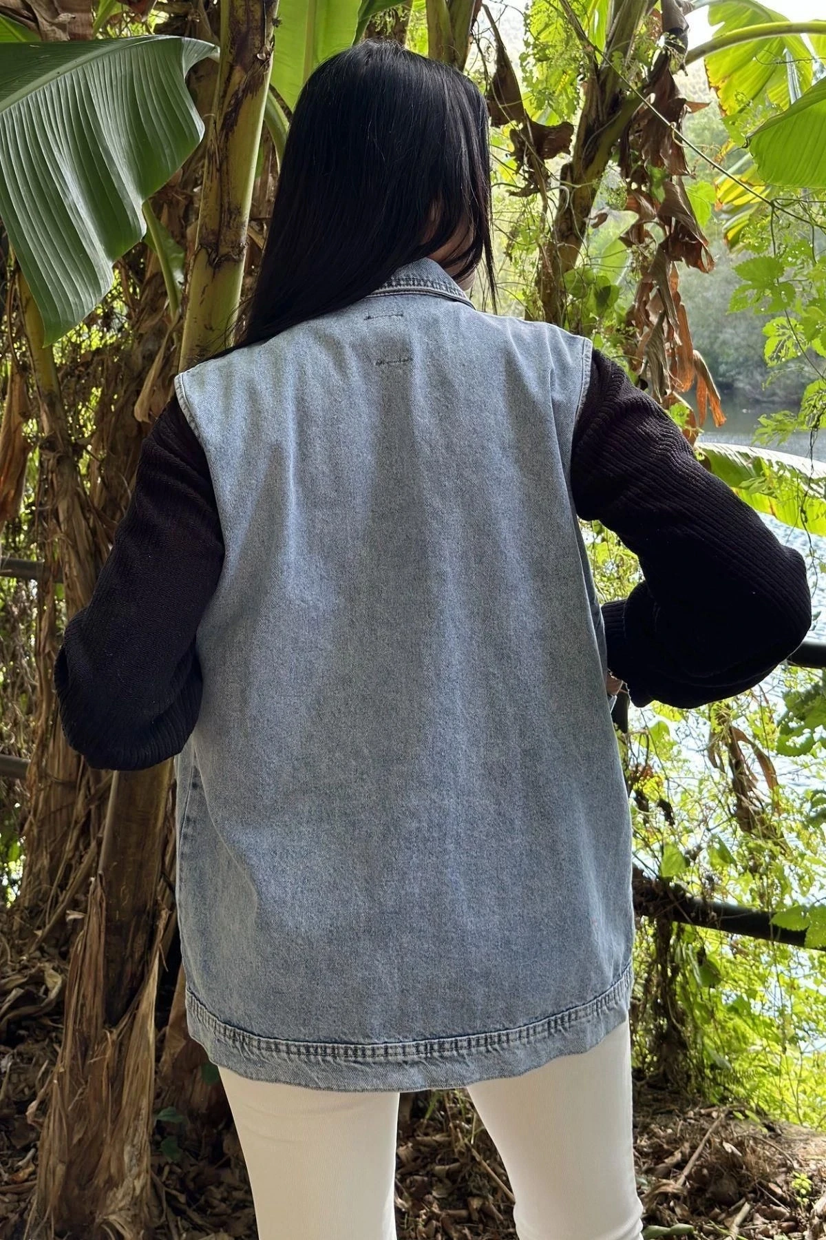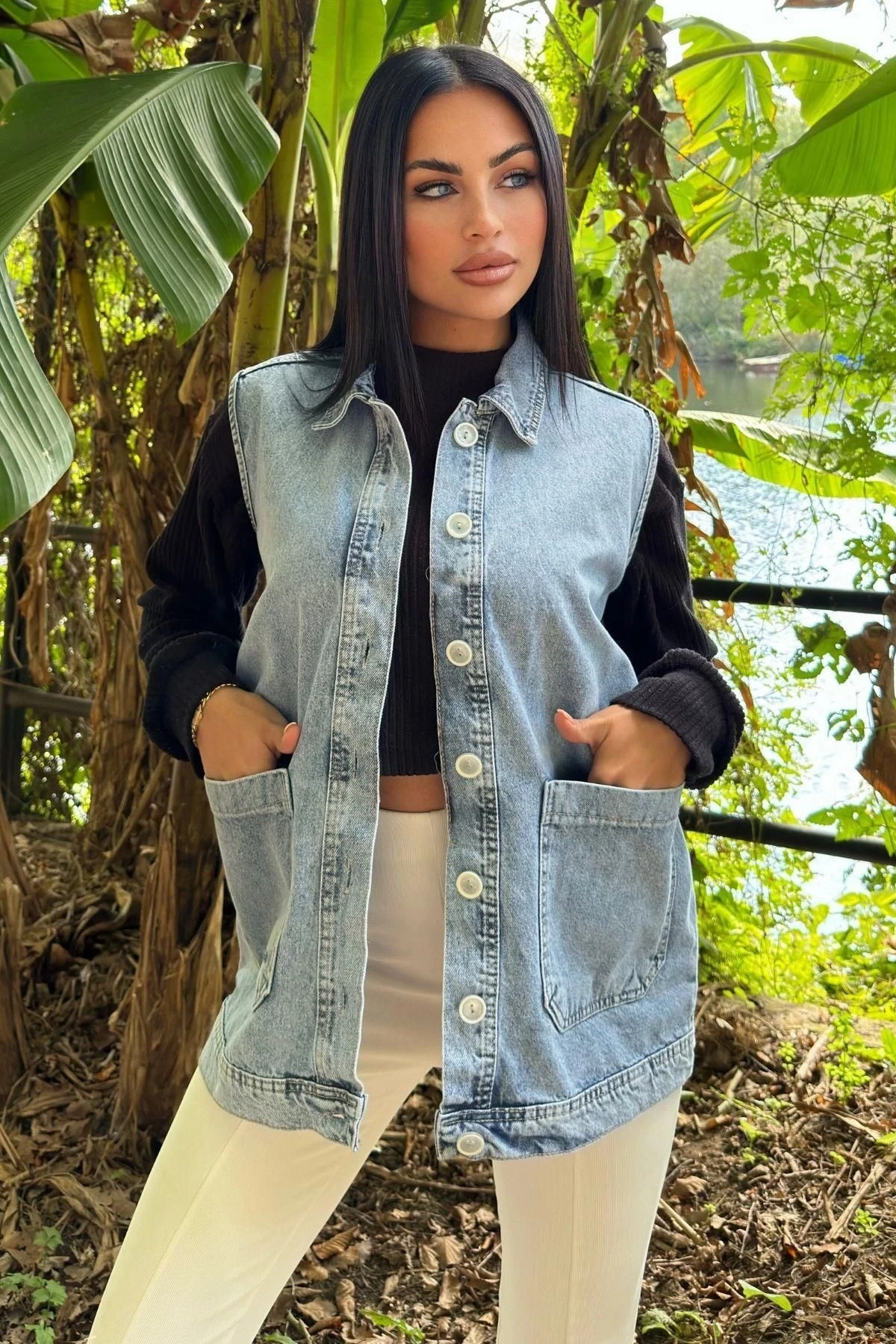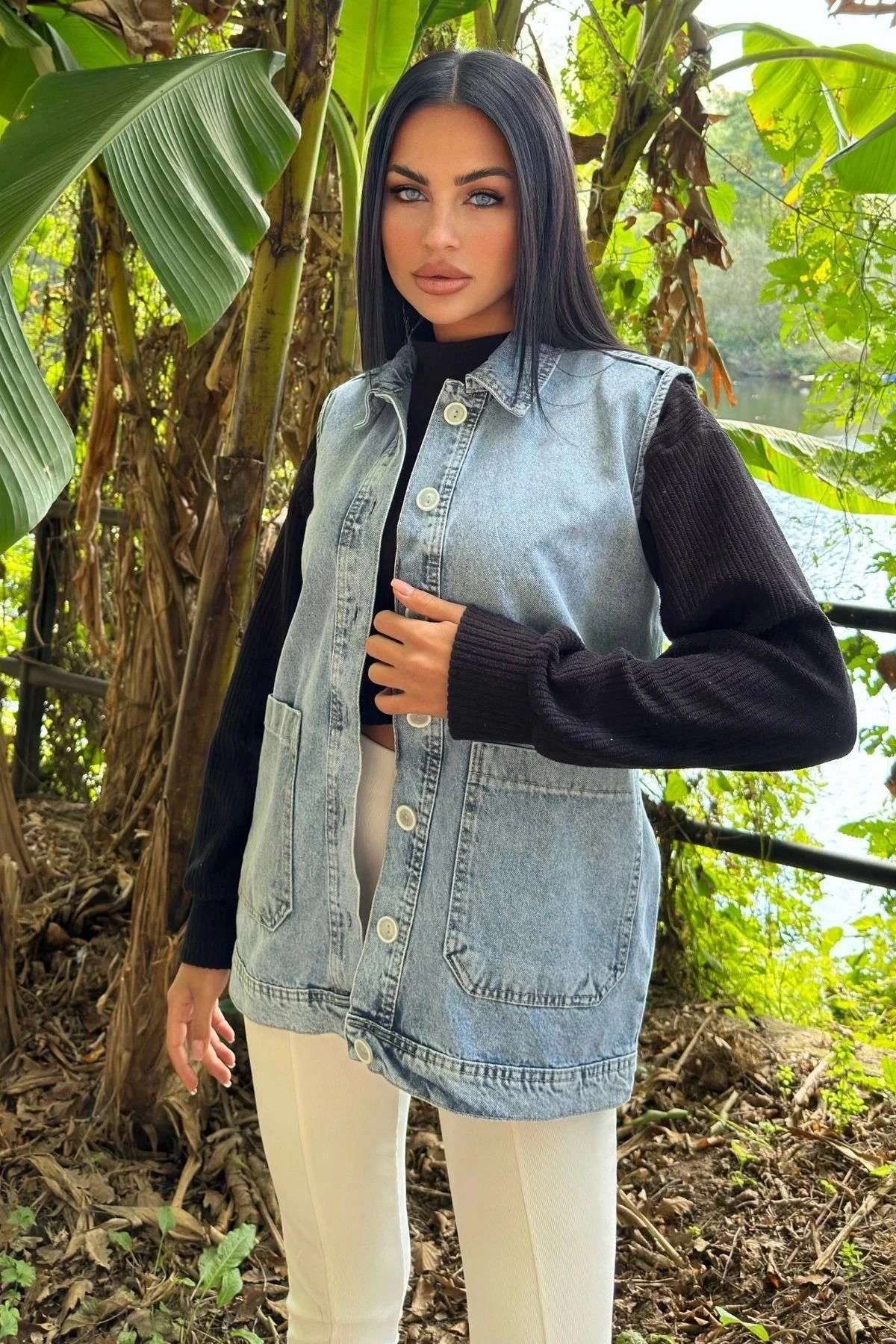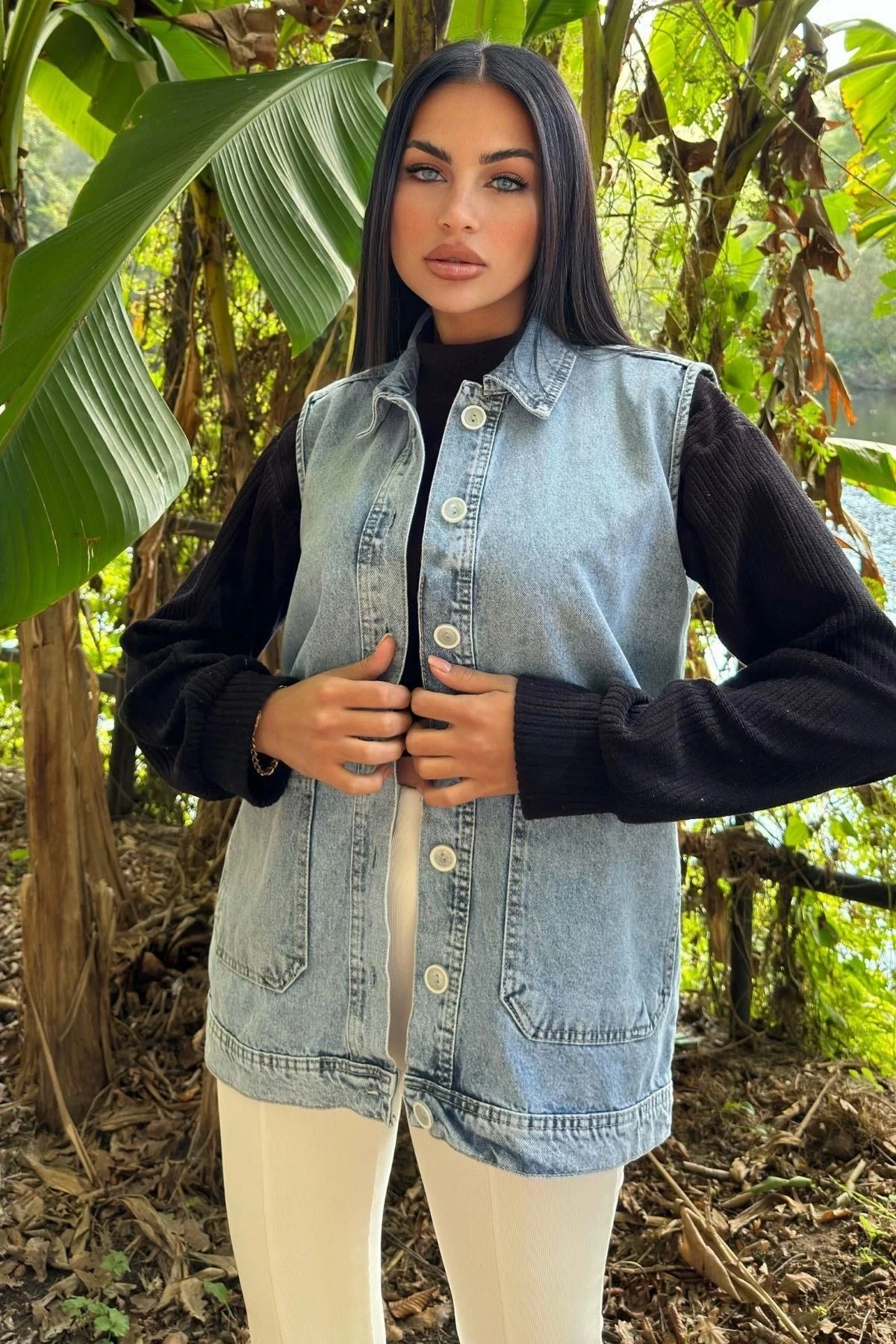 Kar Yıkama Mavi Kolsuz, Düğmeli, Geniş Cepli Uzun Kot Yelek