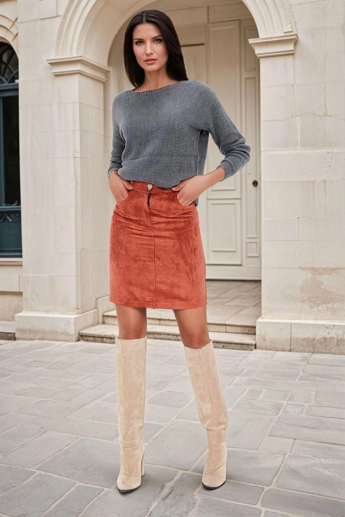 Kiremit, Kadife Kumaş, Düz Kesim, Mini Etek