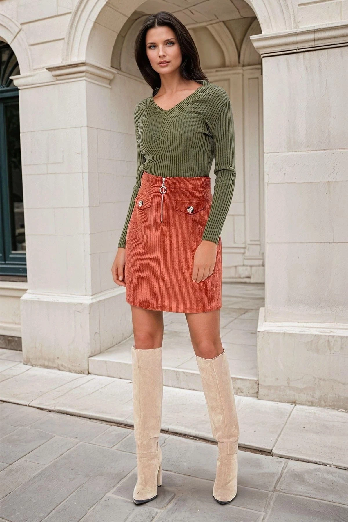 Kiremit, Kadife Kumaş, Fermuar Ve Kapak Cep Detaylı, Düz Kesim, Mini Etek