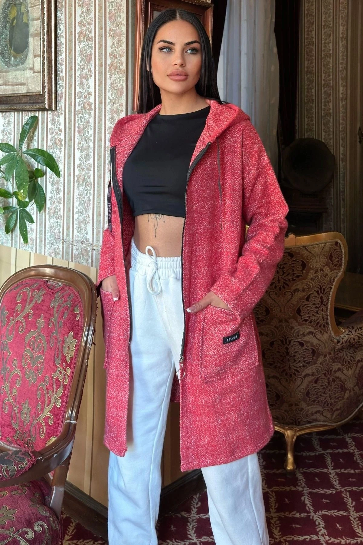 Kırmızı Arma Detaylı, Kapüşonlu, Kırçıllı Kaşe Hırka Ceket