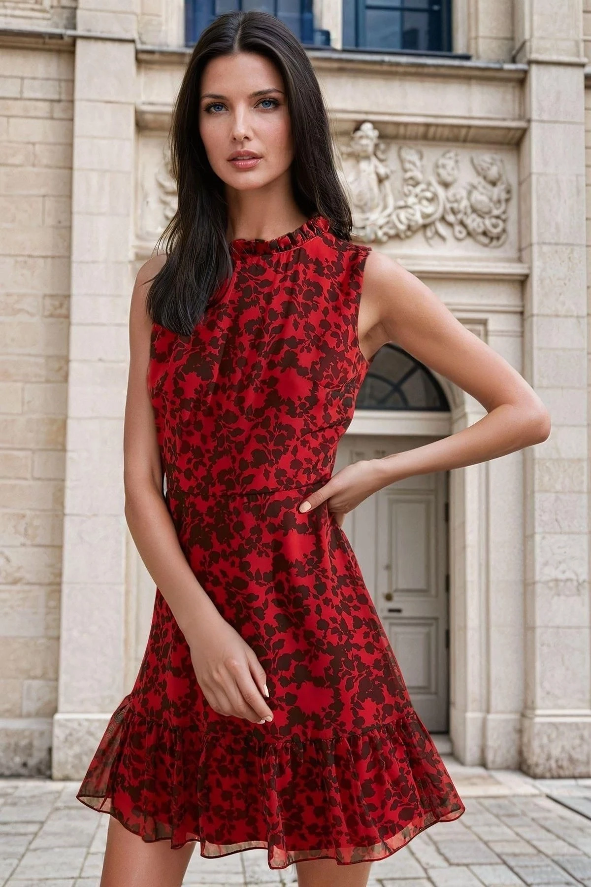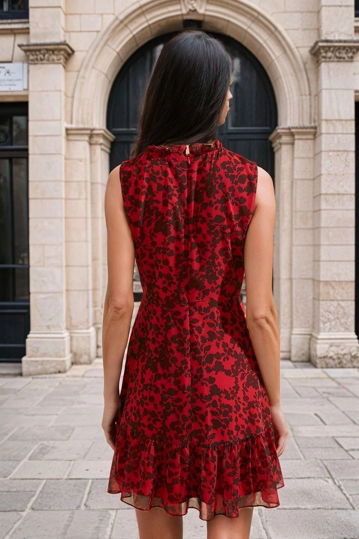Kırmızı Dik Yaka, Fırfırlı, Çiçek Desenli, Mini Elbise