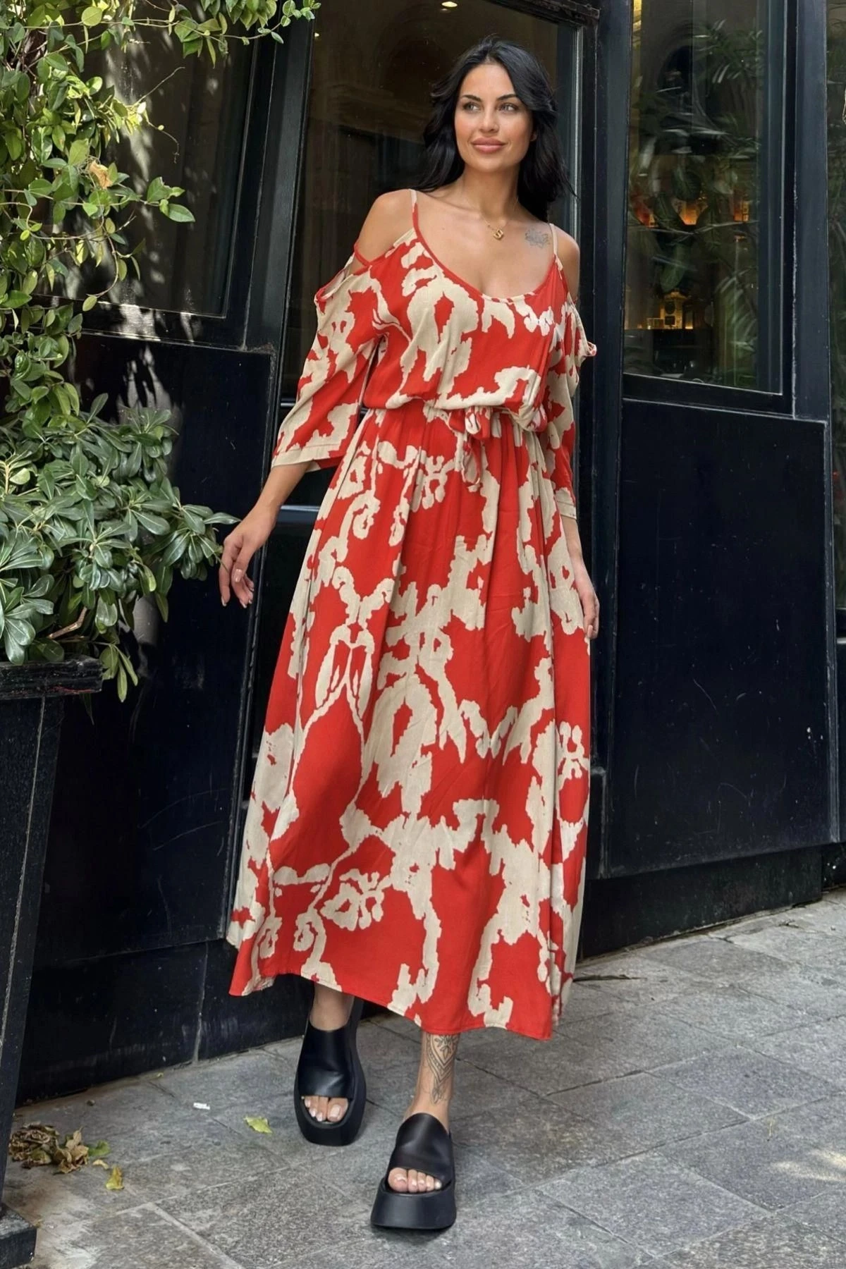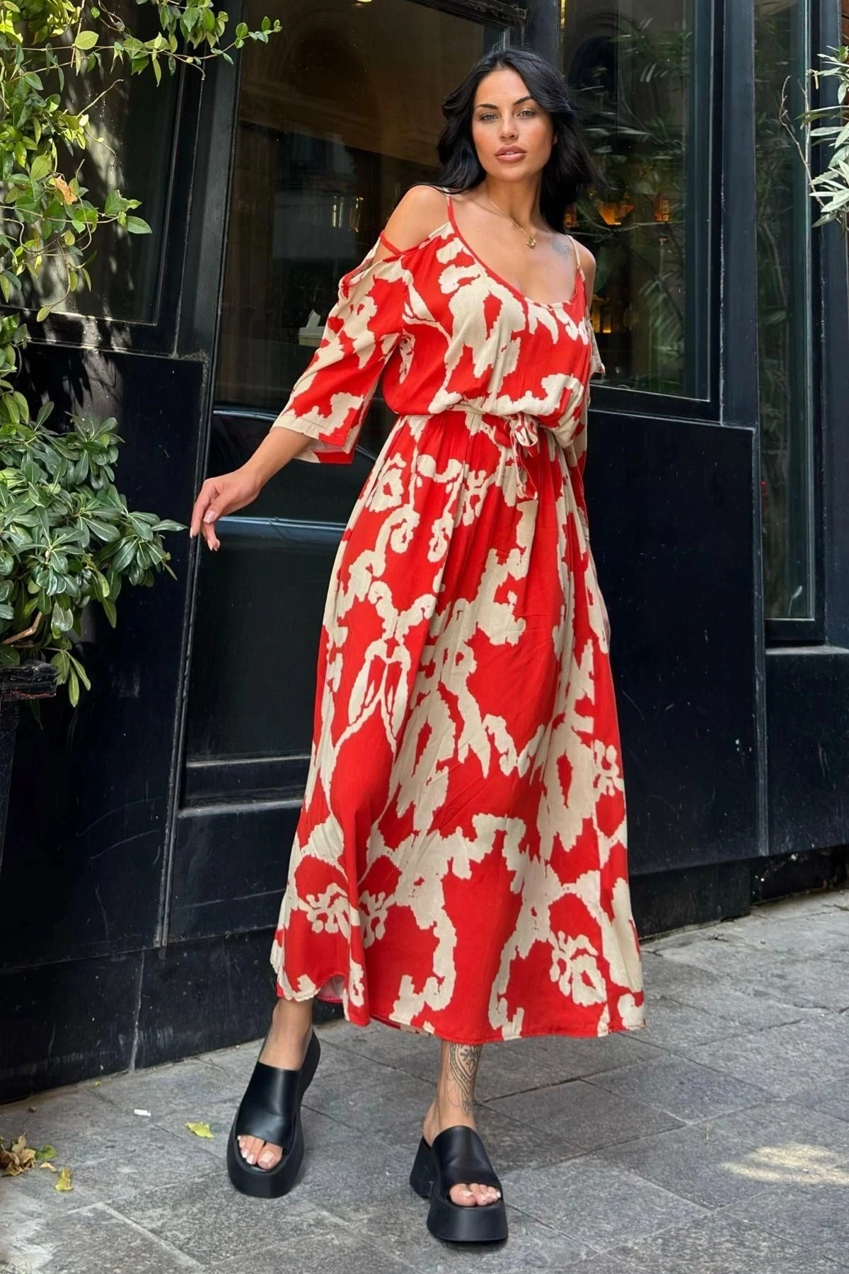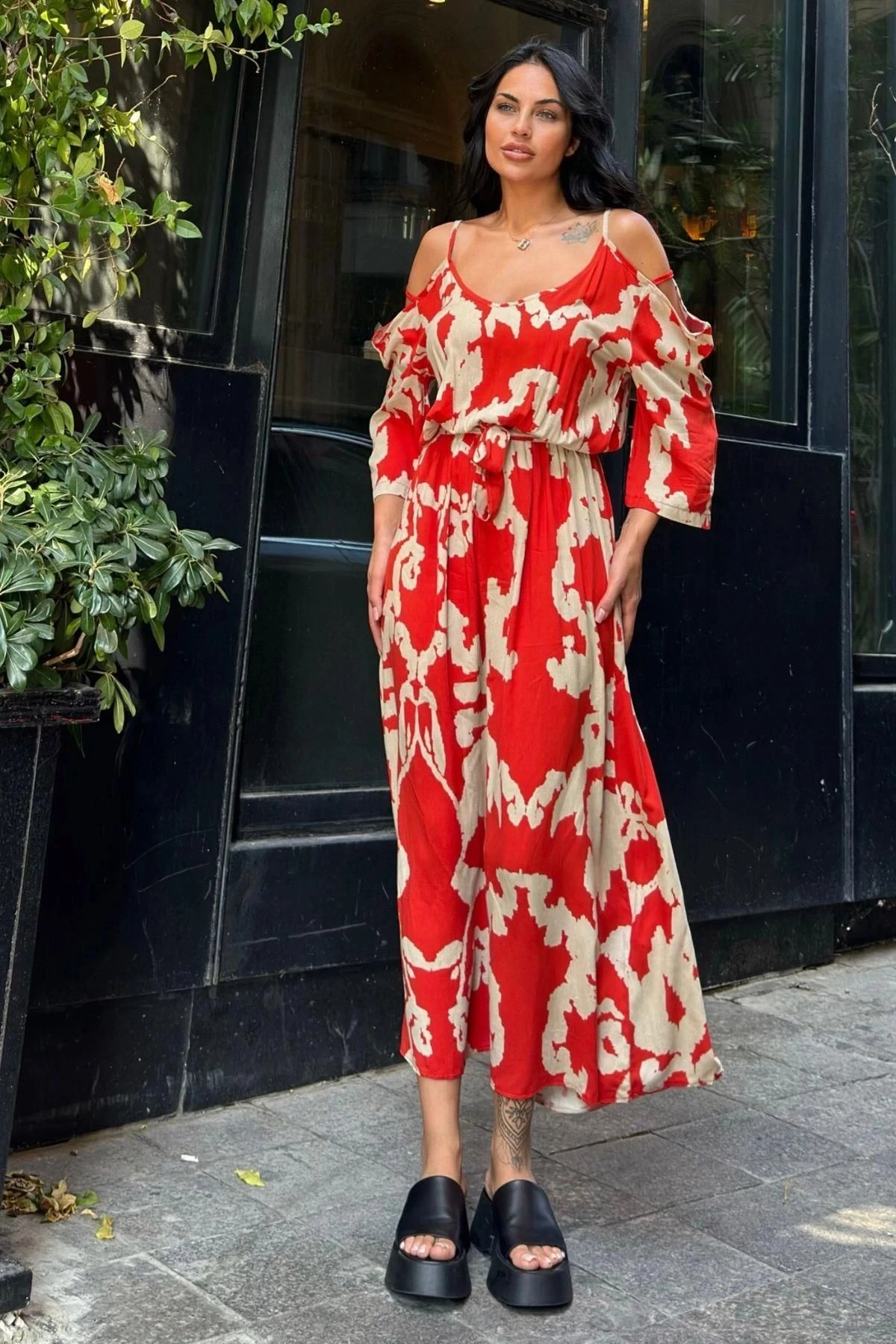 Kırmızı Viskon Kemerli Omuz Detaylı Uzun Elbise