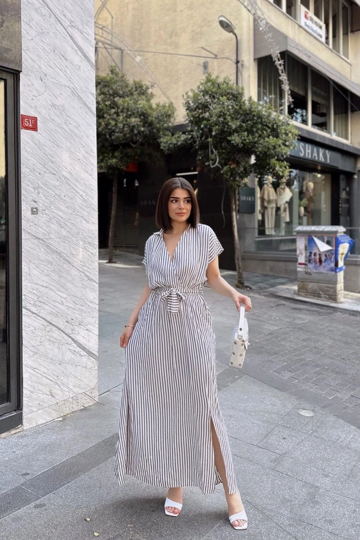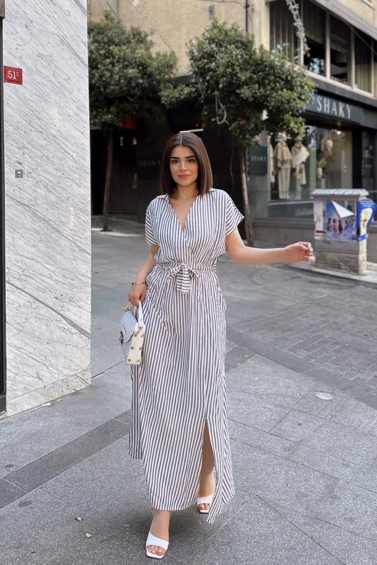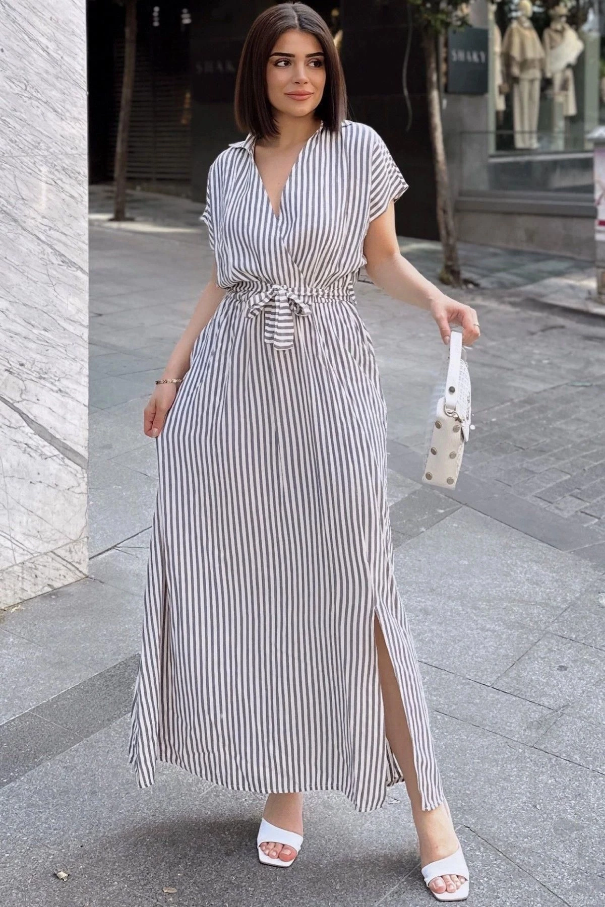 Bu Laci & Ekru renkteki Kruvaze Polo Yaka, Kısa Kol, Çizgili Yazlık Kumaş, Yırtmaçlı, Kemerli/Kuşaklı, Maxi Uzun Elbise, şıklık ve rahatlığı bir arada sunar.; %60 cotton %40 polyester karışımı kumaş, yaz aylarında serinlik ve konfor sağlar.; Çizgili yazlık kumaş, enerjik ve canlı bir görünüm sunar.; Laci ve ekru renklerinin birleşimi, elbisenin şık ve sofistike bir tarza sahip olmasını sağlar.; Kruvaze polo yaka detayı, elbiseye zarif bir hava katar ve farklı bir stil sunar.; Kısa kol detayı, yaz mevsimine uygun bir tasarımı yansıtırken, yırtmaçlar elbisenin hareket özgürlüğünü artırır.; Beli kemerli/kuşaklı tasarım, vücut hatlarını vurgulayarak kadınsı bir siluet oluşturur.; Maxi uzunluktaki elbise, zarif bir görünüm sunarken, rahat kesimi ile hareket özgürlüğü sağlar.; Bu elbise, yaz günlerinde hem günlük kullanıma hem de özel etkinliklere uygun bir seçenektir.; Kumaşın %60 cotton %40 polyester olması, nefes alabilen ve hafif bir his sağlar.; Bu sayede, yaz aylarında bile rahat bir şekilde giyebilirsiniz.; Kruvaze polo yaka ve çizgili kumaş ise sizi şık ve stil sahibi gösterecek.; Laci & Ekru Kruvaze Polo Yaka, Kısa Kol, Çizgili Yazlık Kumaş, Yırtmaçlı, Kemerli/Kuşaklı, Maxi Uzun Elbise, gardırobunuzun en özel parçalarından biri olacak.; Şık ve zarif tasarımıyla dikkat çeken bu elbise, yaz aylarında rahatlığı ve şıklığı bir arada sunar.; Kruvaze polo yaka detayı, elbiseye sofistike bir hava katar ve farklı bir tarz yaratır.; Çizgili yazlık kumaş ise enerjik ve canlı bir görünüm sağlar.; Kısa kol detayı, sıcak havalarda serin ve ferah bir his sunarken, yırtmaçlar hareket özgürlüğünüzü artırır.; Beli kemerli/kuşaklı tasarım ise vücut hatlarınızı vurgulayarak kadınsı bir siluet oluşturur.; Maxi uzunluktaki elbise ise zarafeti ve şıklığı bir arada sunar.; %60 cotton %40 polyester kumaş, yaz aylarında serinlik ve rahatlık sağlar.; Laci & Ekru renkleri ise elbiseye zarif ve sofistike bir görünüm kazandırır.