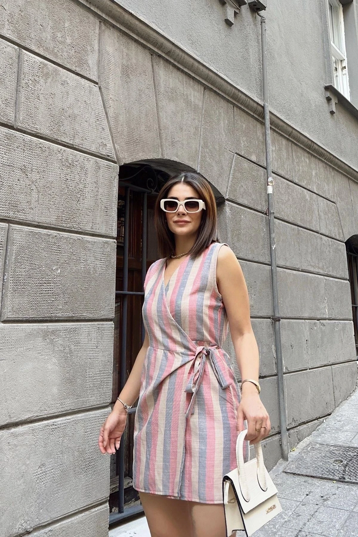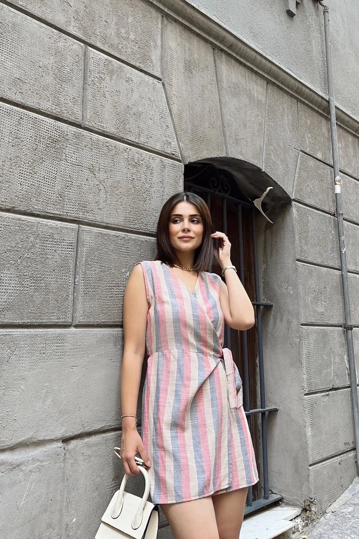 Laci & Kırmızı, Kolsuz, Keten, Kruvaze, Belden Bağlamalı, Elbise Görünümlü Şort Etekli Kısa Tulum
