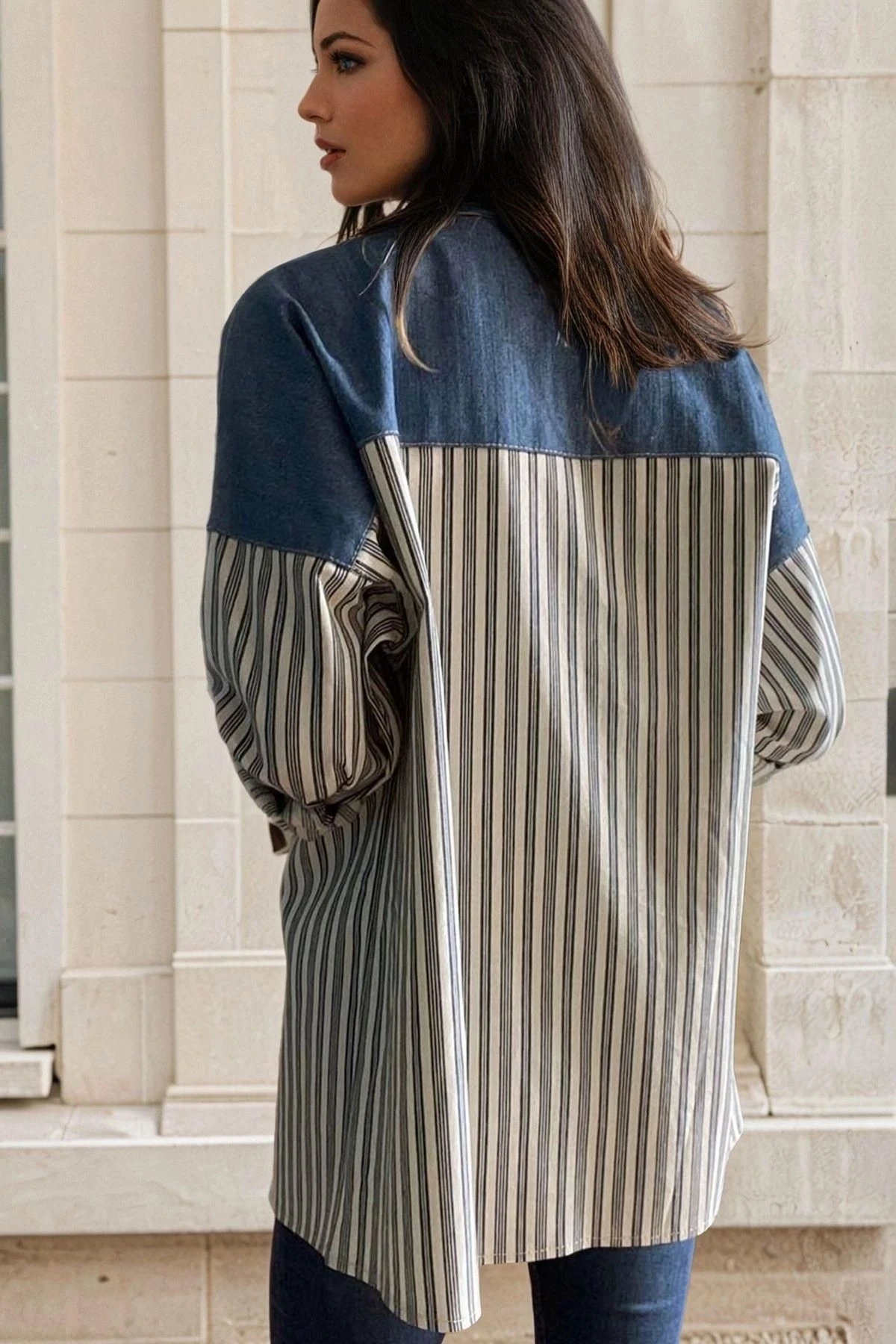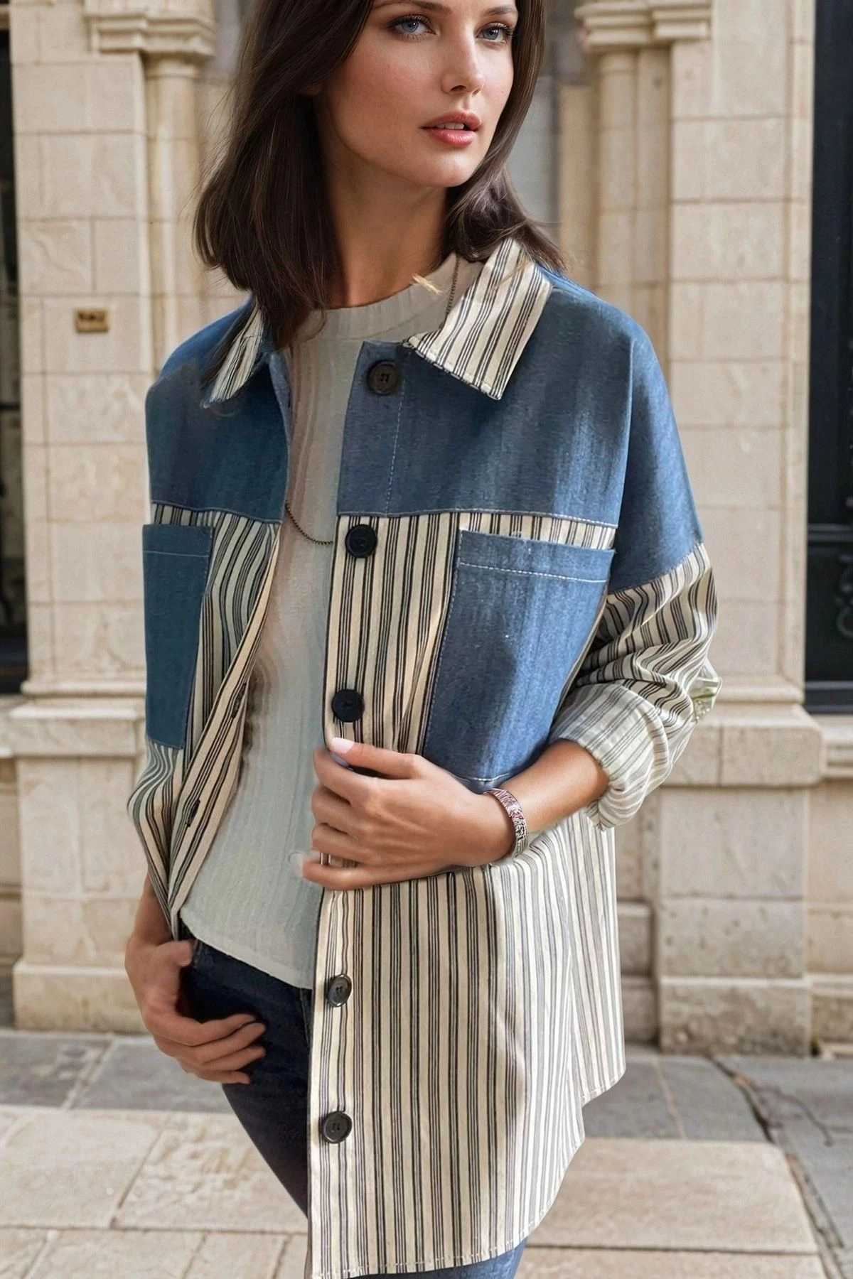 Lacivert Cep Detaylı, Çizgili, Blok Desenli Ceket Gömlek