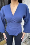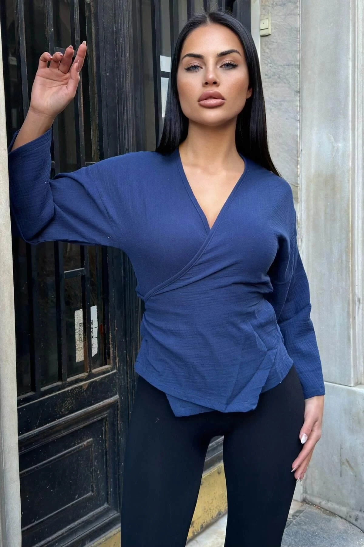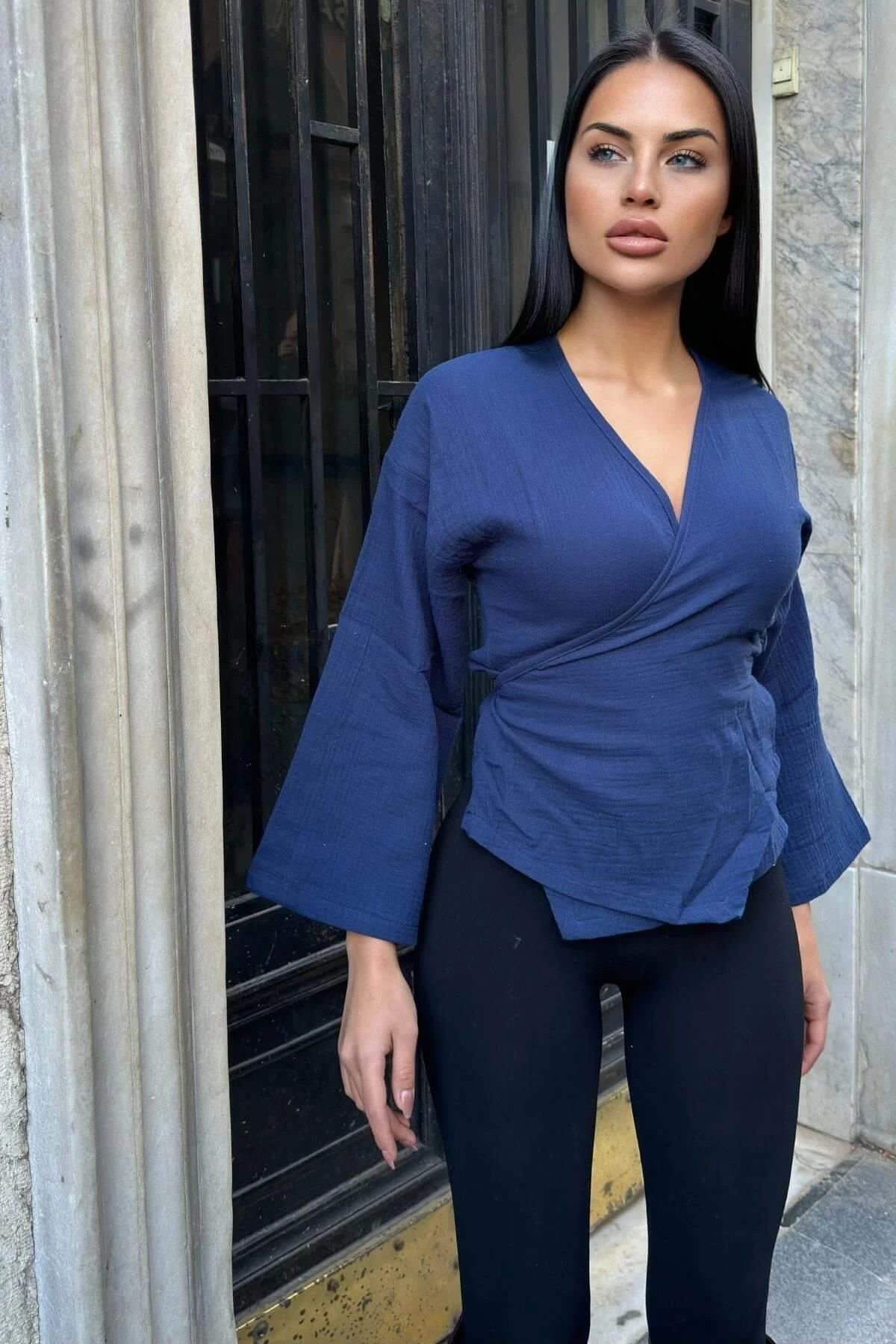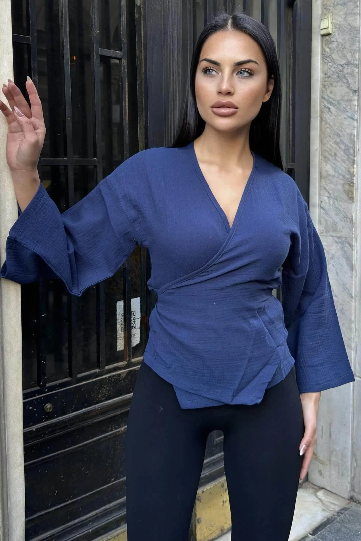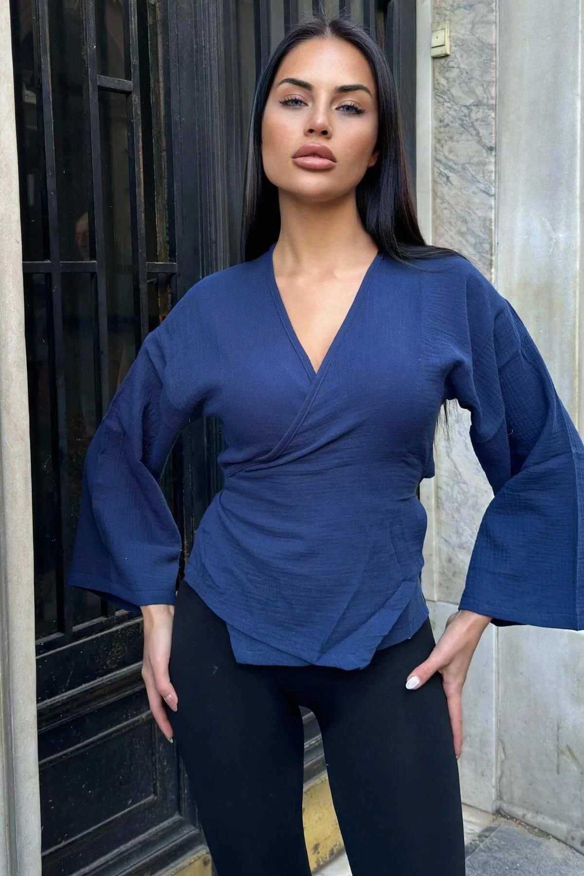 Lacivert Kruvaze Yaka, Çapraz Bağlamalı, Flare Kollu, Salaş Müslin Bluz