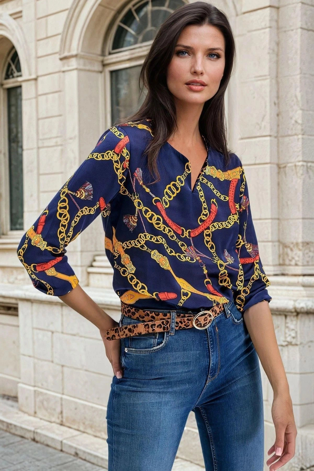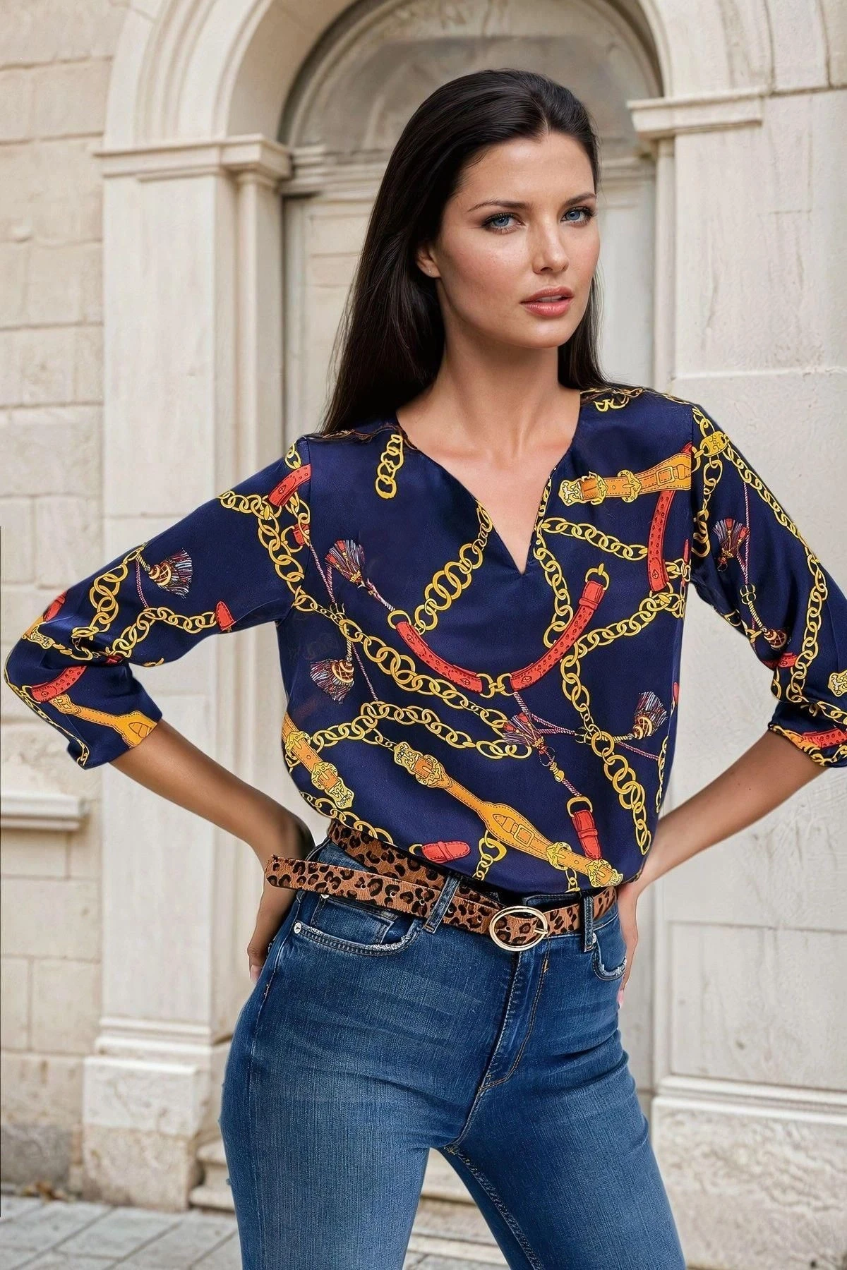 Lacivert V Yaka, Zincir Desenli, Uzun Kollu, Klasik Kesim Bluz