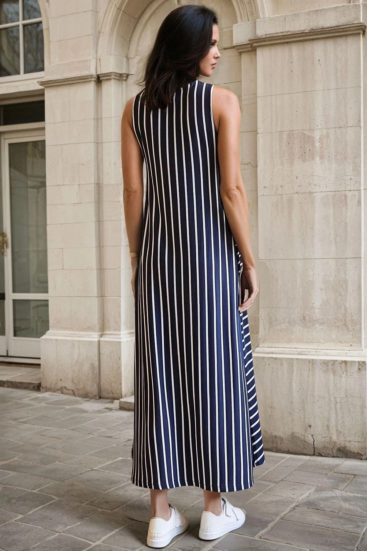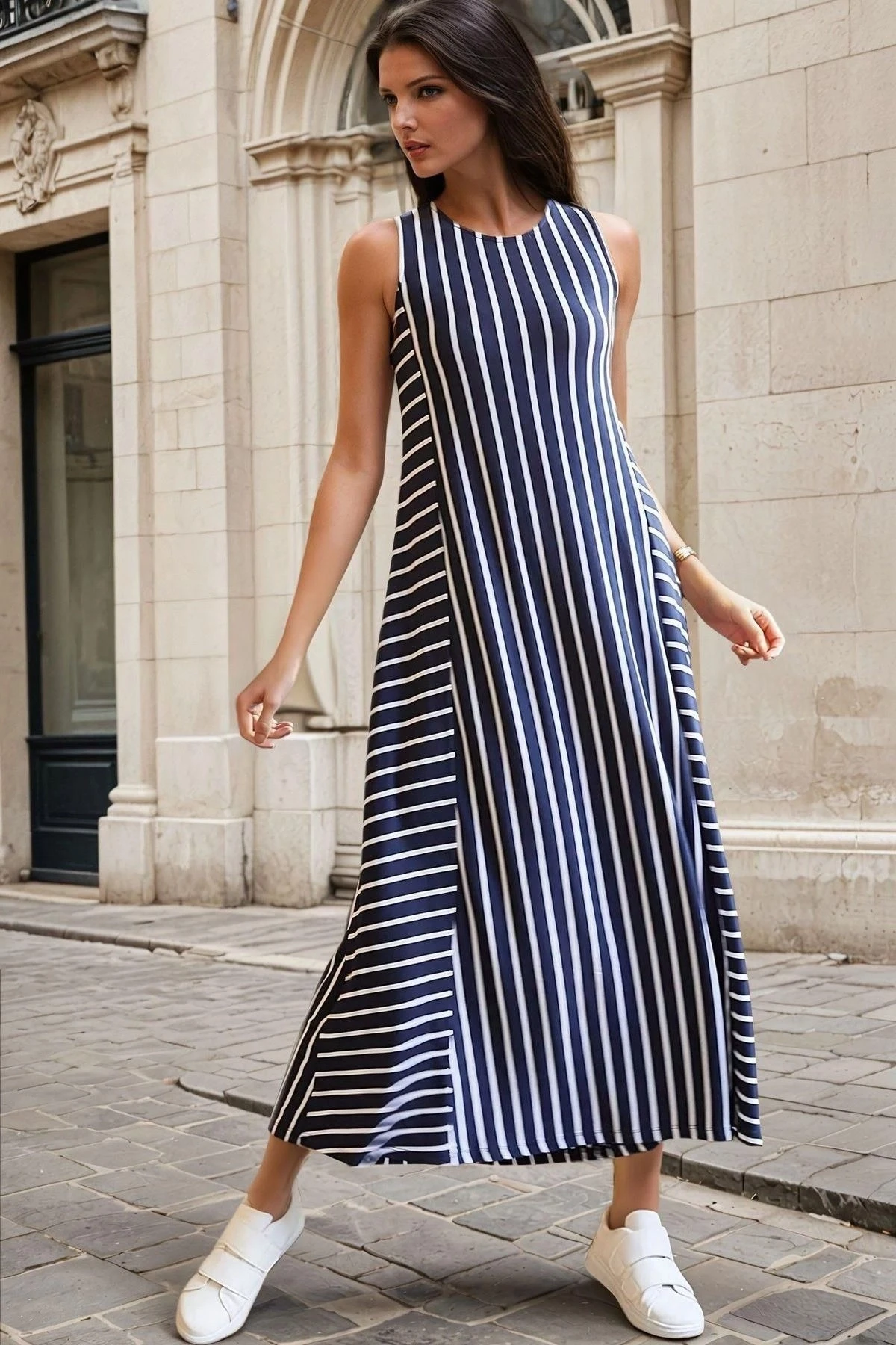 Lacivert Yuvarlak Yaka, Uzun Çizgili, Kolsuz, A Kesim Elbise