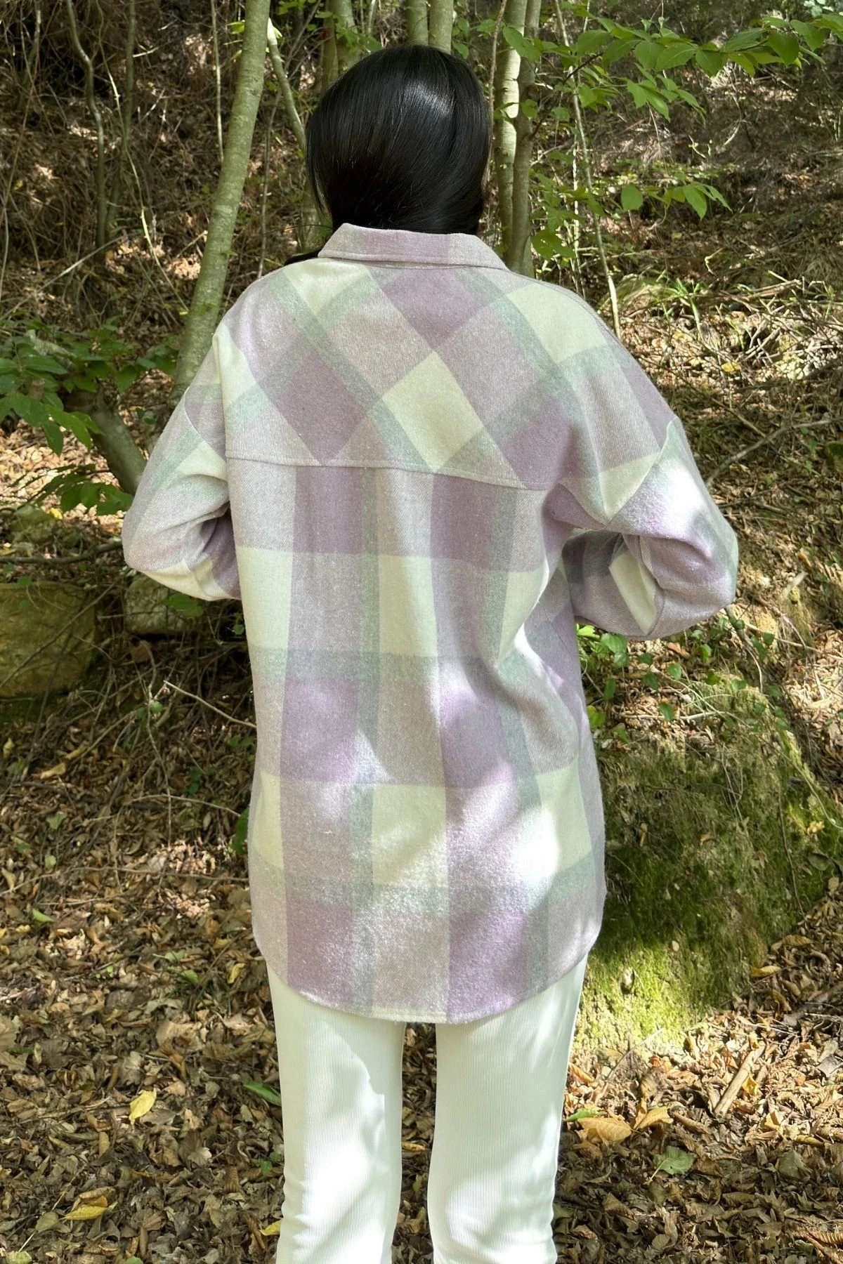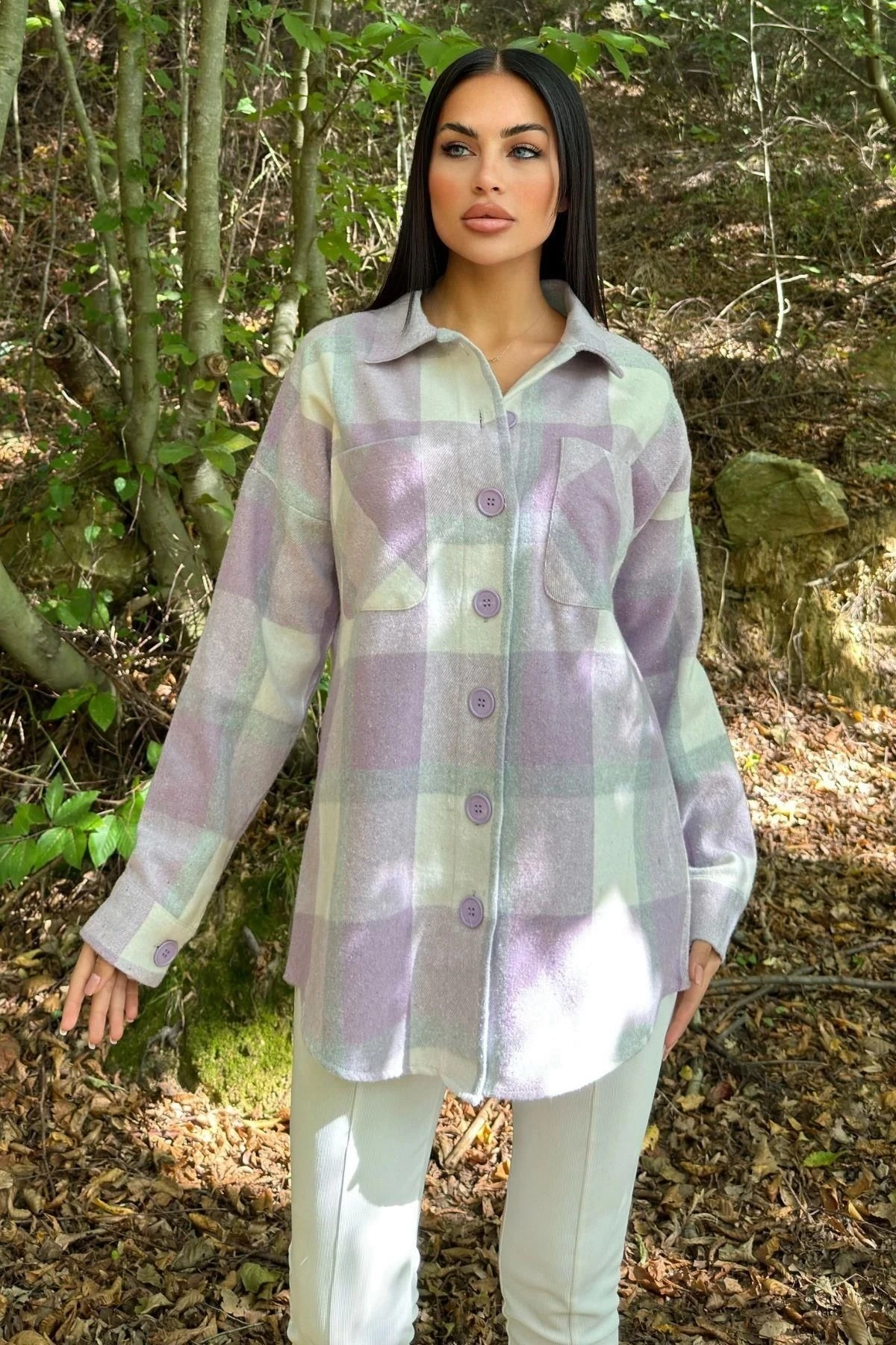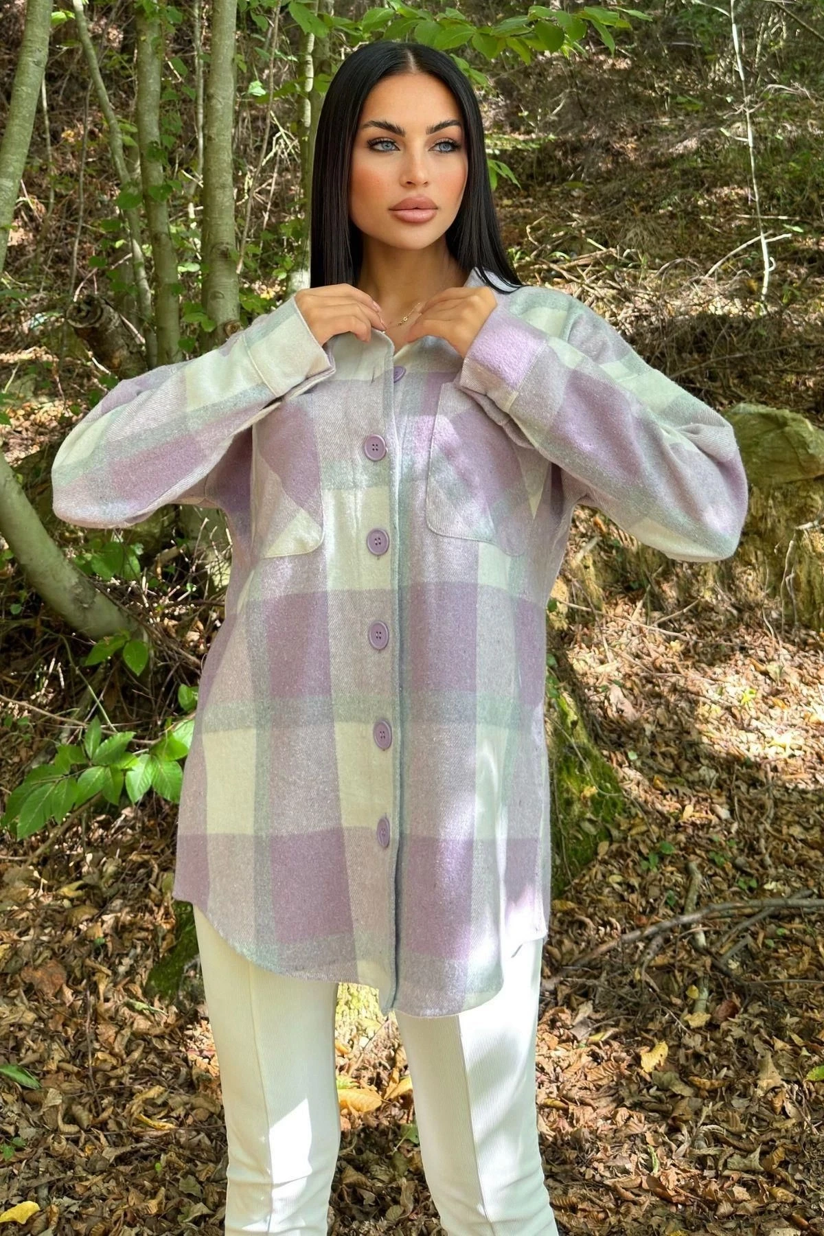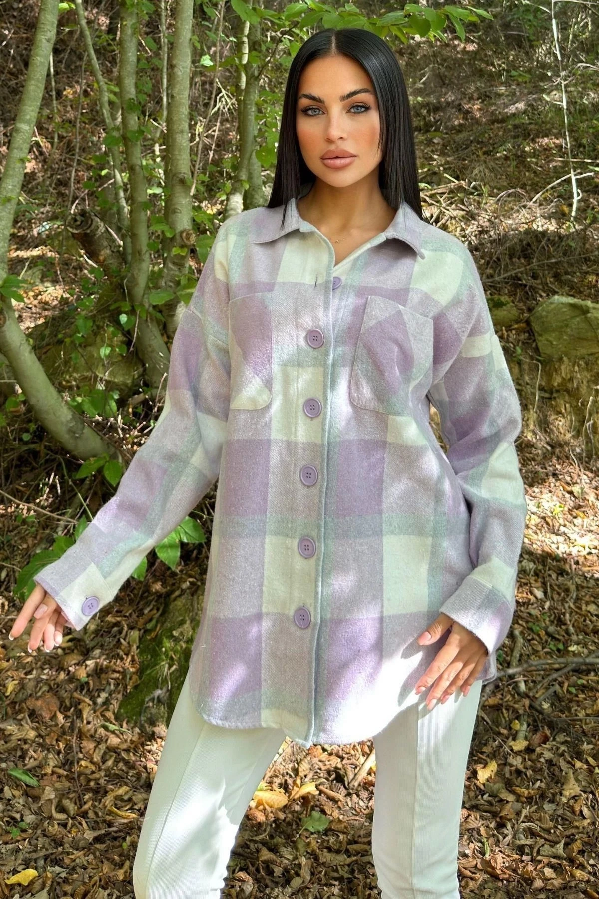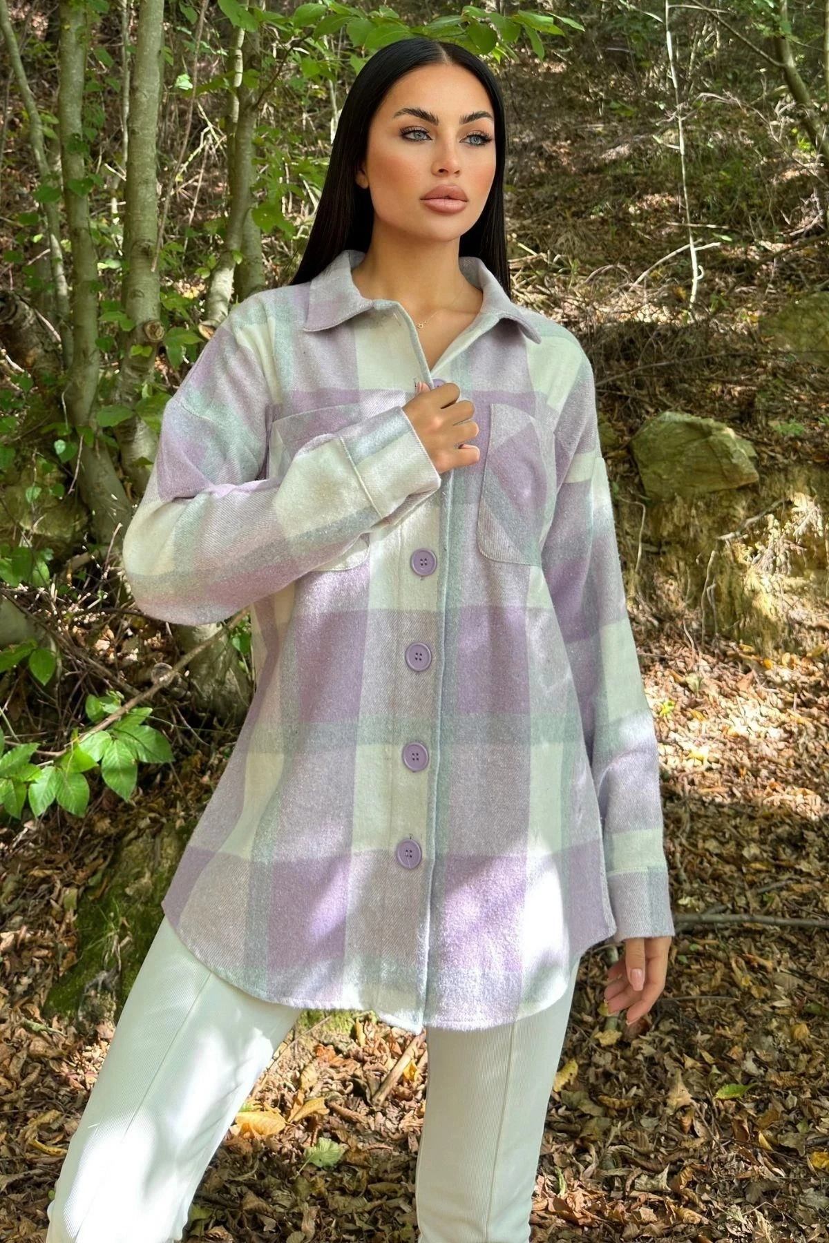 Lila Çift Cepli, Ekose Desenli, Rahat Kalıp, Salaş Kaşe Gömlek