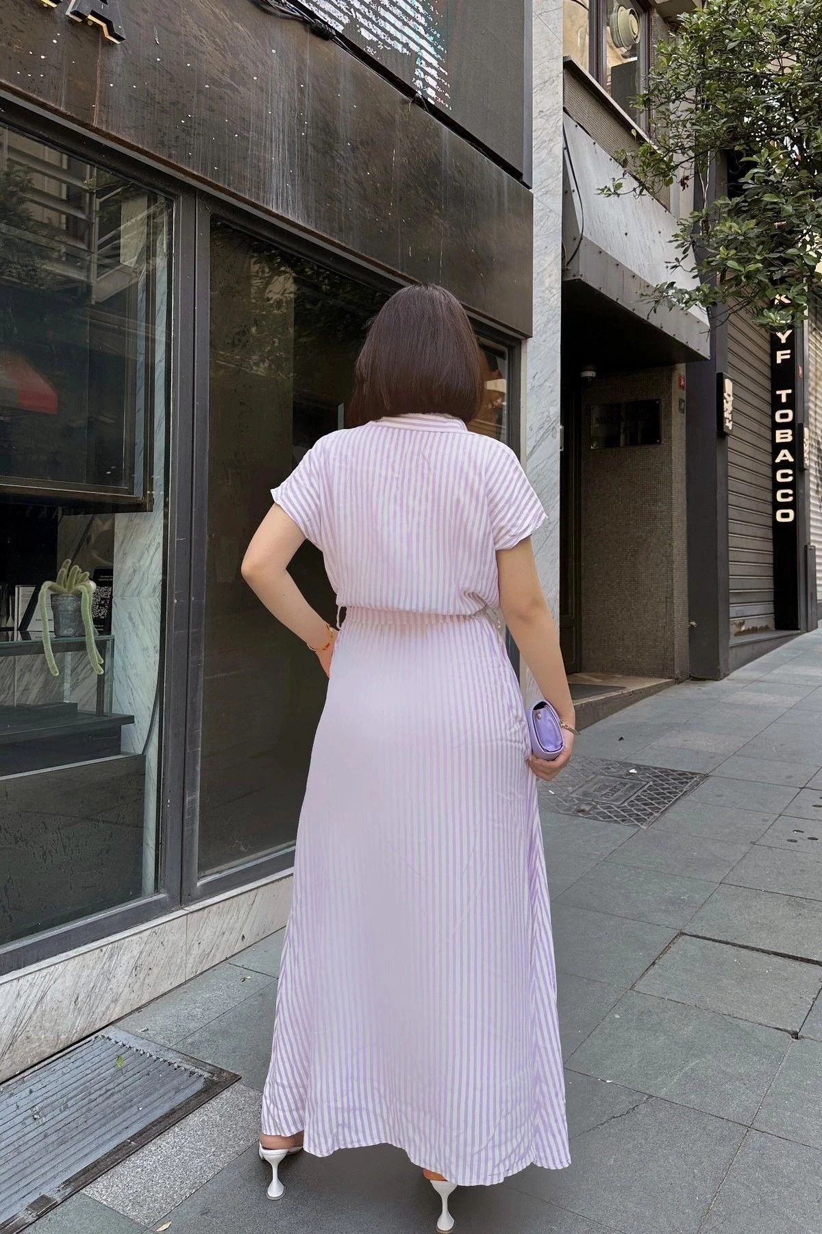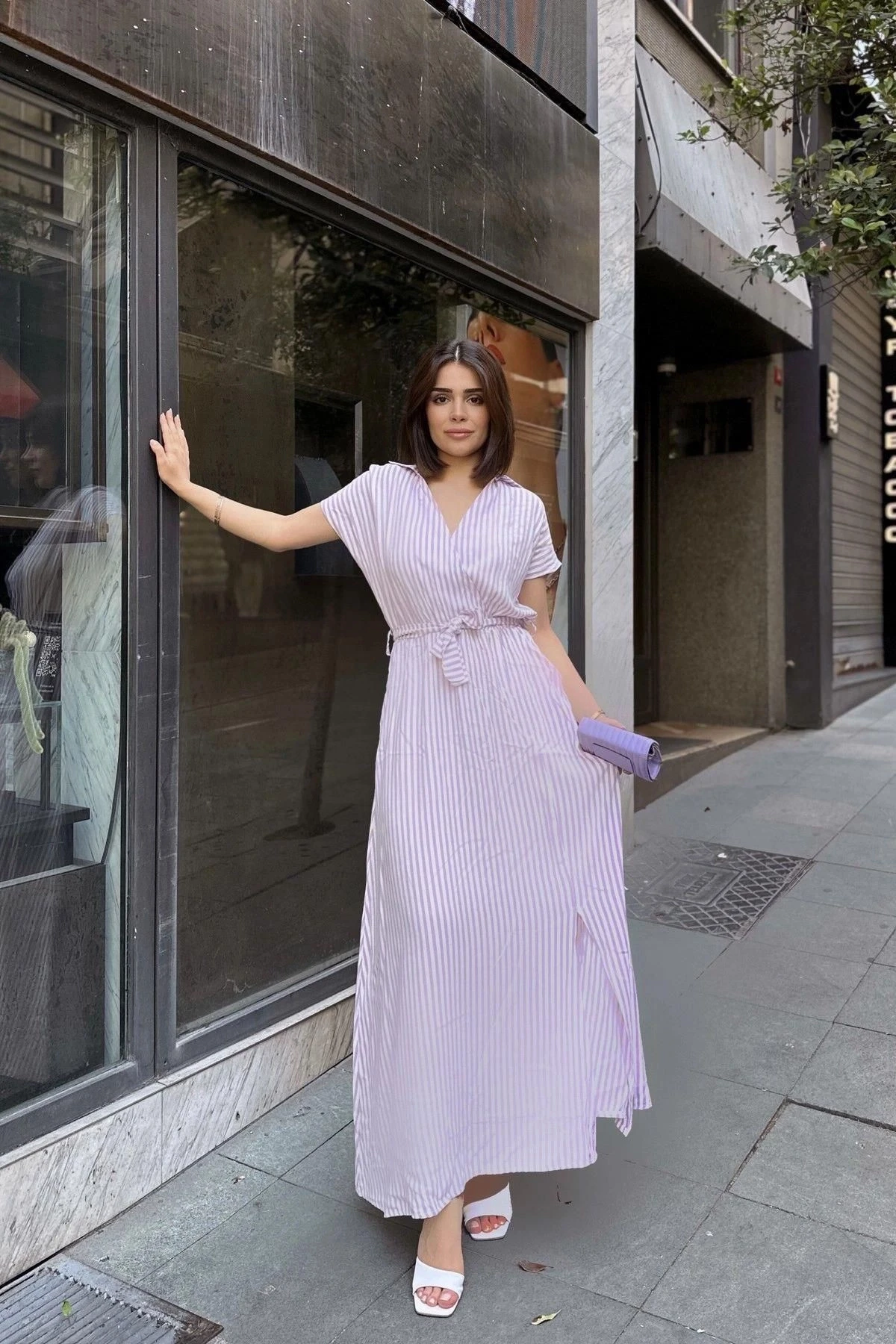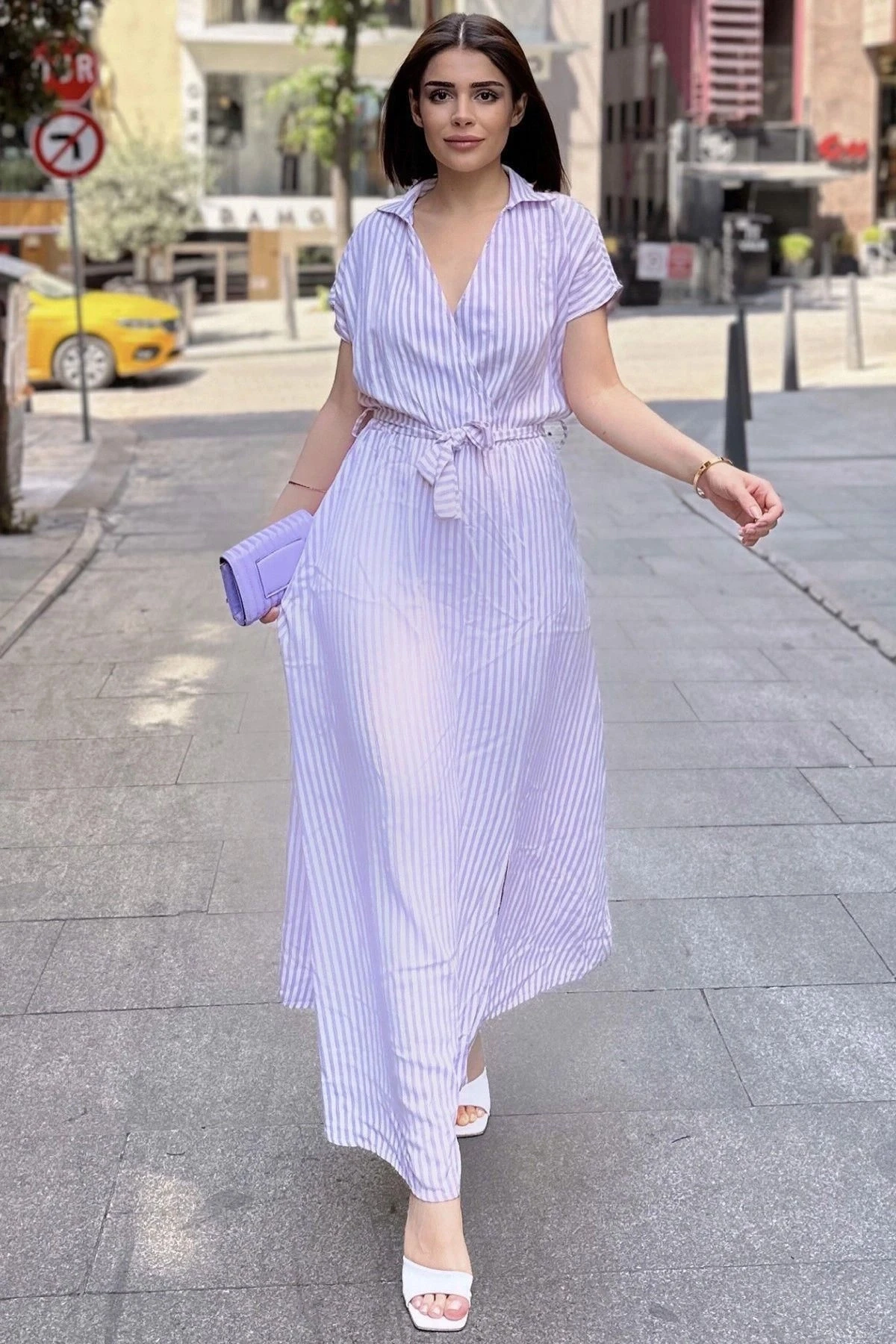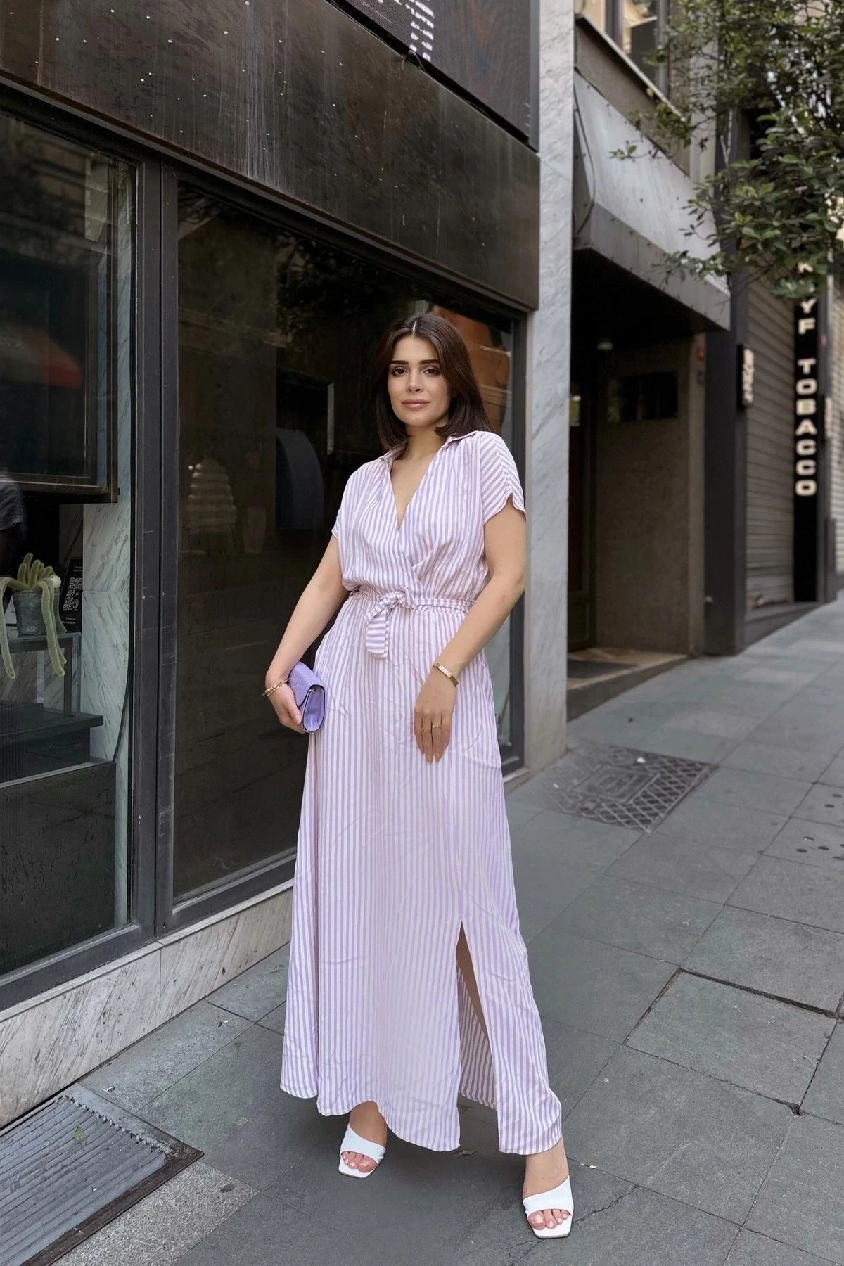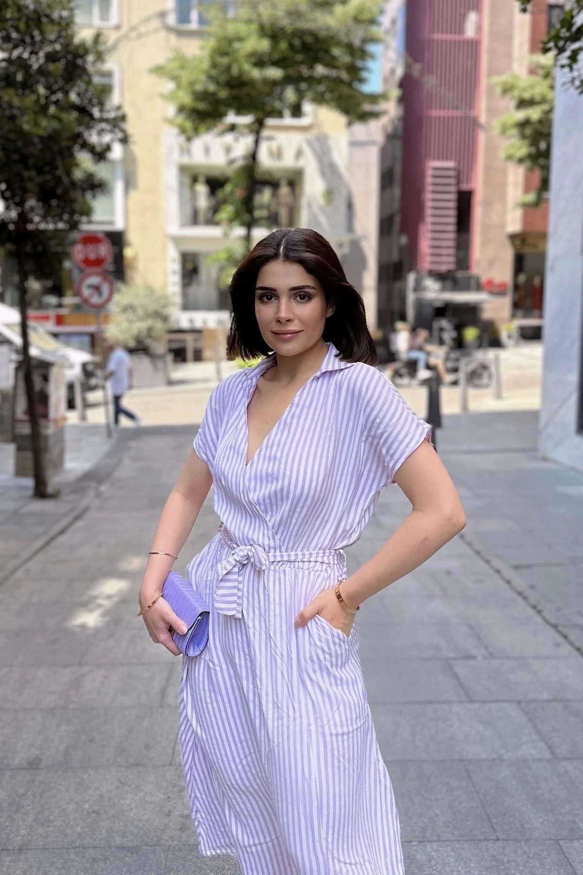 Bu Lila & Ekru Kruvaze Polo Yaka, Kısa Kol, Çizgili Yazlık Kumaş, Yırtmaçlı, Kemerli/Kuşaklı, Maxi Uzun Elbise, yaz mevsiminde hem şık hem de rahat bir stil sunar.; %60 pamuk ve %40 polyester karışımı kumaş, hem yumuşak hem de nefes alabilen bir yapıya sahiptir.; Elbisenin lila ve ekru çizgili deseni, feminen ve modern bir görünüm yaratırken, kruvaze polo yaka detayı şıklığı tamamlar.; Kısa kollu tasarımı, yaz aylarında serin ve konforlu bir giyim deneyimi sunar.; Yırtmaçlı kesimi, hareket özgürlüğünü artırırken aynı zamanda elbisenin şıklığını vurgular.; Kemerli veya kuşaklı kullanım seçeneği, beli vurgulayarak daha ince bir siluet oluşturmanıza yardımcı olur.; Maxi uzunluktaki elbise, zarif bir duruş sergilerken aynı zamanda rahatlık sunar.; Yazlık kumaşı, hafif ve havadar bir his verirken, %60 pamuk içeriği yumuşaklık sağlar.; %40 polyester ilavesi ise dayanıklılık ve kolay bakım özellikleri sunar.; Bu Lila & Ekru Kruvaze Polo Yaka, Kısa Kol, Çizgili Yazlık Kumaş, Yırtmaçlı, Kemerli/Kuşaklı, Maxi Uzun Elbise, yaz sezonunda stilinizi tamamlamak için mükemmel bir seçenektir.; Şıklık, rahatlık ve modern tasarımı bir arada sunan bu elbise, tatil, plaj veya şehir içi geziler gibi çeşitli etkinliklerde giyebileceğiniz çok yönlü bir parçadır.; Yaz stilinizi yansıtmak ve kendinizi özgür hissetmek için bu elbiseyi tercih edebilirsiniz.