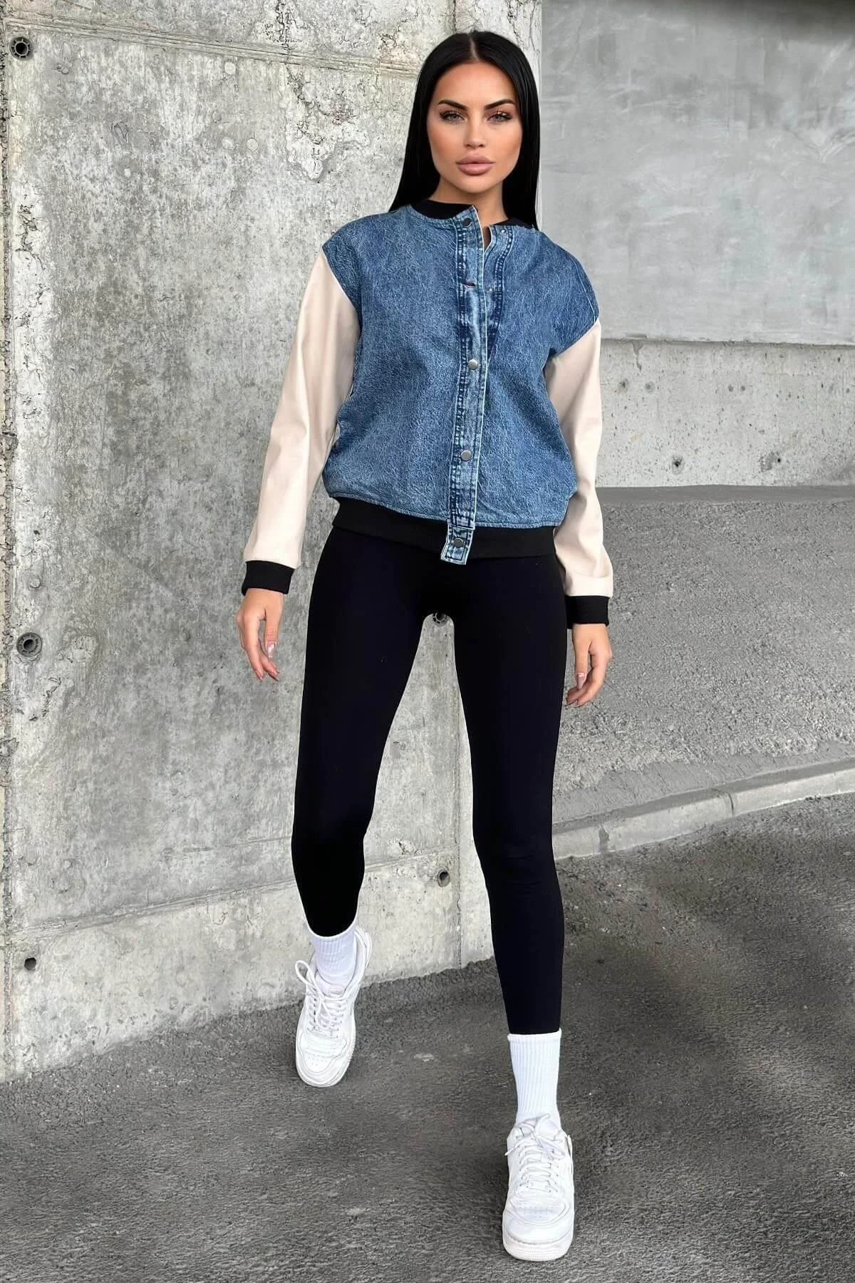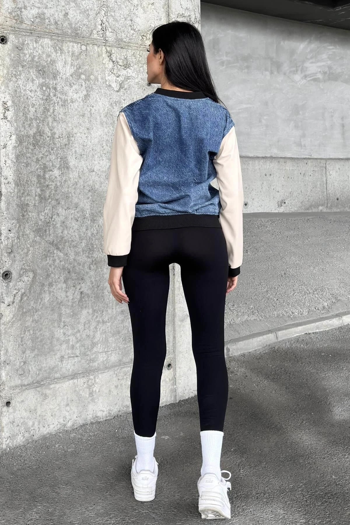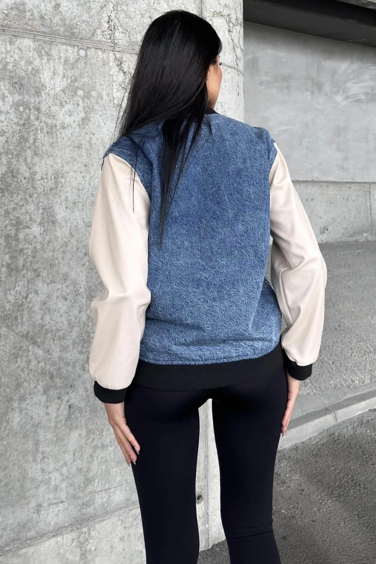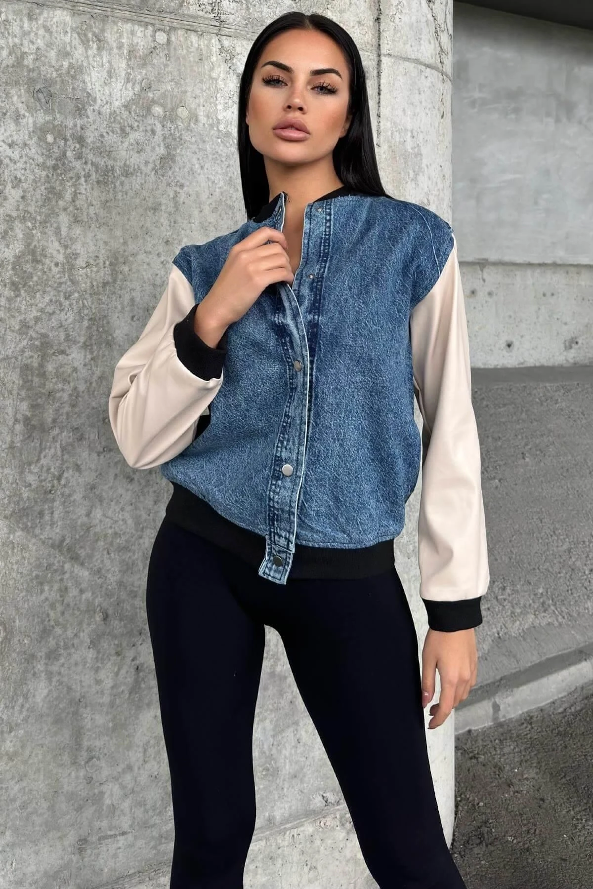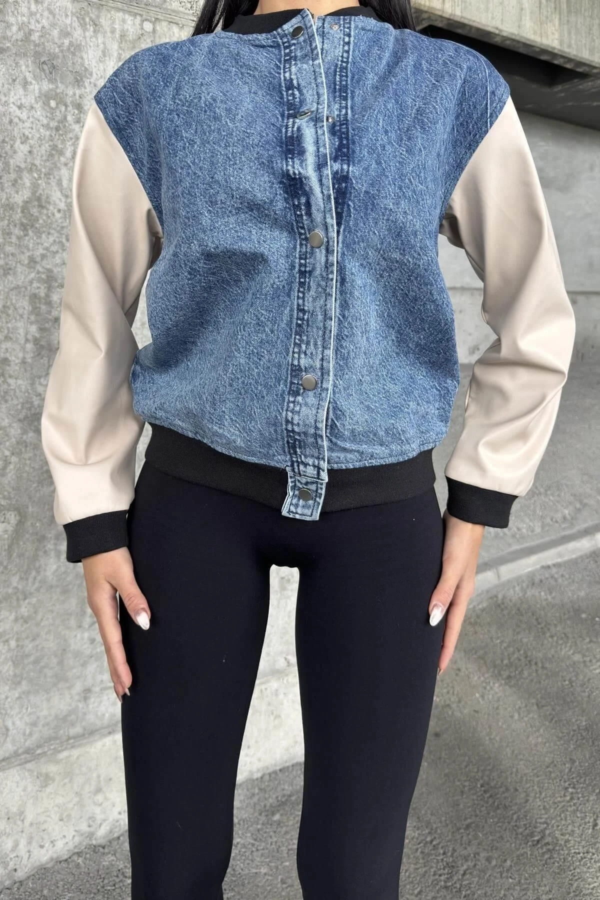 Mavi Denim Kolları Deri Ve Lastik Detaylı, Çıtçıtlı, Renk Bloklu, Bomber Kot Ceket