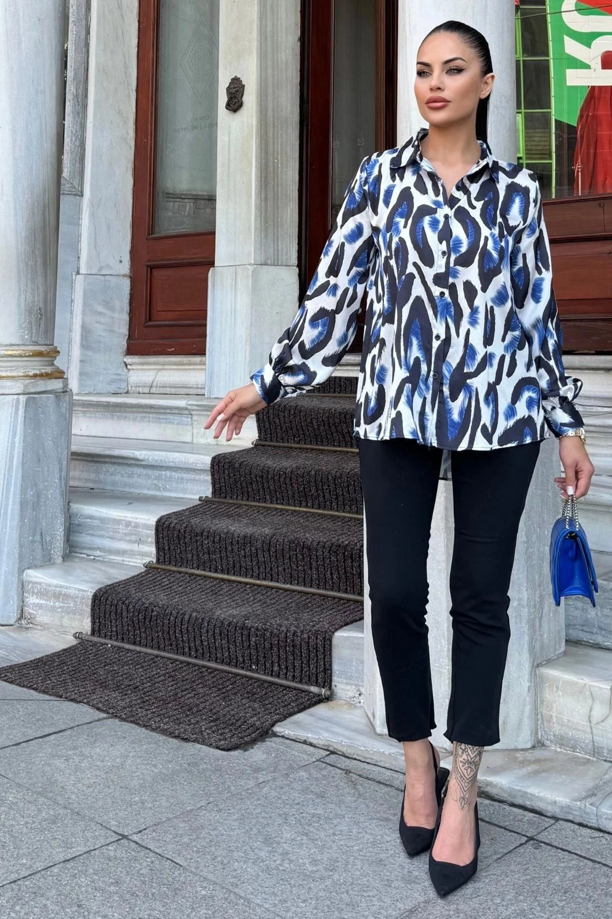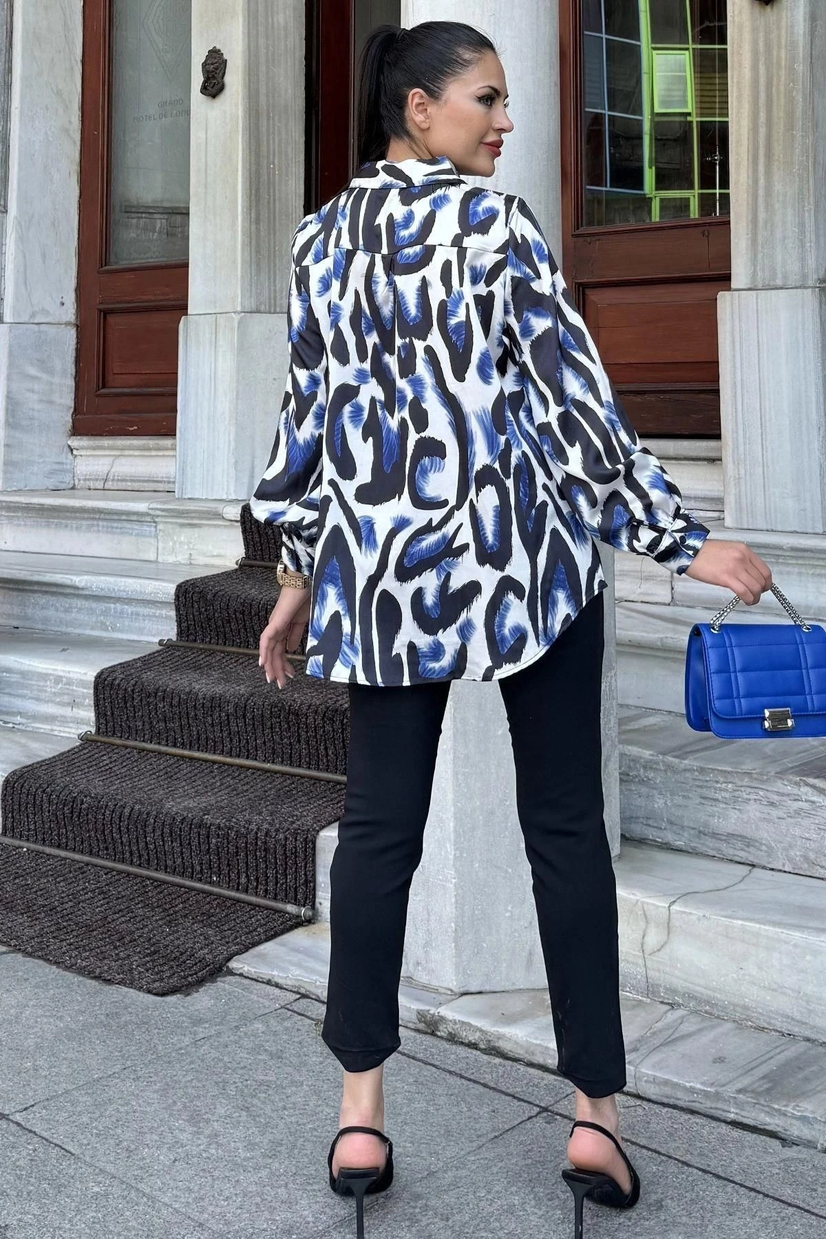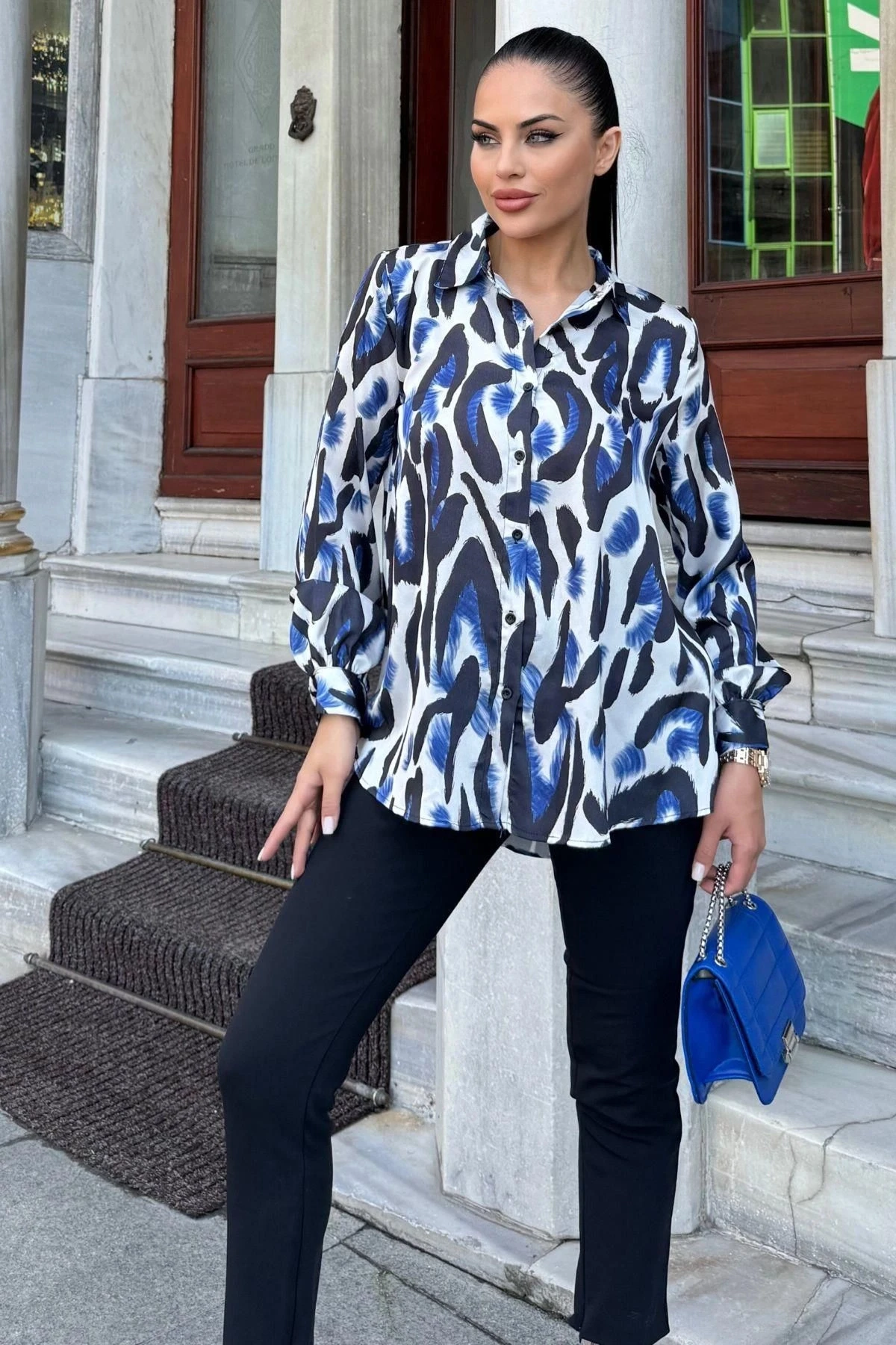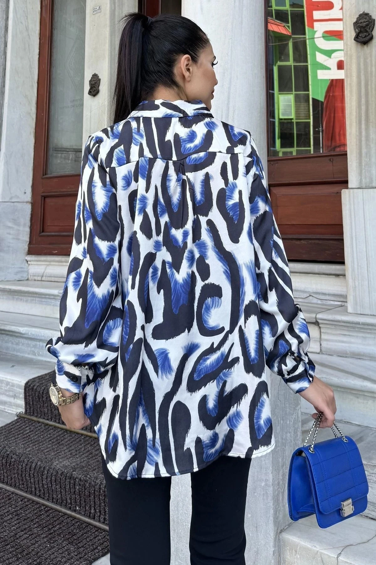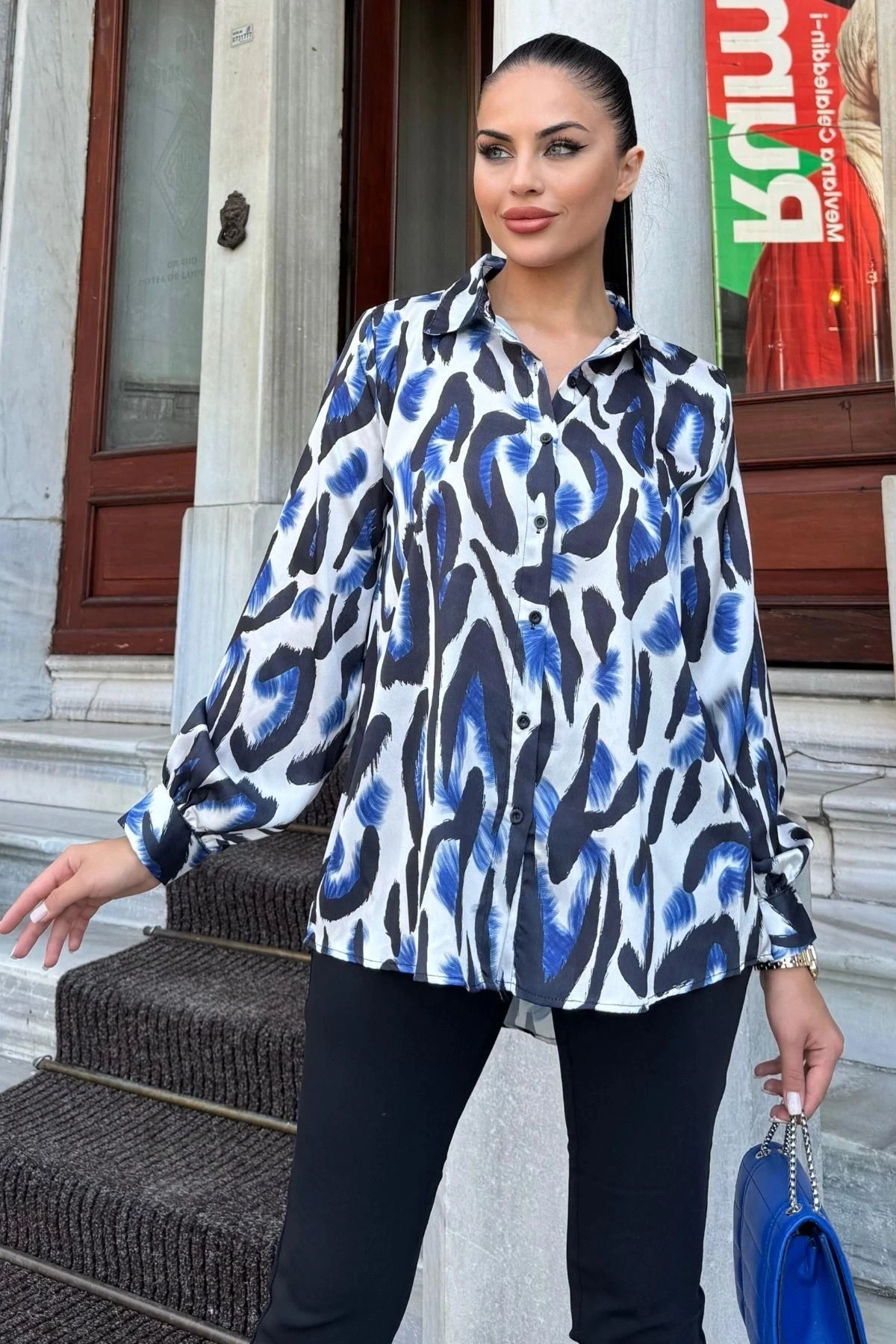 Mavi Desenli Salaş Saten Gömlek