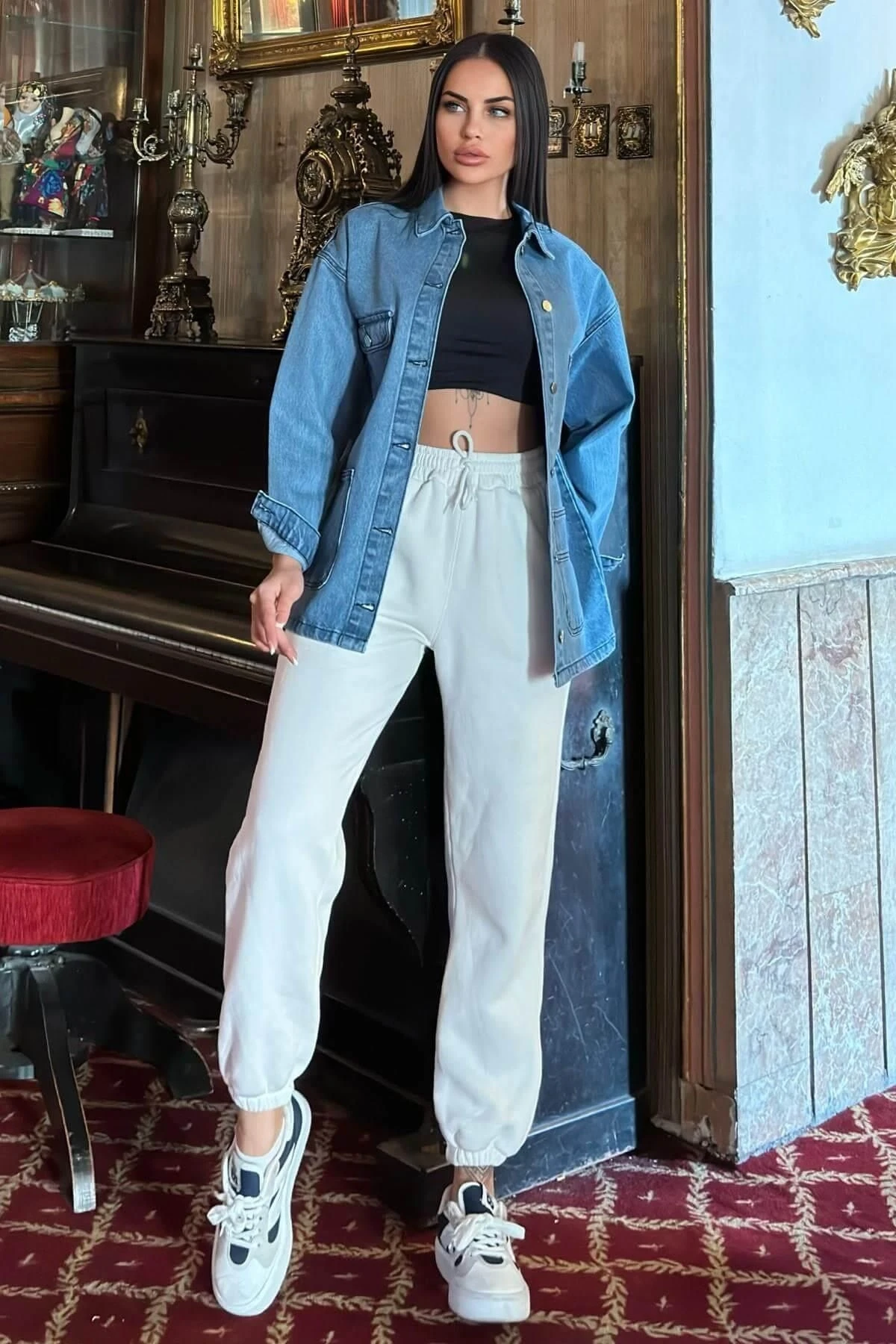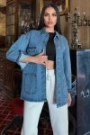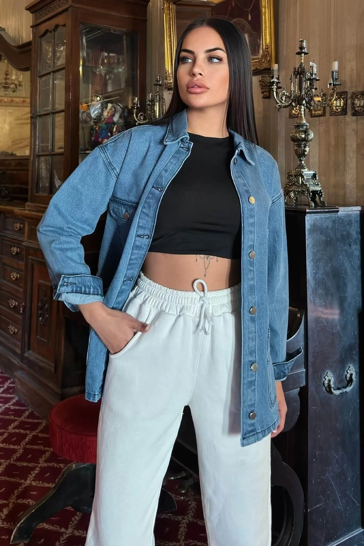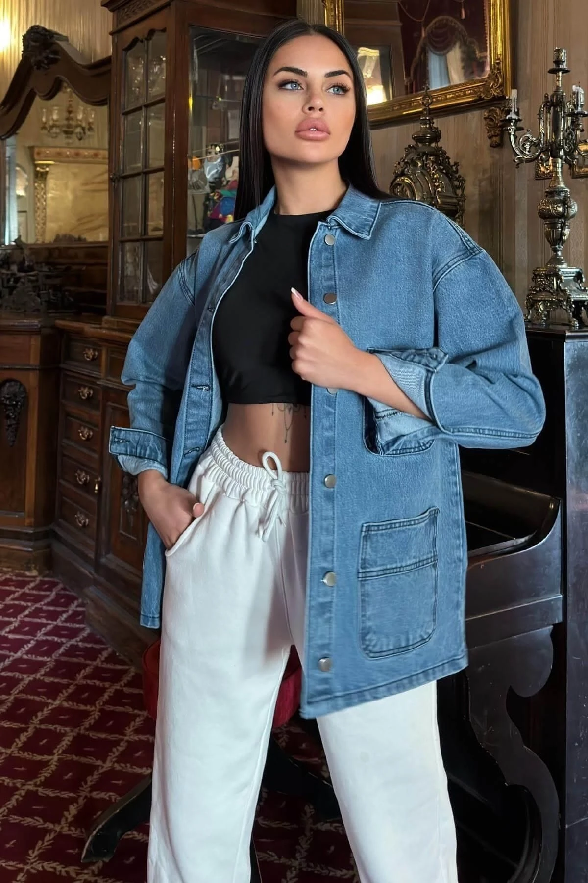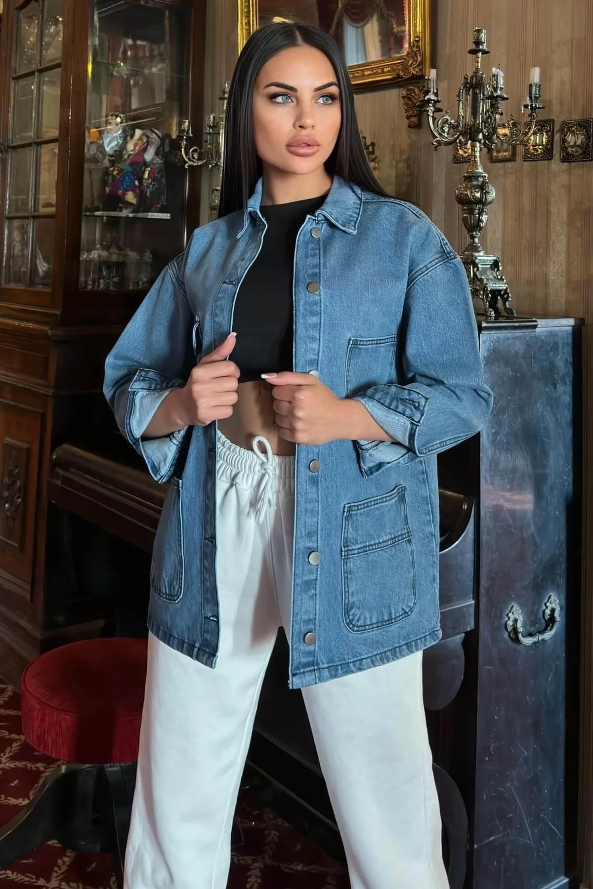 Mavi Geniş Cepli, Düğme Detaylı, Oversize Kot Ceket Gömlek