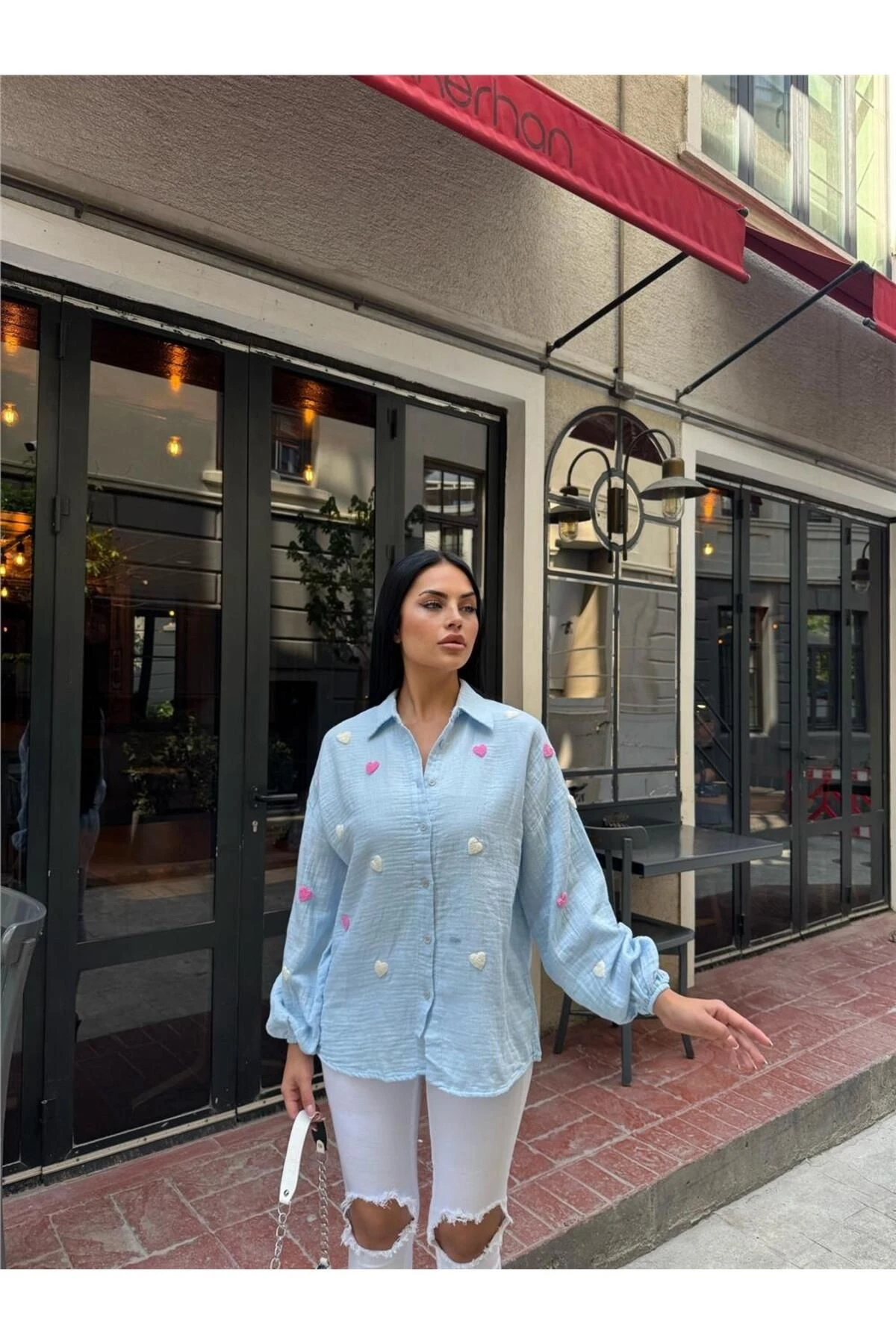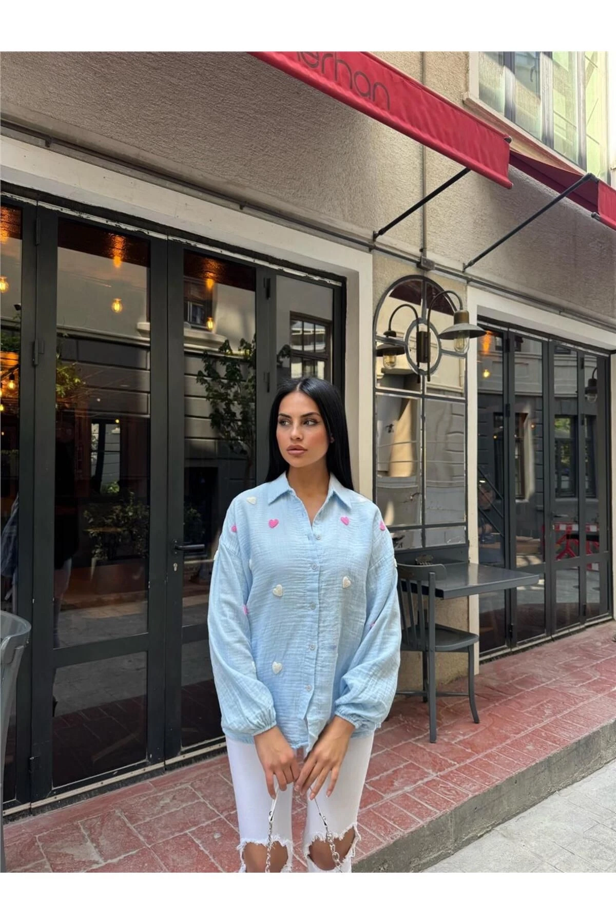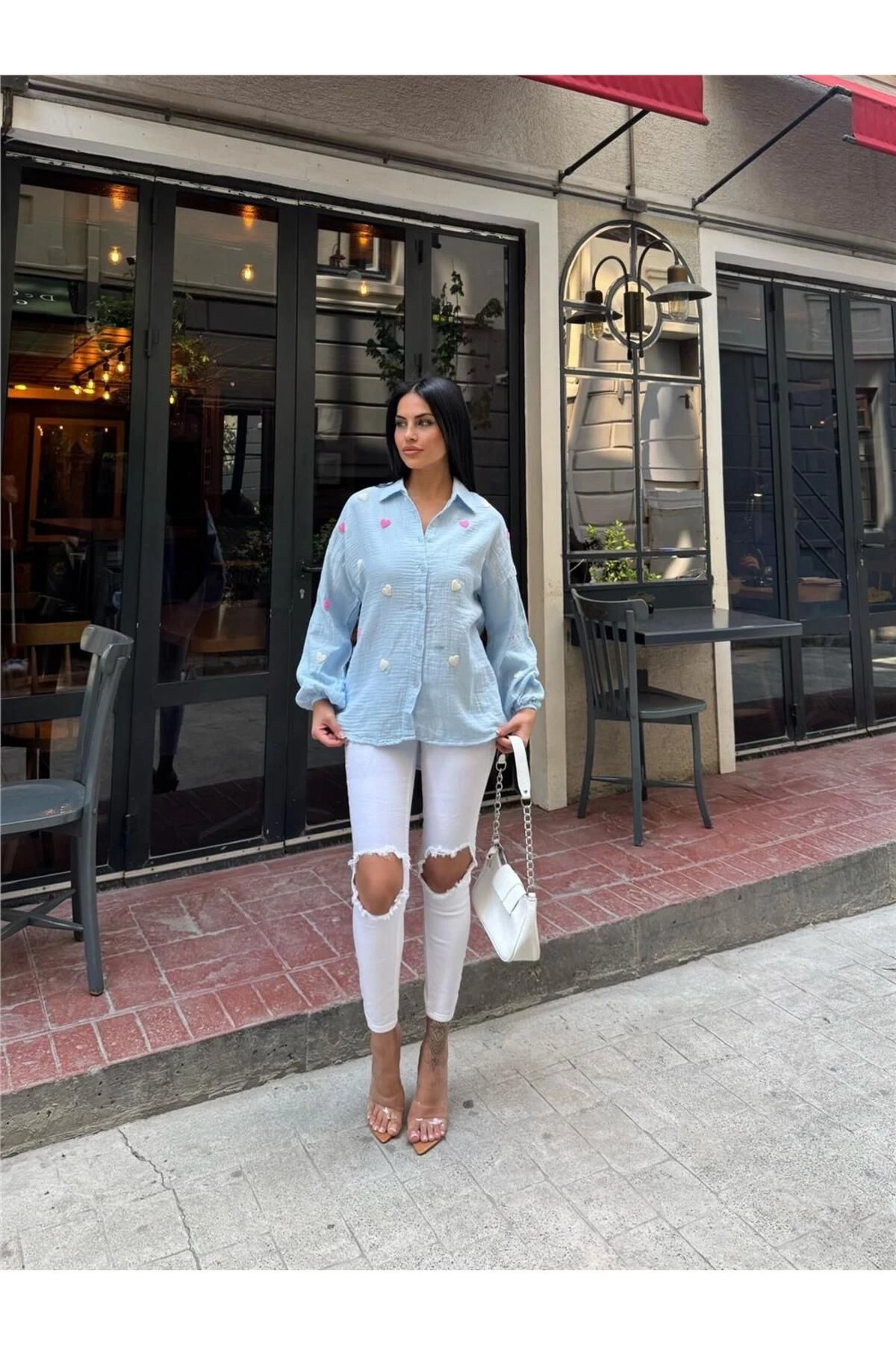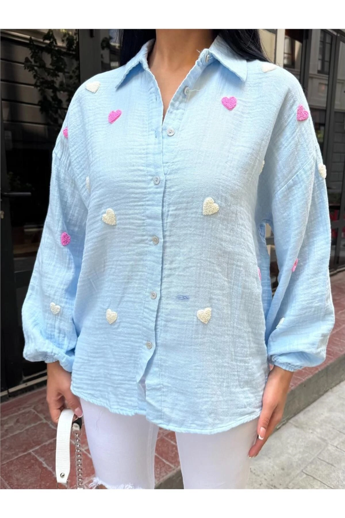 Mavi Kalp Nakışlı Viskon Gömlek