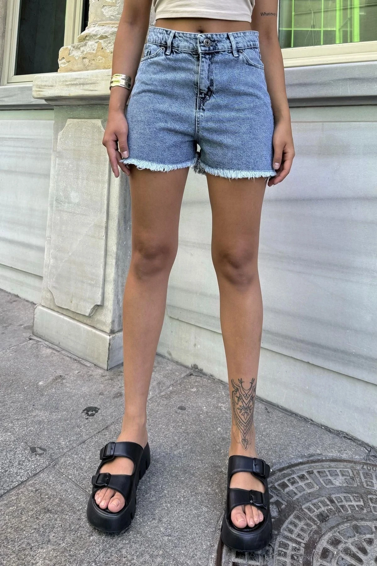 Mavi Yüksek Bel Rahat Denim Şort