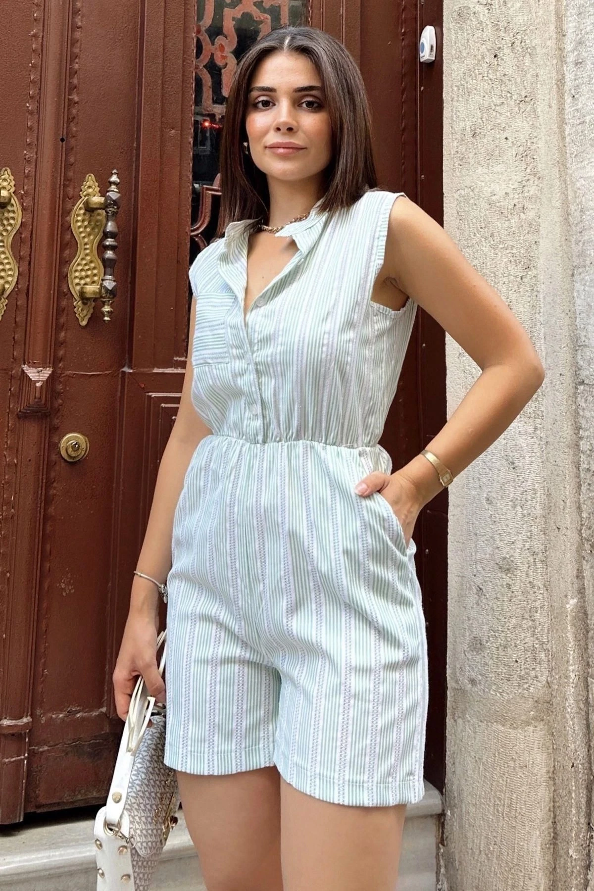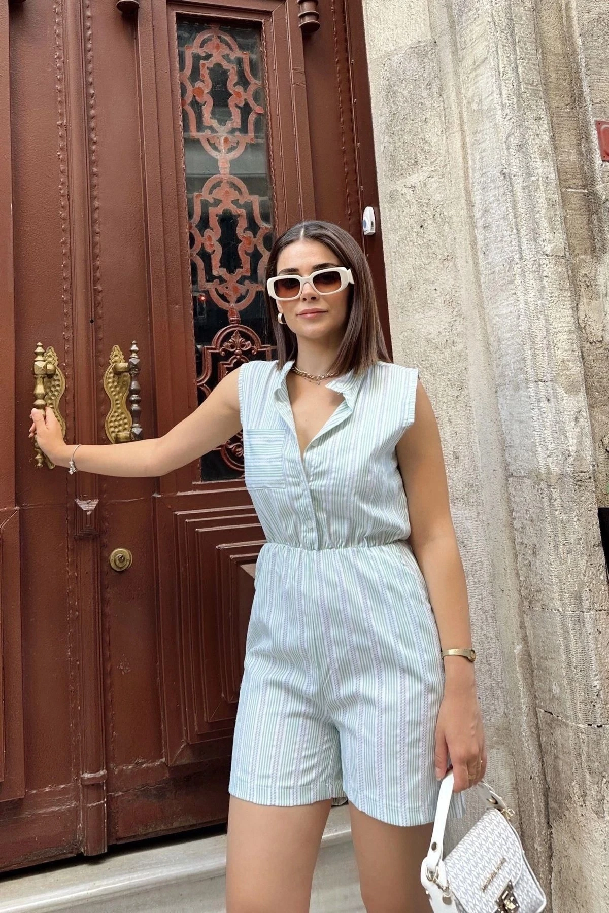 Mint Kolsuz, Kaliteli Kumaş Düğmeli Hakim Yaka, Belden Lastikli, Cepli, Şort Modelli Kısa Çizgili Tulum ile enerjik ve şık bir tarzı yakalayın! Bu tulum, dinamik çizgili tasarımı ve rahat kesimi ile hem özgünlüğü hem de rahatlığı bir araya getiriyor.; Özellikle sıcak günlerde serin ve stil sahibi olmanızı sağlıyor.; Mint rengi, tulumun ferah ve canlı bir hava kazanmasını sağlarken kolsuz tasarımı da serin bir giyim deneyimi sunuyor.; Kaliteli polyester ve cotton kumaş karışımı, tulumun yumuşaklığını ve dayanıklılığını artırarak uzun süreli kullanım sağlıyor.; Düğmeli hakim yaka detayı, tulumun şıklığını ve tarzını öne çıkarırken belden lastikli tasarım da belinizi vurgulayarak hoş bir siluet oluşturmanızı sağlıyor.; Şort Modelli tasarım, hem rahatlık hem de zarafeti bir araya getirirken cepli detay da kullanışlılık sunuyor.; Çizgili tasarım, tulumun enerjik ve özgün bir hava kazanmasını sağlıyor.; Hem gündüz hem de gece kombinlerinizde rahatlıkla kullanabileceğiniz bu tulum, özel tasarımıyla modern bir görünüm sunuyor.; %60 polyester ve %40 cotton karışımından üretilen kumaş, tulumun hafifliği ve yumuşaklığı ile öne çıkıyor.; Hem dayanıklılığını hem de konforunu bir araya getiren bu kumaş, tulumunuzun uzun süreli kullanımını destekliyor.; Uzunluğu 80 cm olan bu tulum, hem rahatlığı hem de şıklığı bir araya getirerek modern bir görünüm sunuyor.; Mint Kolsuz, Kaliteli Kumaş Düğmeli Hakim Yaka, Belden Lastikli, Cepli, Şort Modelli Kısa Çizgili Tulum ile stilinizi tamamlayın.; Hem enerjik hem de şık bir tarz oluşturmak isteyenler için ideal bir seçenek! Özgün ve canlı bir görünüm elde etmek için mükemmel bir tercih!
