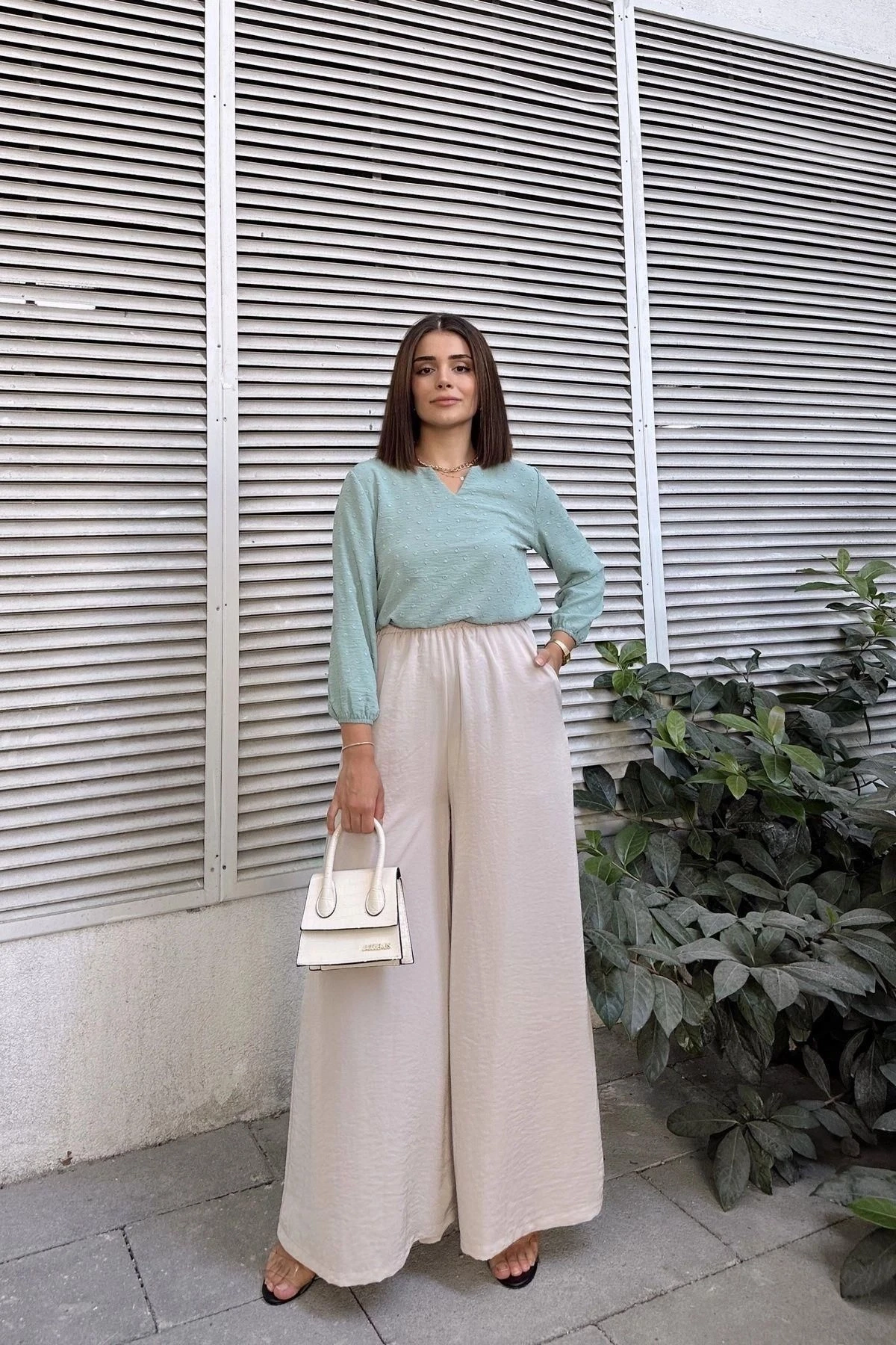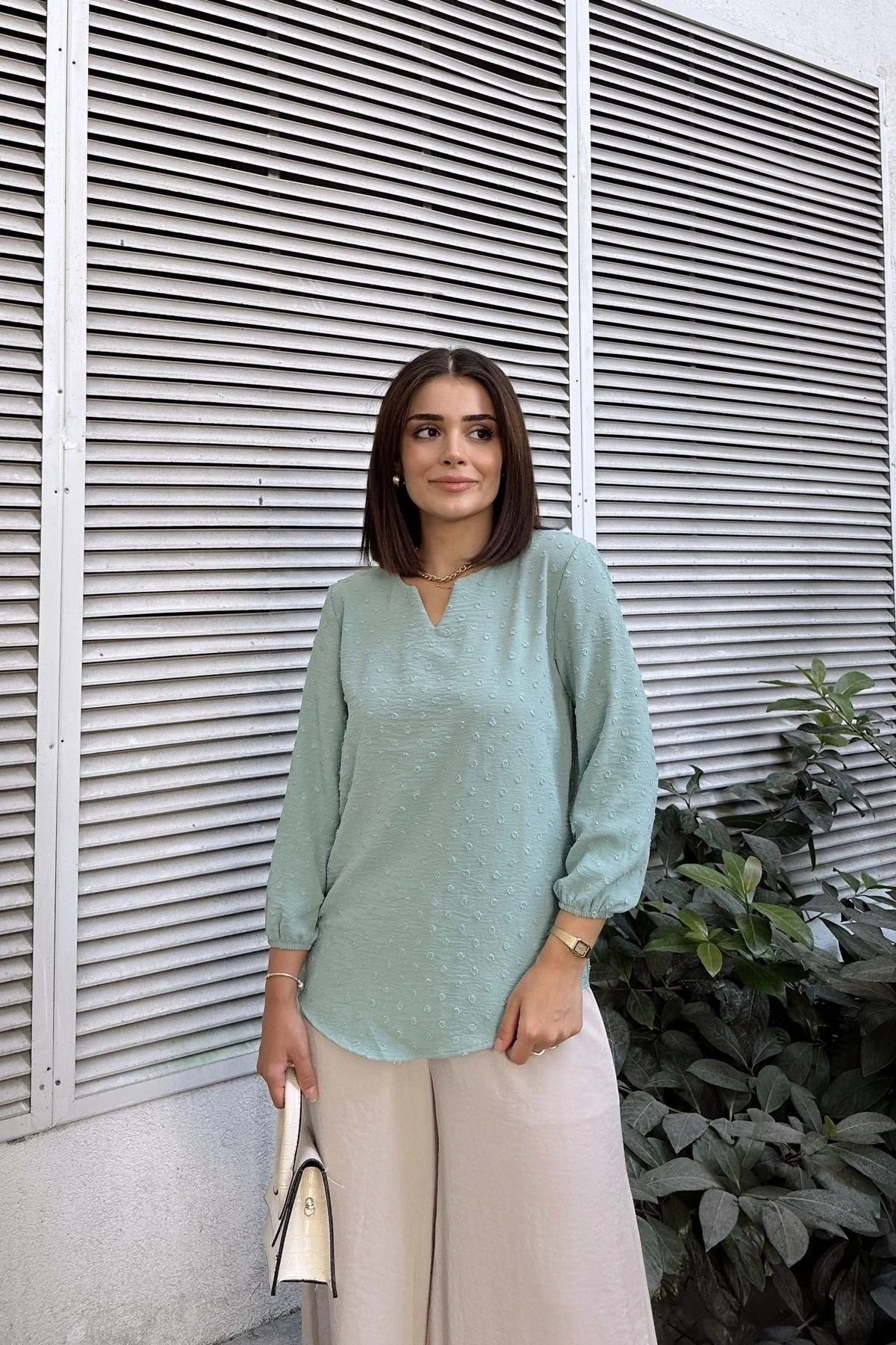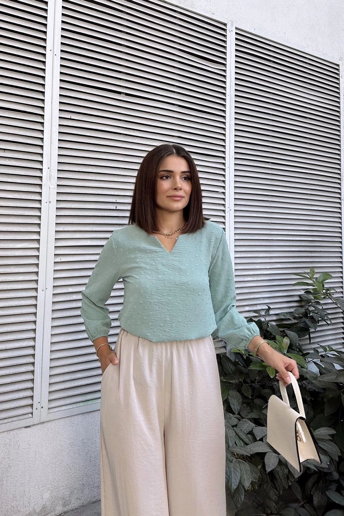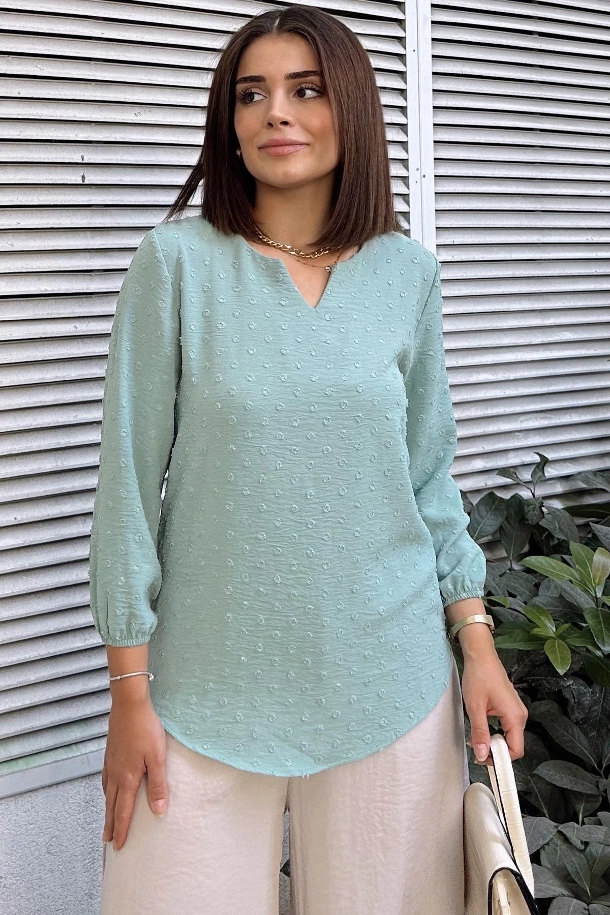 Mint Uzun Truvakar Kol, Öpücük Yaka, Ponponlu Kumaş Basic Kesim Bluz - Tesettüre Uygun