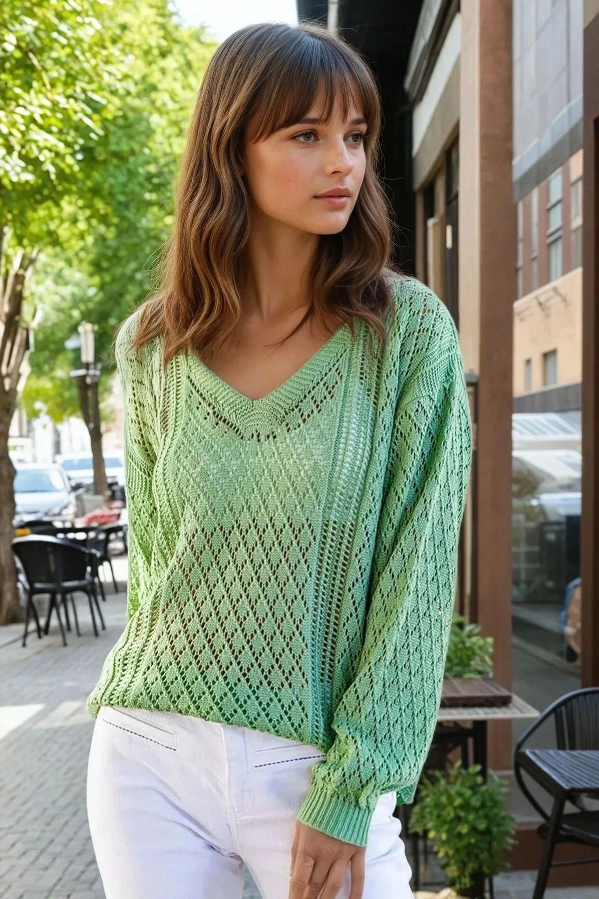 Mint Yeşil Derin V Yaka, Ajurlu Salaş Triko Kazak