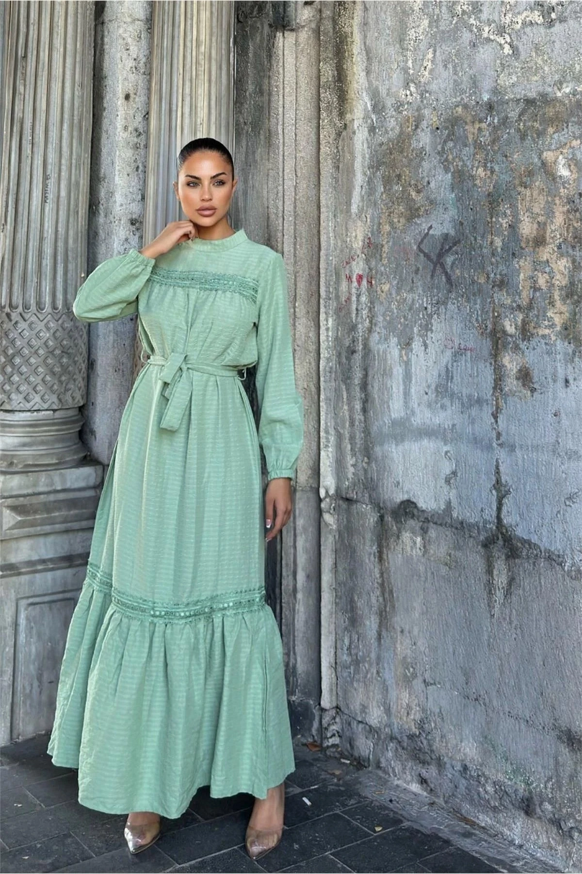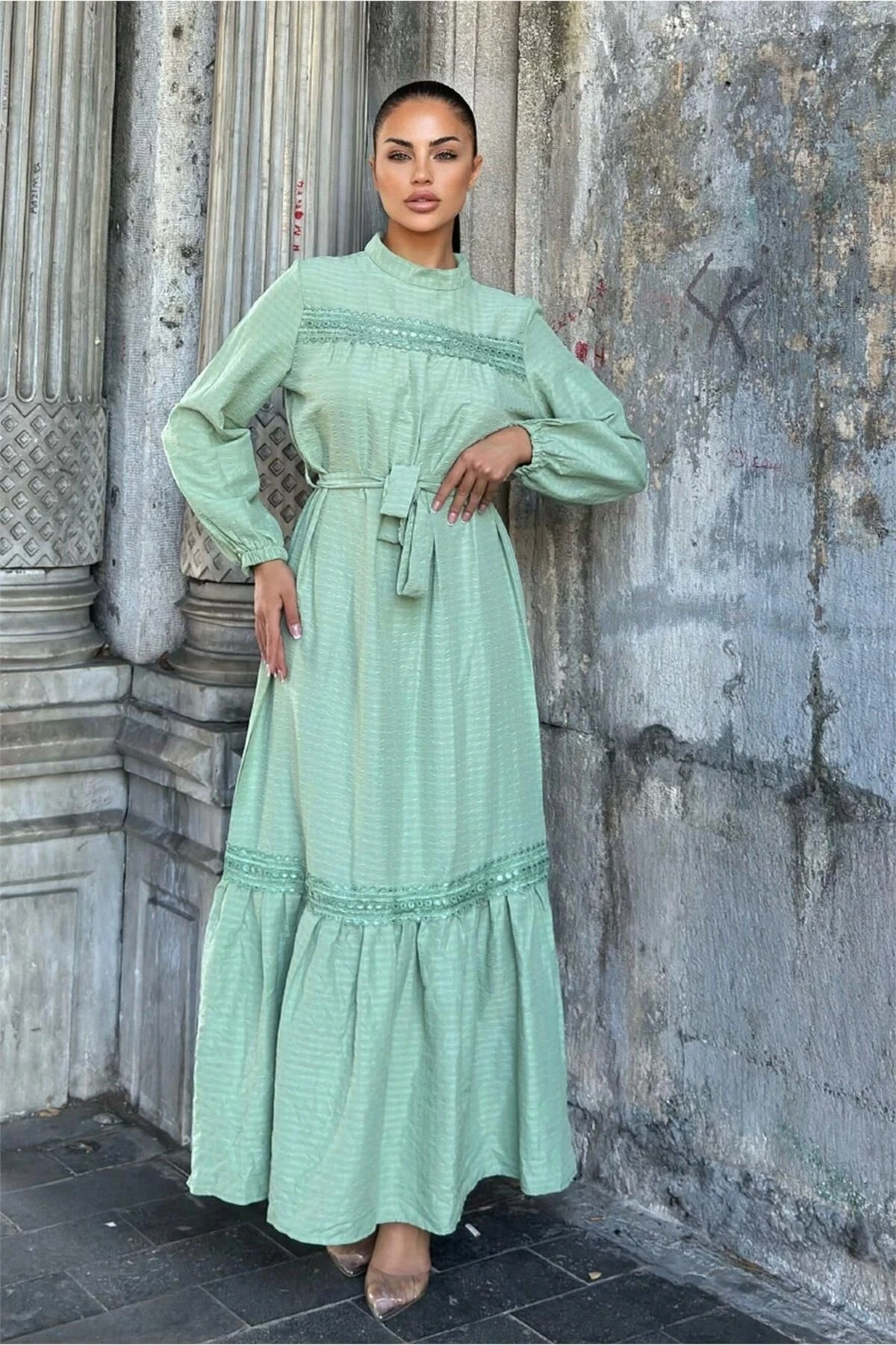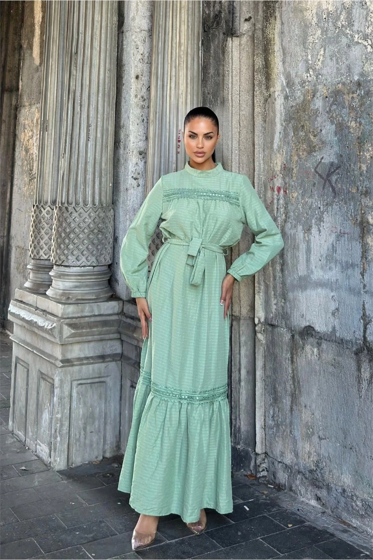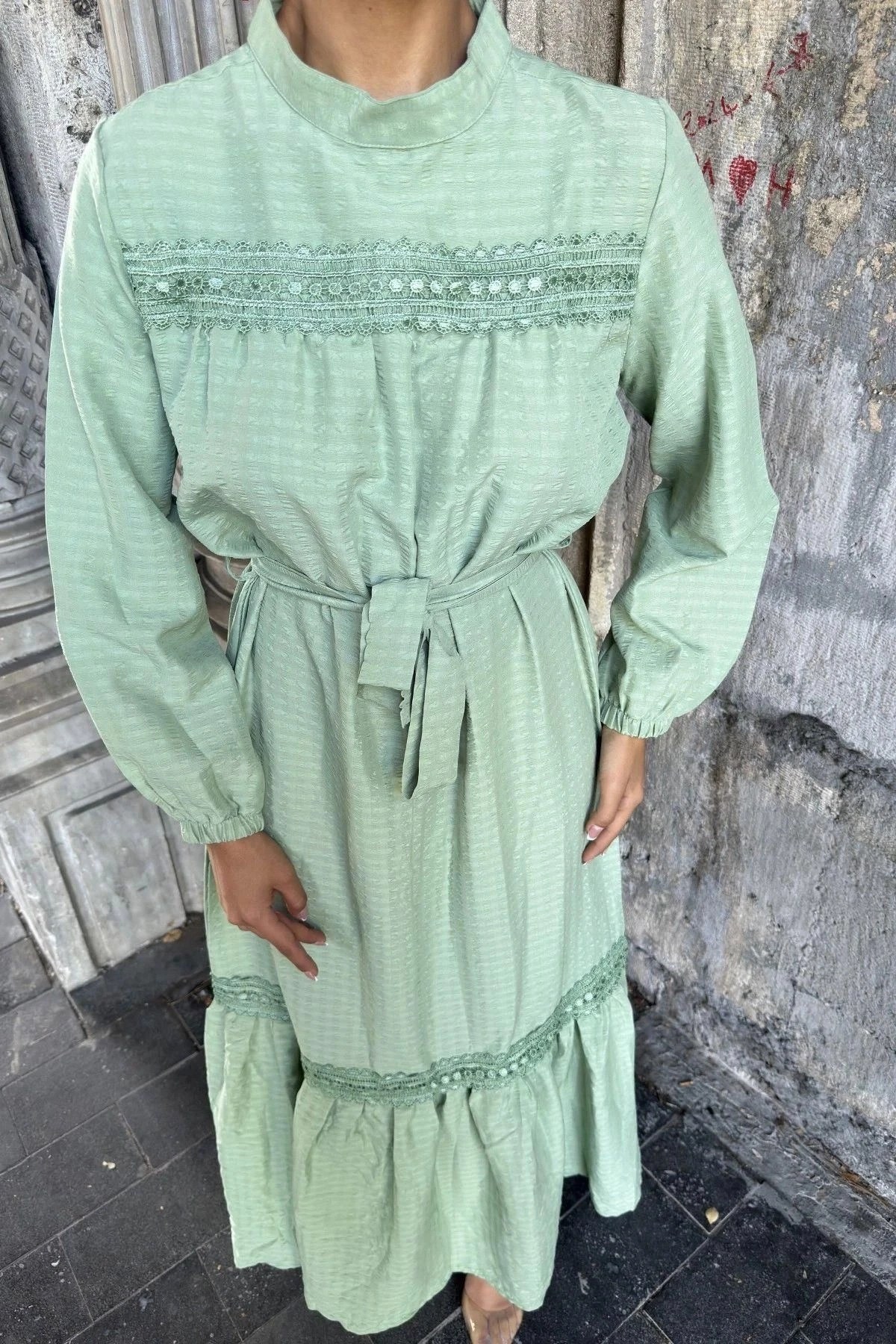 Mint Yeşil Kuşaklı, Dantel Detaylı, Maksi Lotus Elbise