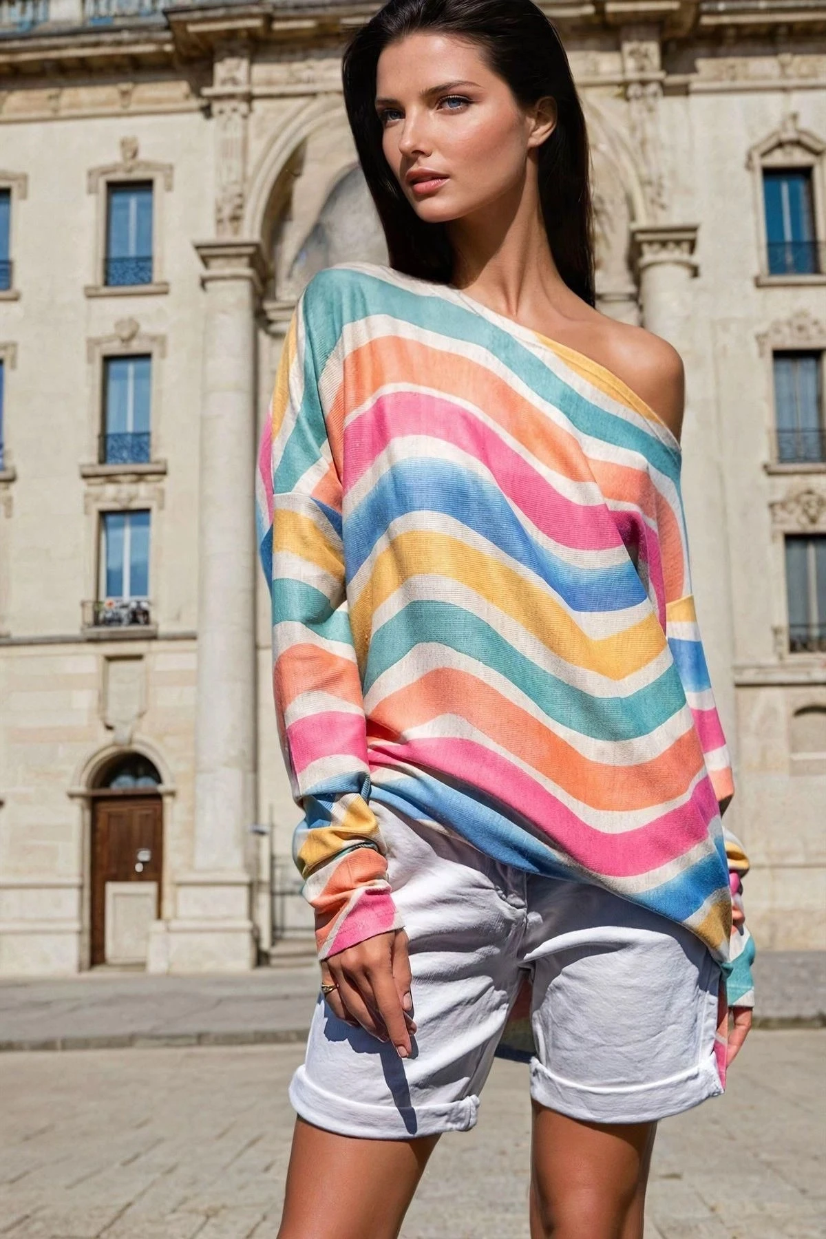 Mix Renk, Asimetrik Yaka, Salaş Kesim, Uzun Kollu Bluz