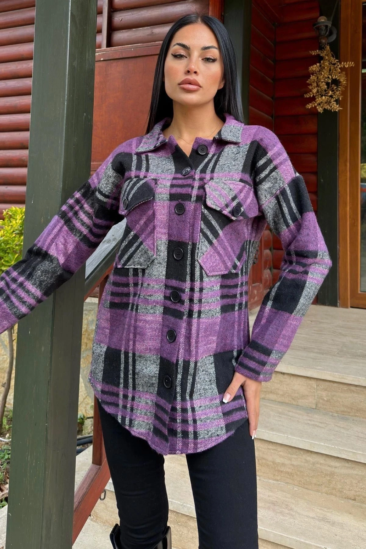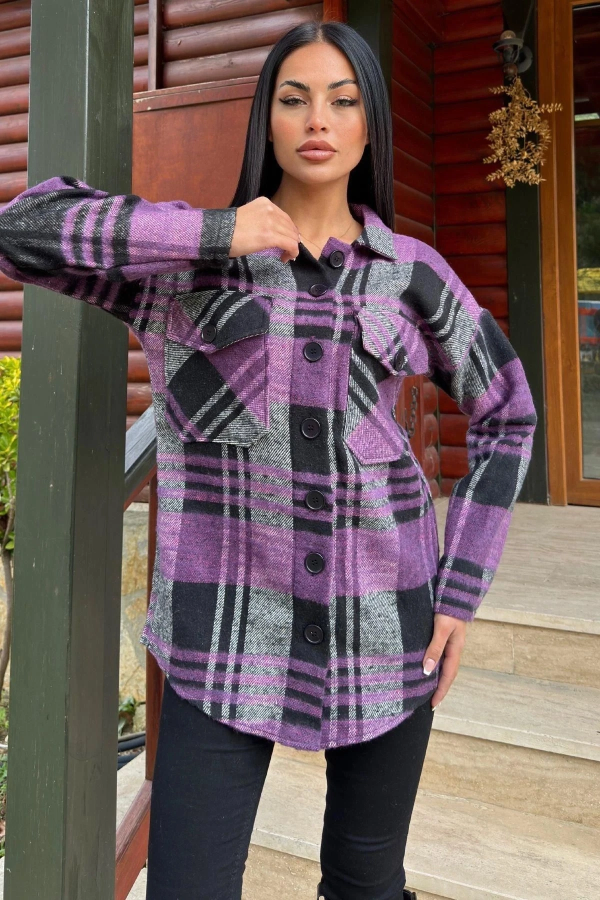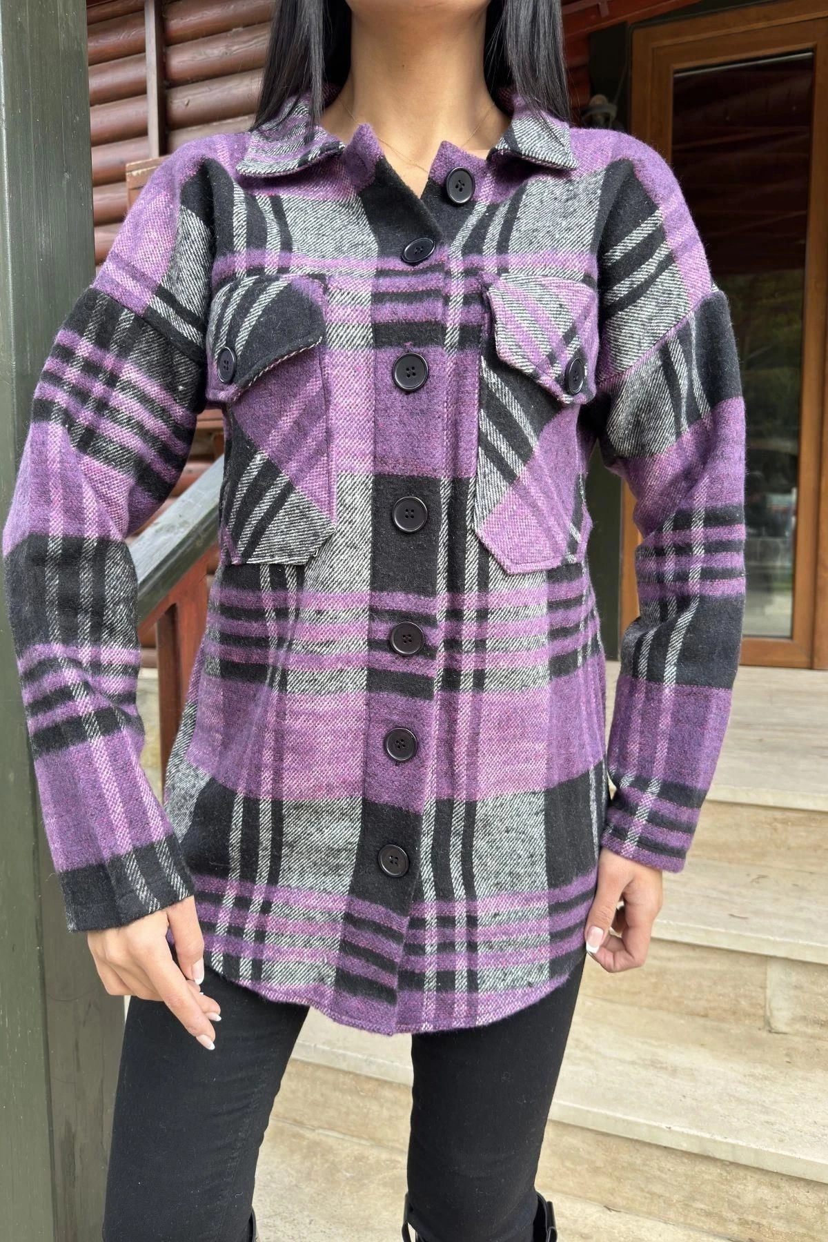 Mor Ekose Desenli, Yumuşak Dokulu, Relax Fit, Oduncu Gömlek