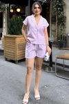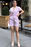 Pembe Apaş Yaka, Kısa Kol Gömlek & Beli Lastikli, Cepli Şort - Çizgi Desen Fisto Alt Üst Takım