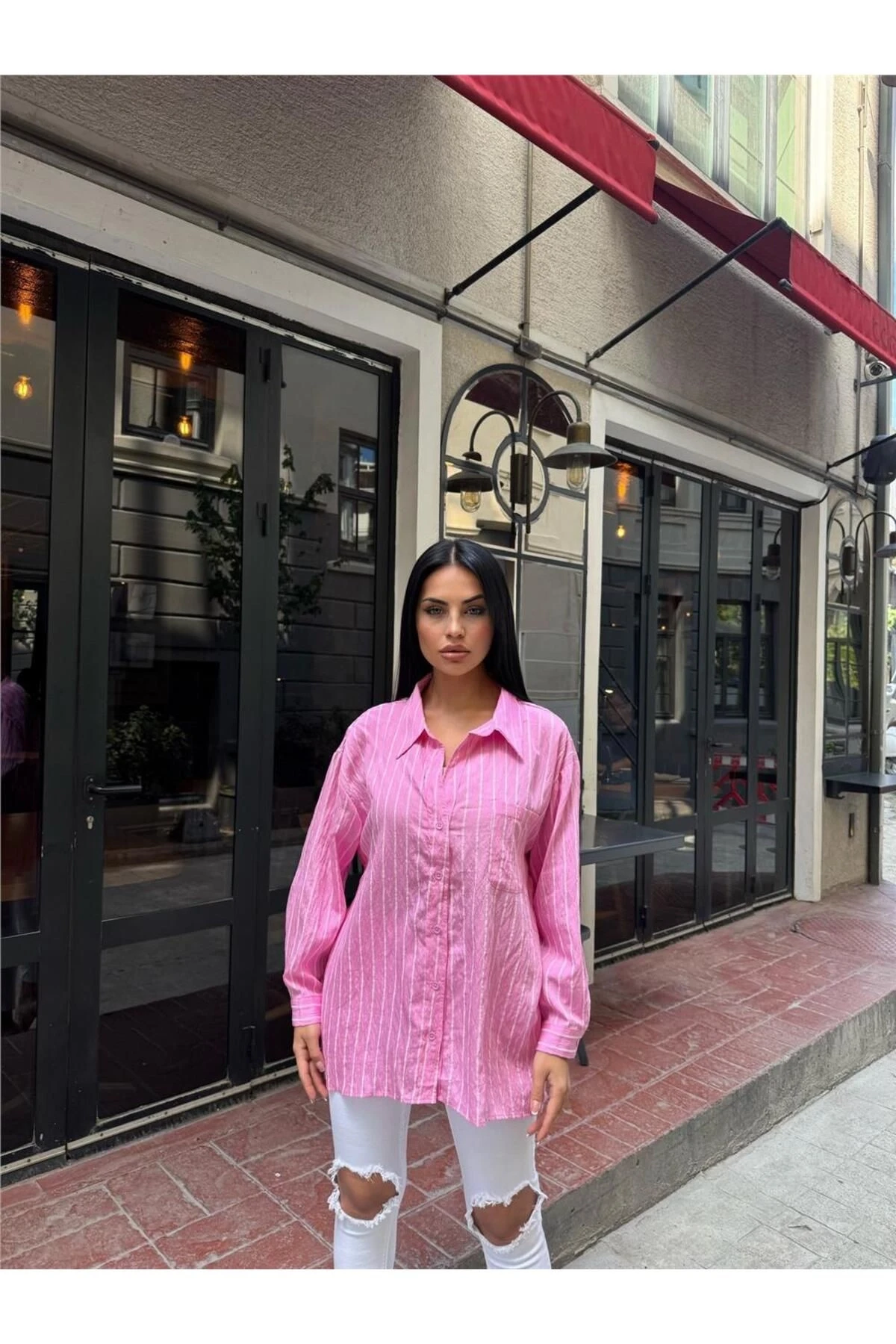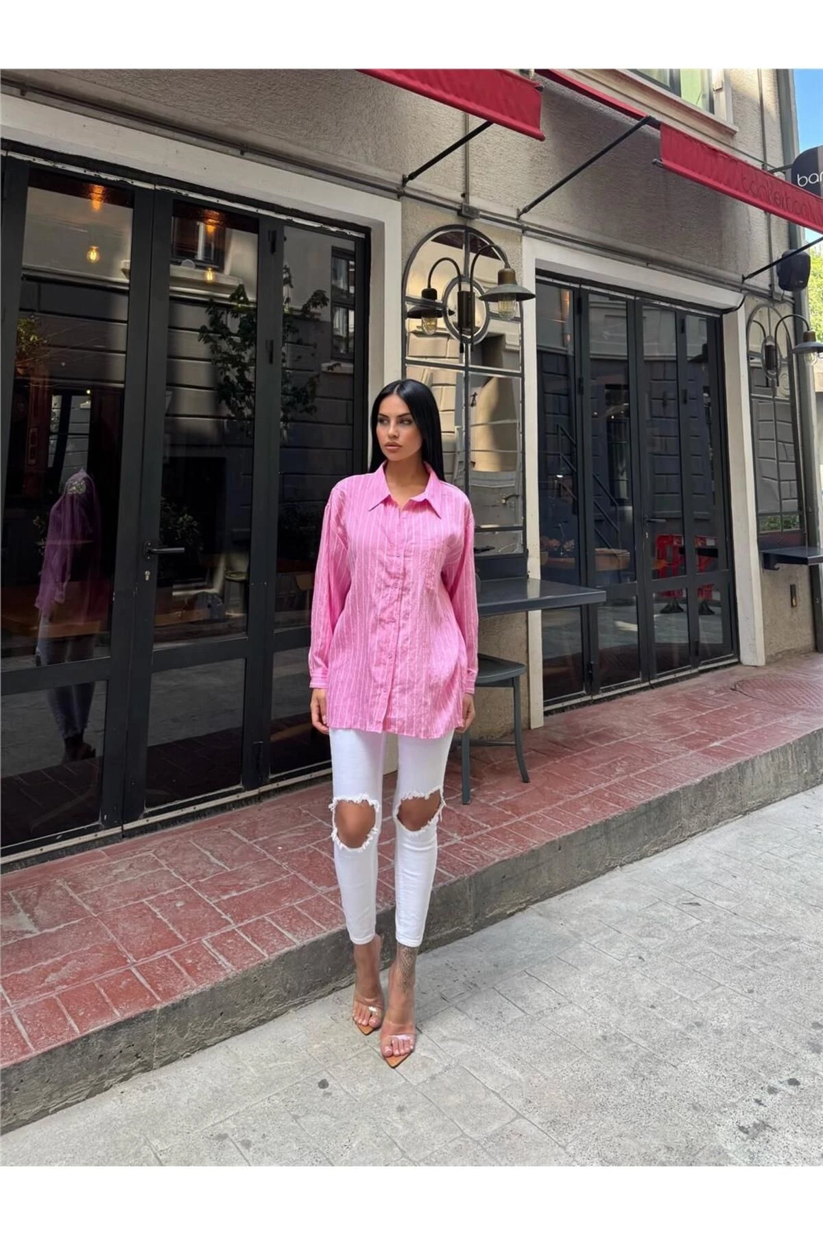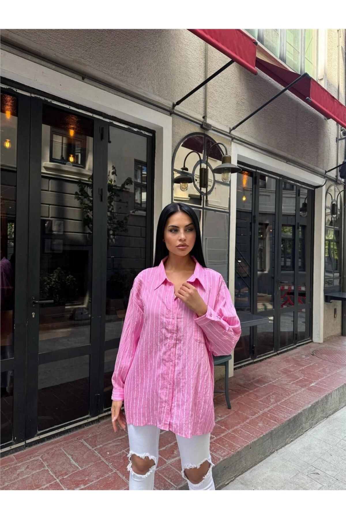 Pembe Çizgili Oversize Düğmeli Gömlek