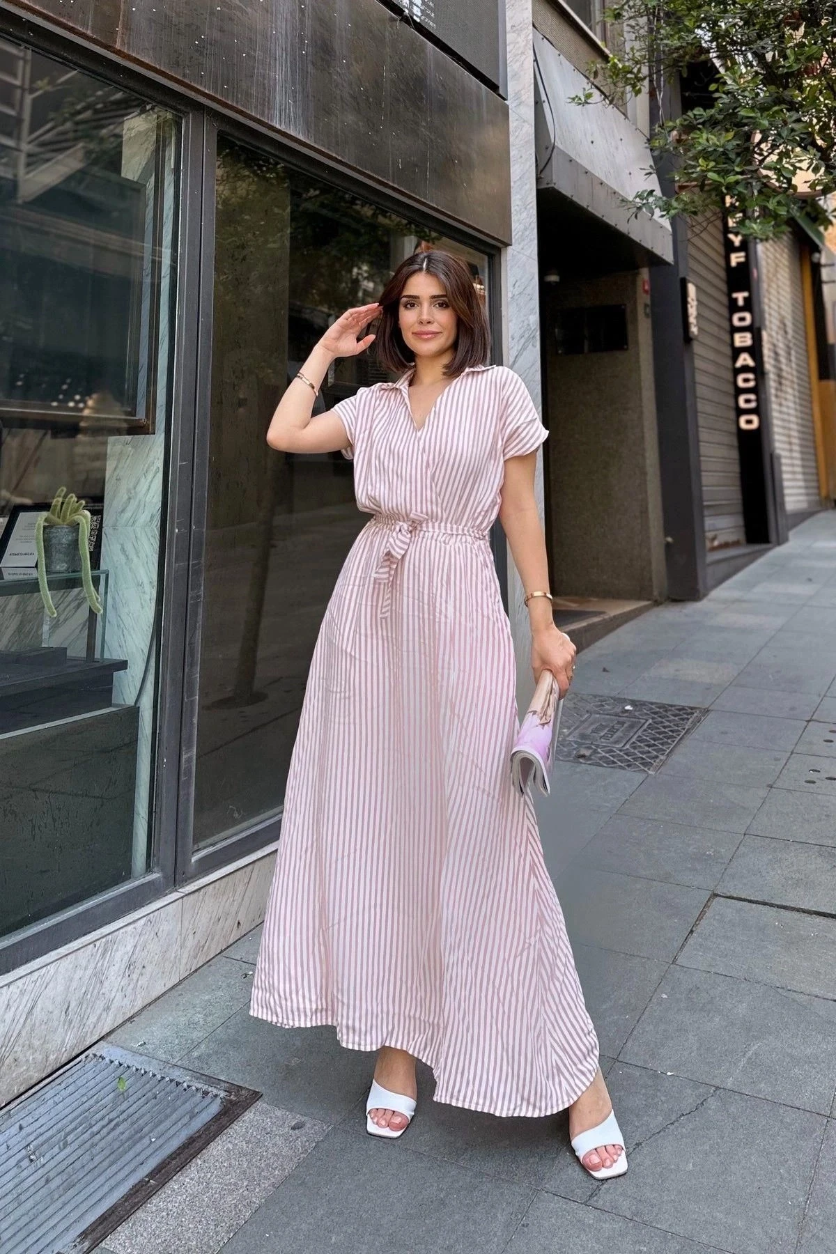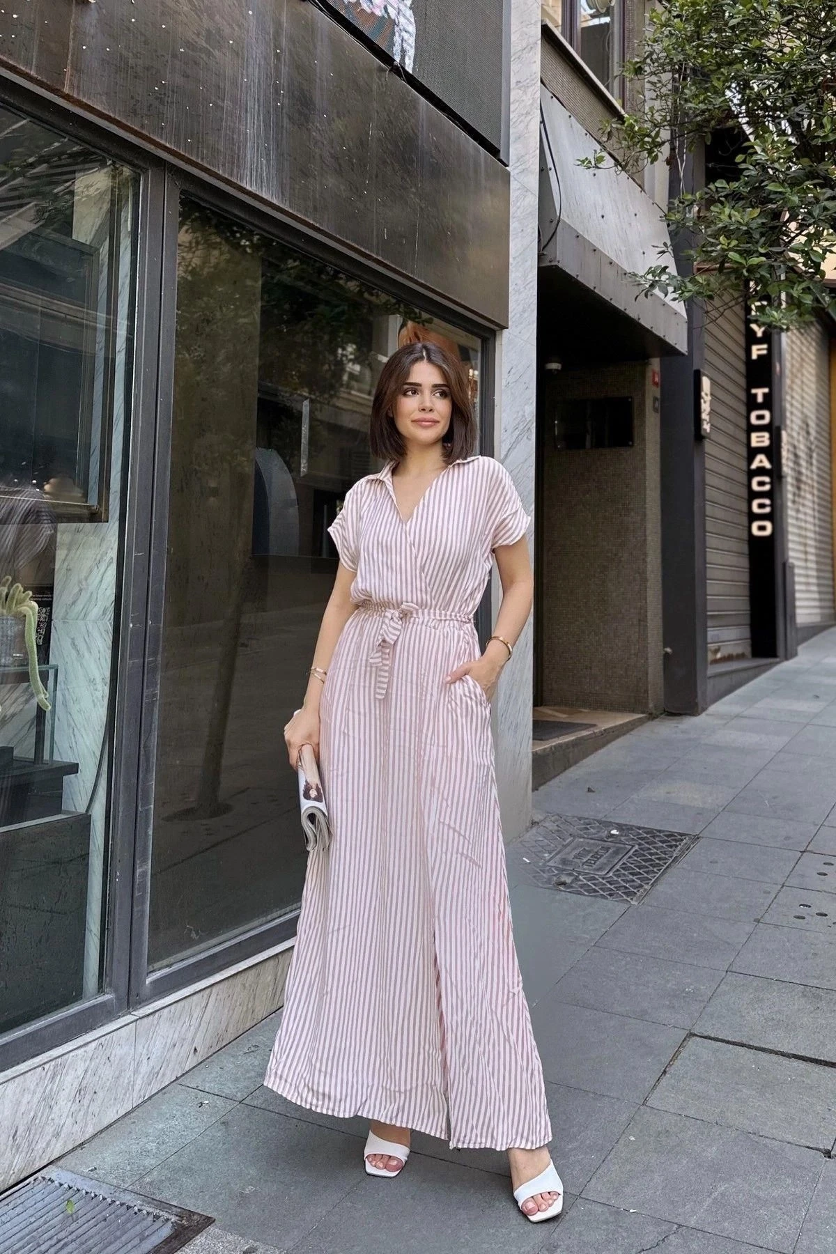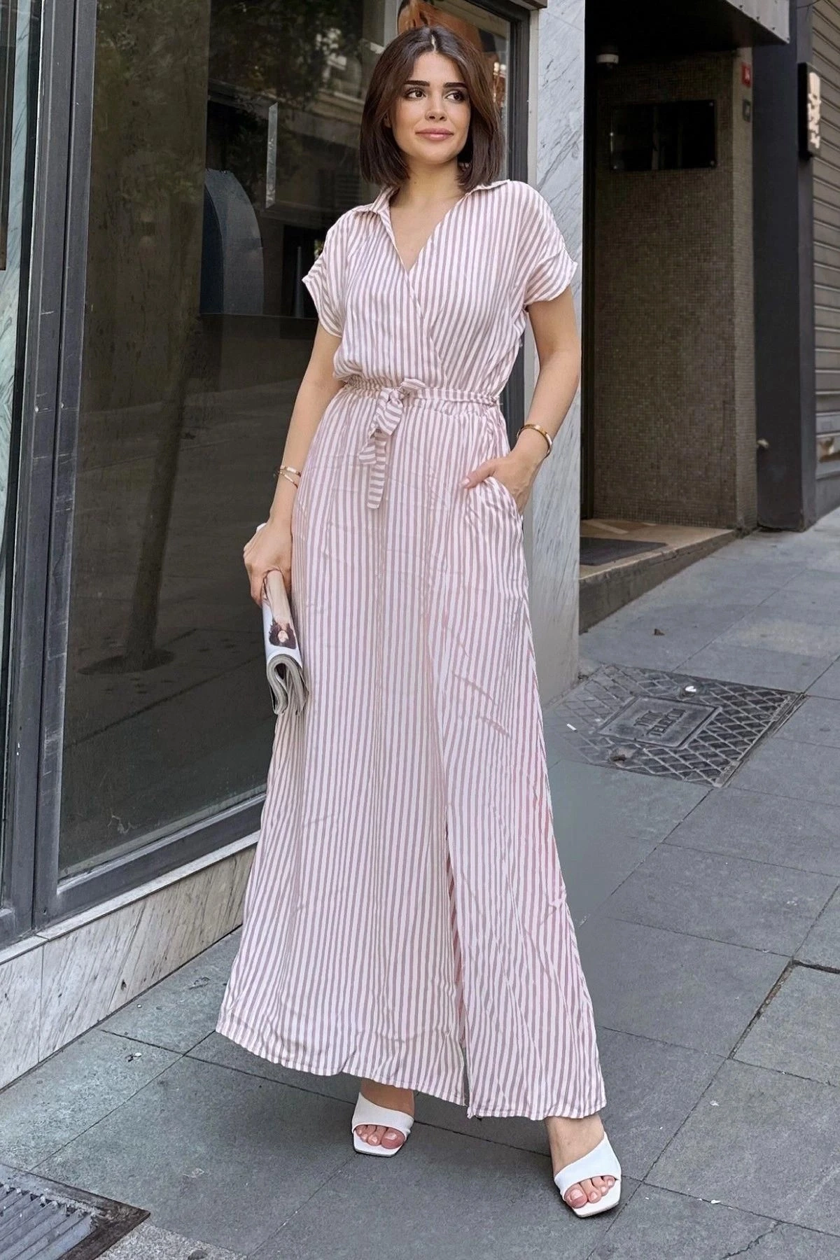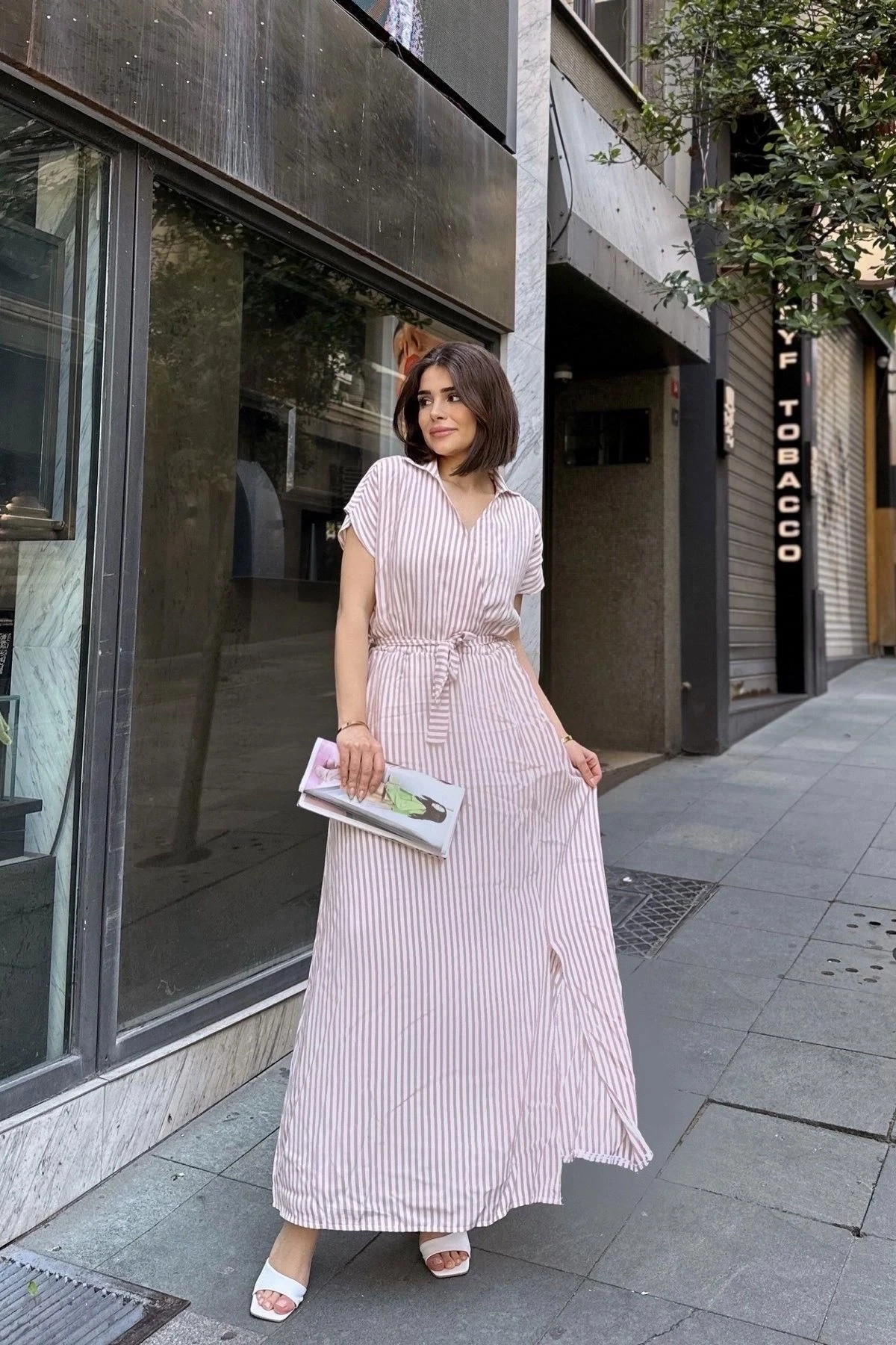 Bu Pembe &Ekru Kruvaze Polo Yaka, Kısa Kol, Çizgili Yazlık Kumaş, Yırtmaçlı, Kemerli/Kuşaklı, Maxi Uzun Elbise, şıklık ve rahatlığı bir araya getiren özel bir parçadır.; %60 pamuk ve %40 polyester kumaş karışımı, yumuşaklık ve nefes alabilirlik sağlar.; Pembe ve ekru renklerinin kombinasyonu, zarif ve şık bir görünüm sunar.; Pembe, feminenliği ve romantizmi yansıtan bir renktir, ekru ise sade ve sofistike bir görünüm sağlar.; Bu renklerin birleşimi, elbisenin çizgili deseniyle harika bir uyum oluşturur.; Kruvaze polo yaka tasarımı, modern ve zarif bir stil sunar.; Kısa kollu kesim, yaz aylarında serin ve rahat bir giyim deneyimi sağlar.; Çizgili yazlık kumaş, canlı ve enerjik bir hava katarken aynı zamanda yaz mevsimine uygun bir his verir.; Yırtmaç detayı, hareketlilik ve feminenlik katarken, kemerli/kuşaklı tasarım beli vurgulayarak zarif bir silüet oluşturur.; Maxi uzunluk, elbisenin etkileyici ve zarif bir görünüm sergilemesini sağlar.; Hem özel etkinliklerde hem de günlük hayatta şık bir tercih olarak öne çıkar.; Bu Pembe &Ekru Kruvaze Polo Yaka, Kısa Kol, Çizgili Yazlık Kumaş, Yırtmaçlı, Kemerli/Kuşaklı, Maxi Uzun Elbise ile kendinizi şık ve rahat hissedin.; Hem özel davetlerde hem de günlük yaşamda dikkatleri üzerinize çekin.; Bu göz alıcı elbiseyle stilinizi sergileyin ve unutulmaz bir görünüm elde edin.