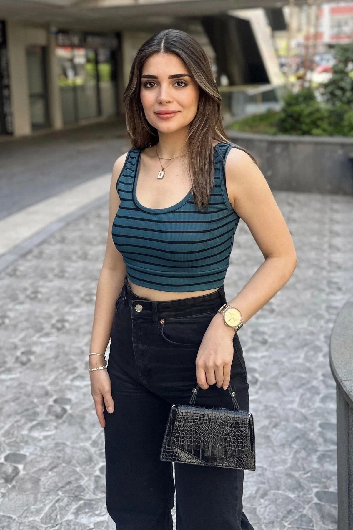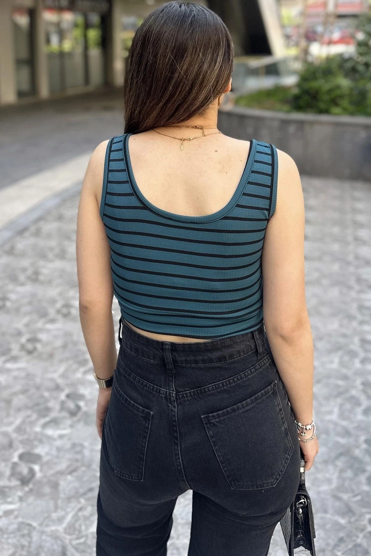Petrol Mavi Çizgili, Dar Kesim, Dekolteli Yuvarlak Yaka, Terletmez Kumaş, Askılı Crop Bluz & Atlet