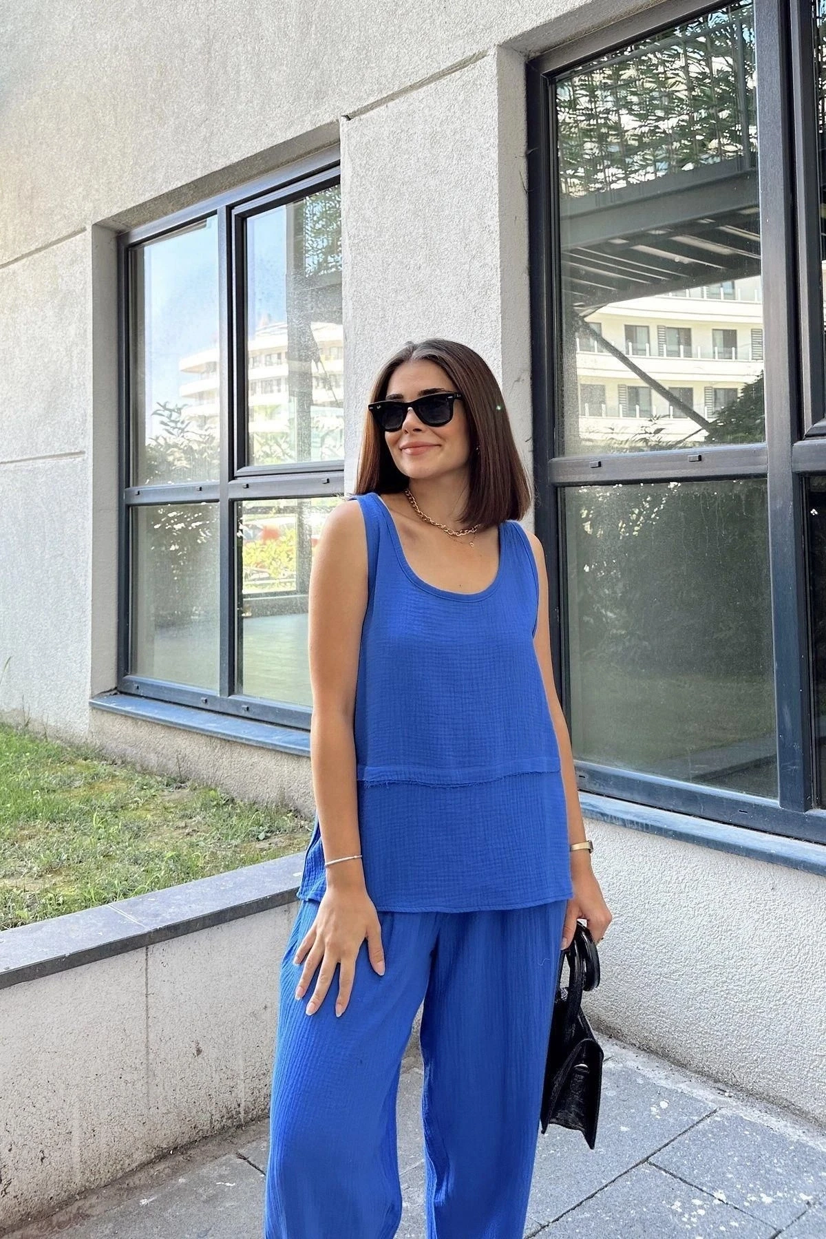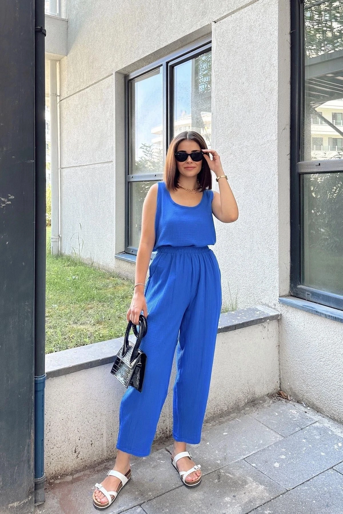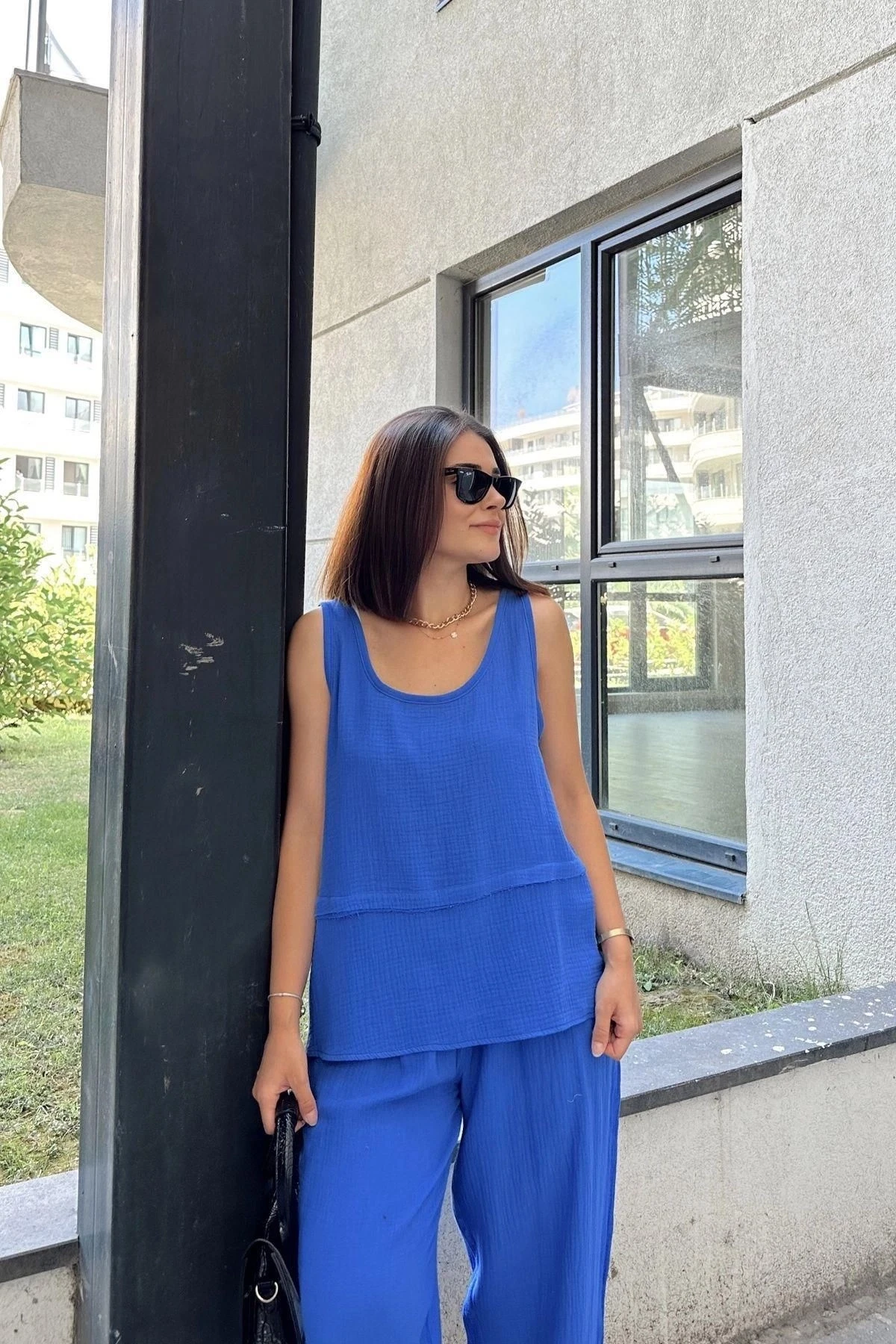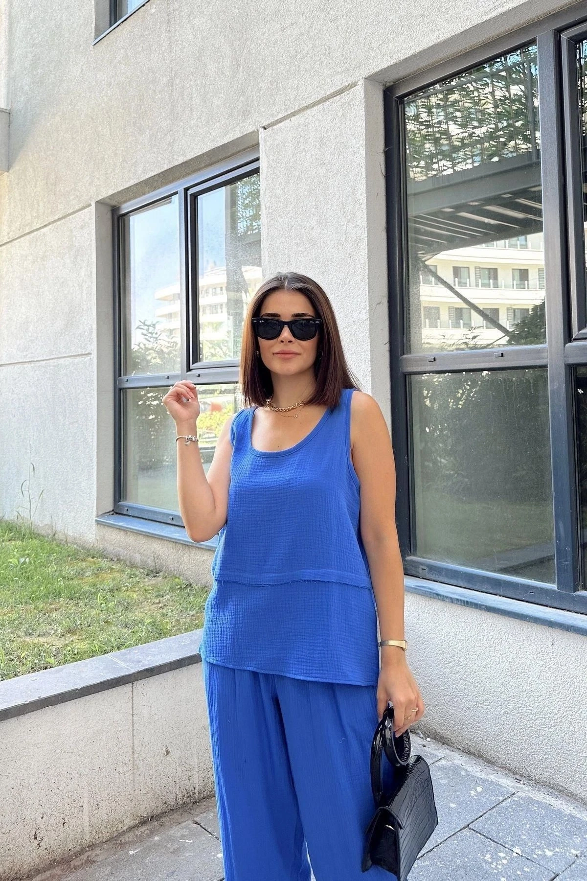 Saks İthal Müslin Kumaş, Basic, Katlı, Salaş Askılı Bluz & Atlet ile gardırobunuzda şıklığın ve rahatlığın keyfini çıkarın! Bu özel tasarım bluz ve atlet kombinasyonu, kendine has özellikleriyle sizi etkileyecek.; İthal müslin kumaş, ürünün kalitesini ve dayanıklılığını vurgularken, %100 pamuk yapısı sayesinde cildinizle dost bir deneyim sunar.; Bu kumaş türü, nefes alabilirliği ve yumuşak dokusuyla gün boyu rahatlık sağlar.; Salaş askıları sayesinde hareket özgürlüğü sunan bluz ve atlet, sizi hem özel anlarınızda hem de günlük hayatınızda mükemmel hissettirecek.; Özel katlı tasarımı, bluzun daha zengin ve dokulu bir görünüm kazanmasını sağlar.; Bu detay, ürüne derinlik katarak sıradışı bir dokunuş sunar.; Temel ve minimalist tasarımı sayesinde farklı kombinasyonlarla stilinizi tamamlayabilirsiniz.; Kısa uzunluğu olan bu bluz ve atlet, modern ve dinamik bir görünüm elde etmenizi sağlar.; Saks rengi, canlılığı ve sadeliği bir araya getiren bir seçimdir.; Hem enerjik hem de zarif bir hava sunarken, farklı aksesuarlarla tamamlayarak istediğiniz tarzı yansıtabilirsiniz.; Bu ürün, her türlü mekanda ve etkinlikte kullanabileceğiniz çok yönlü bir seçenektir.; Uzunluğu 60 cm olan bu bluz ve atlet, her bedende mükemmel bir uyum sağlar.; Gardırobunuzun vazgeçilmezi olmaya aday Saks İthal Müslin Kumaş, Basic, Katlı, Salaş Askılı Bluz & Atlet ile özgüveninizi ve şıklığınızı ön plana çıkarın!