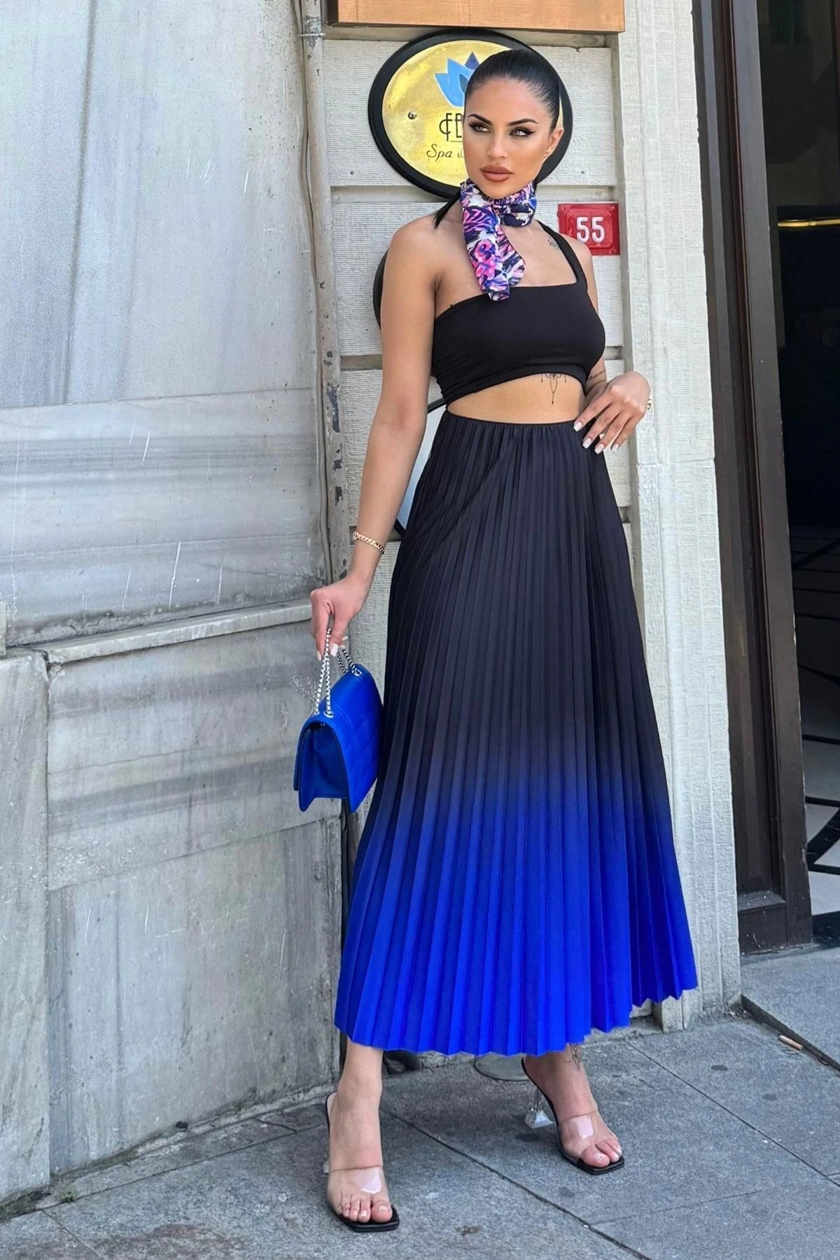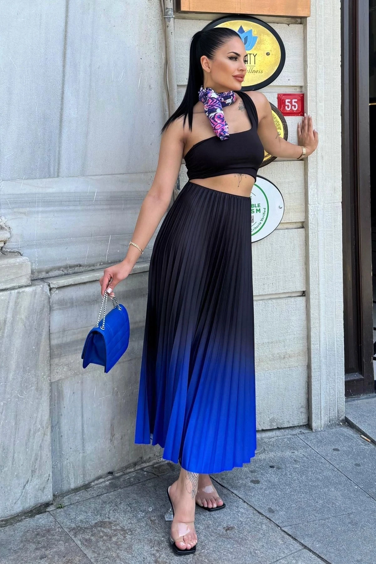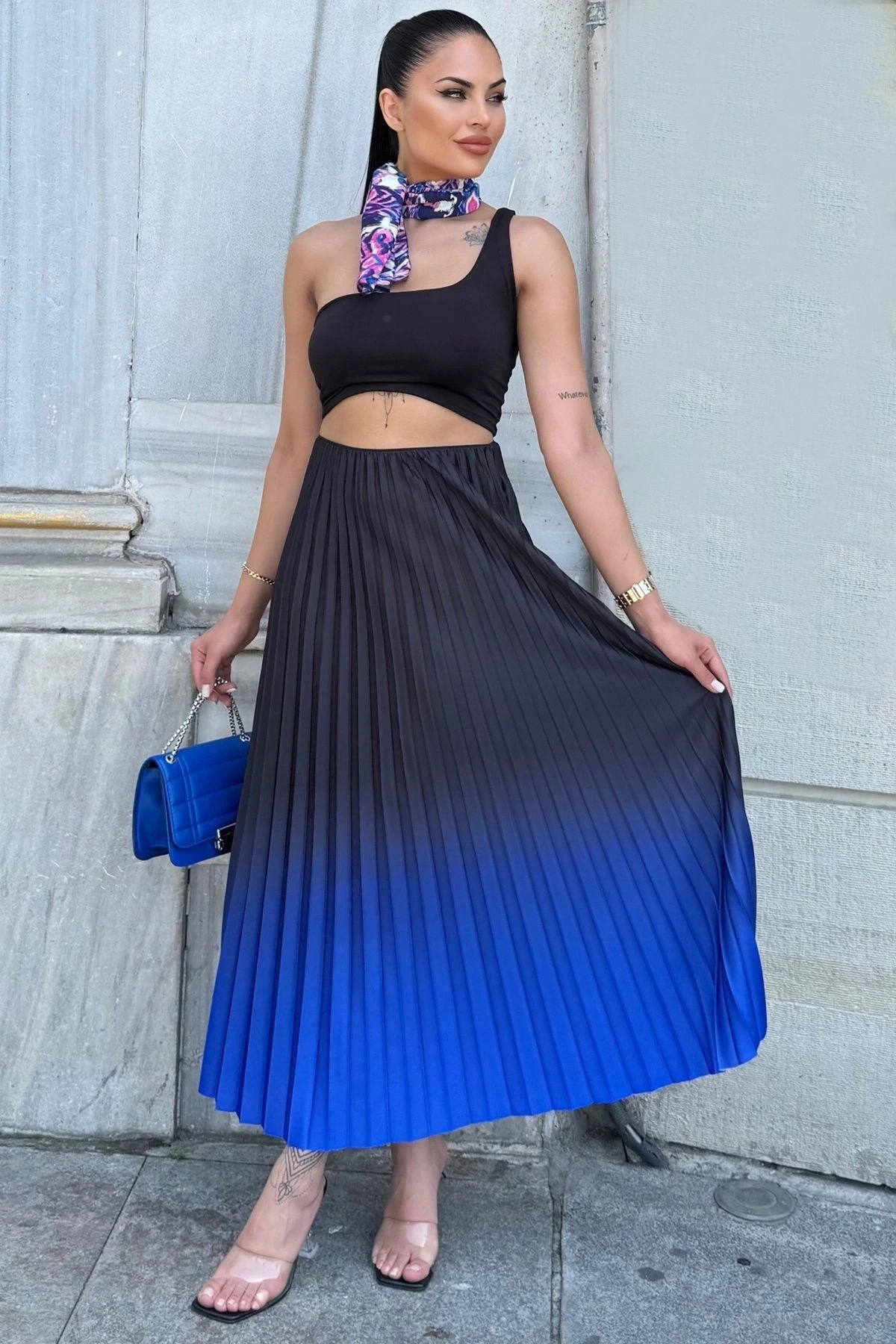 Saks Siyah Ombre Desenli Pilili Uzun Etek