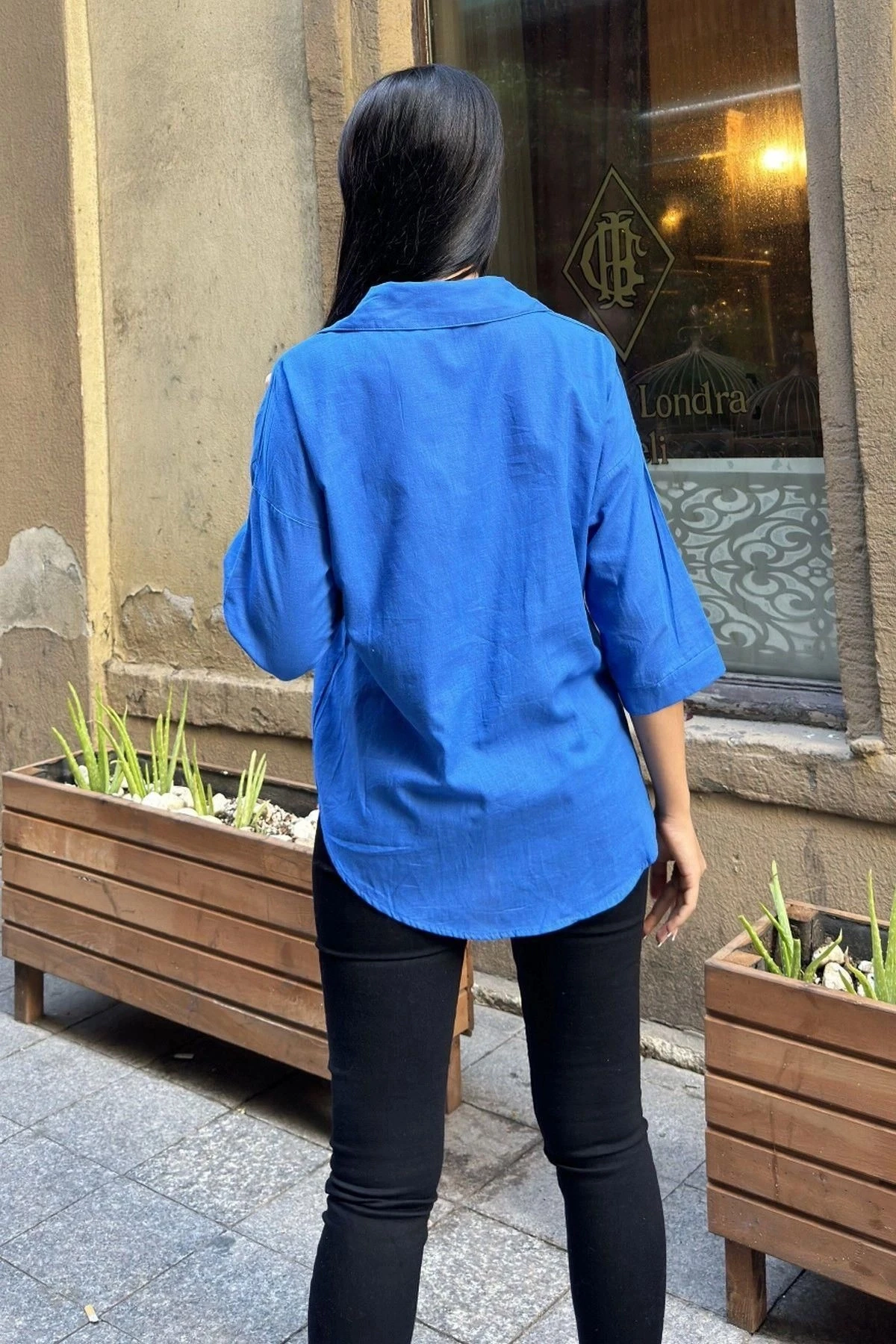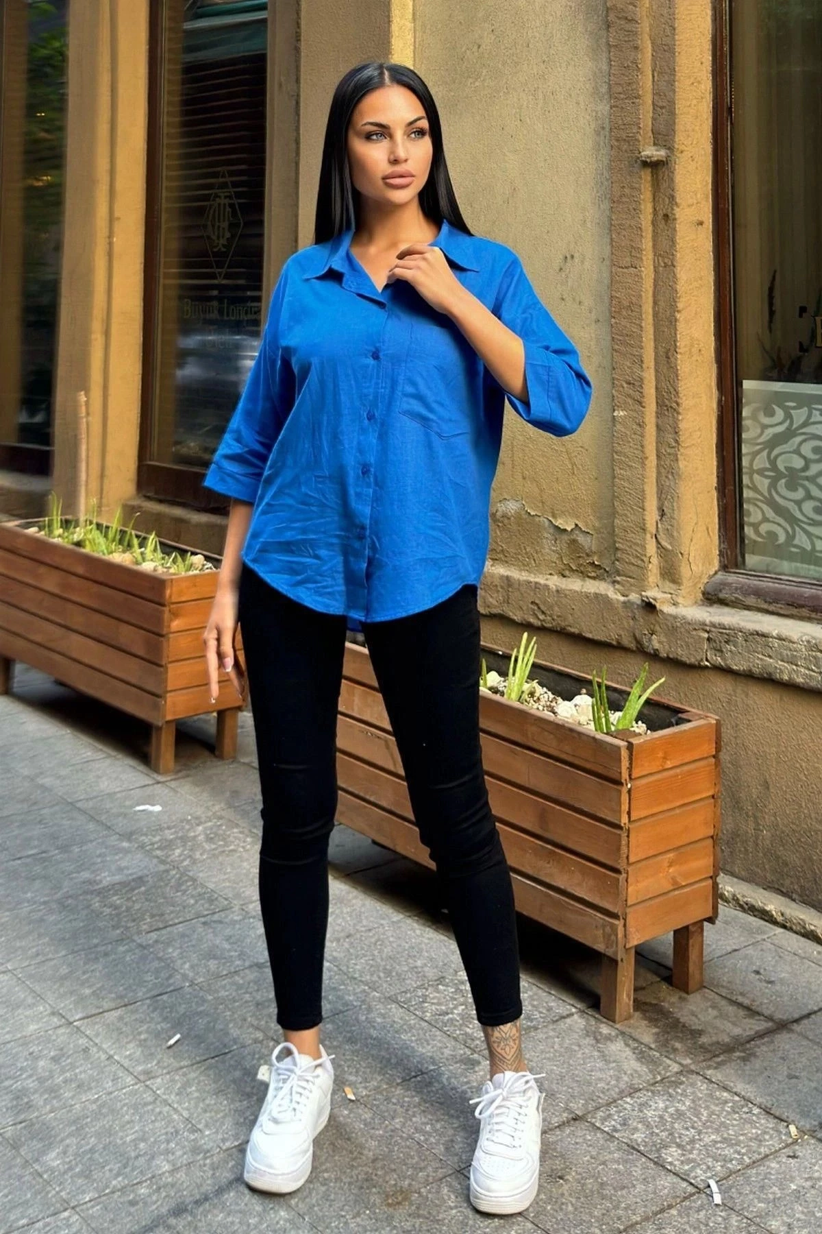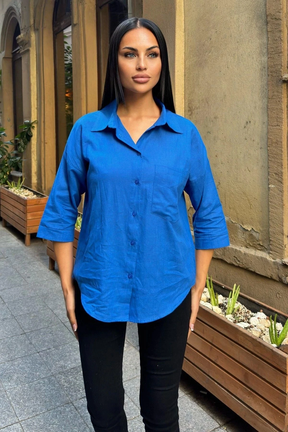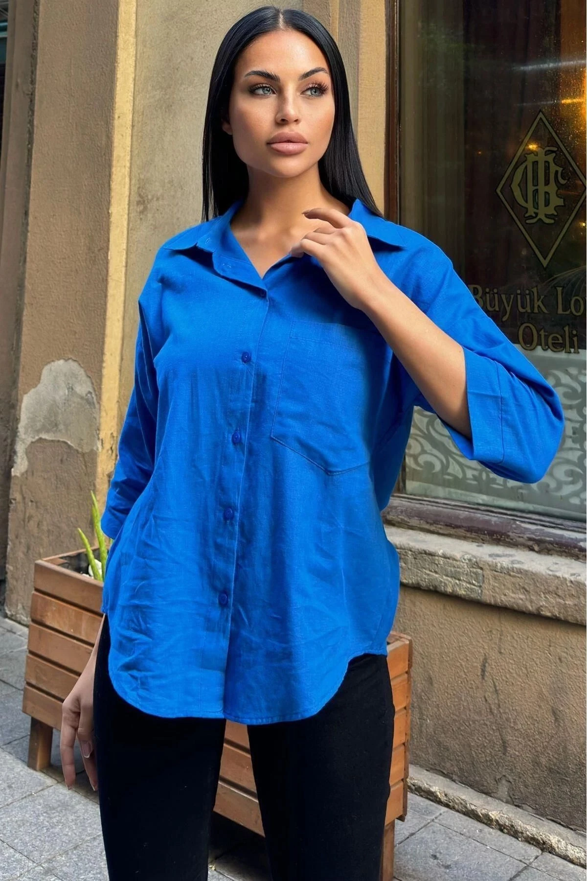 Saks Truvakar Kol, Oval Kesim, Terletmez, Flamlı Keten Salaş Gömlek