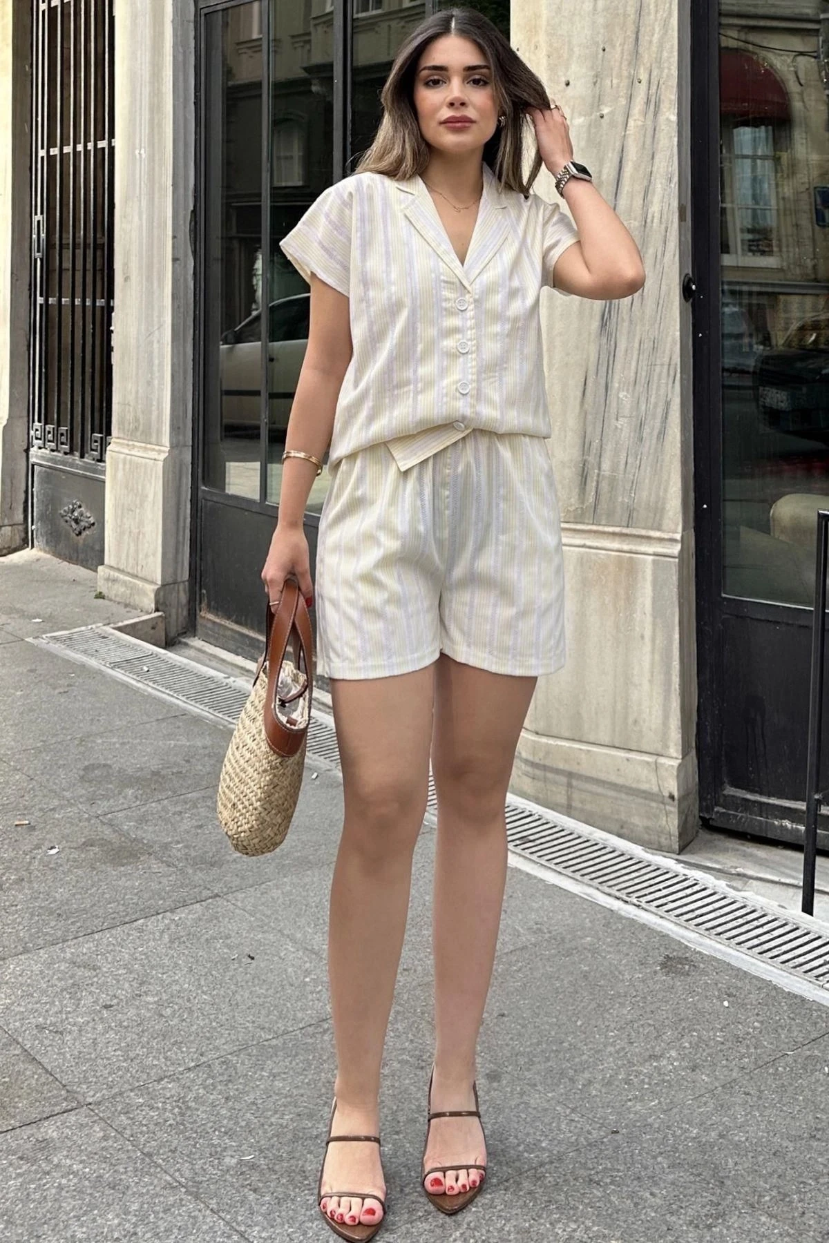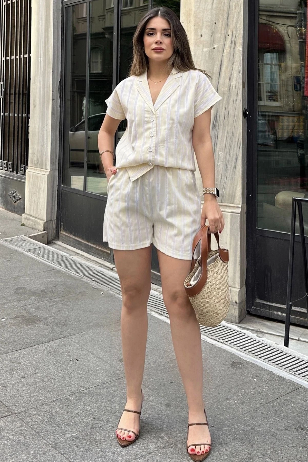 Sarı Apaş Yaka, Kısa Kol Gömlek & Beli Lastikli, Cepli Şort - Çizgi Desen Fisto Alt Üst Takım