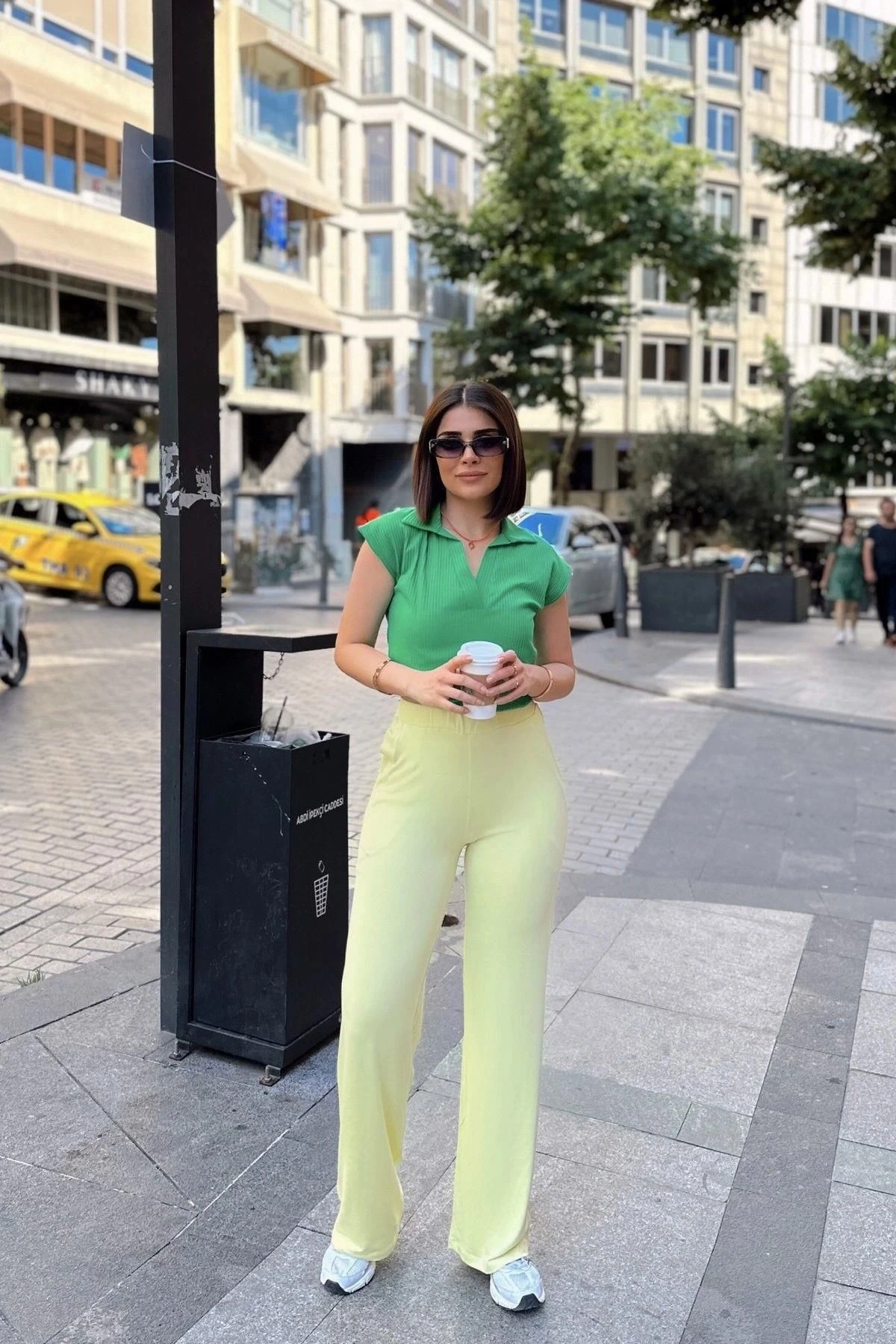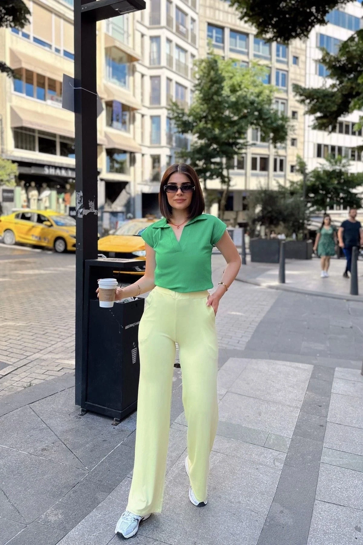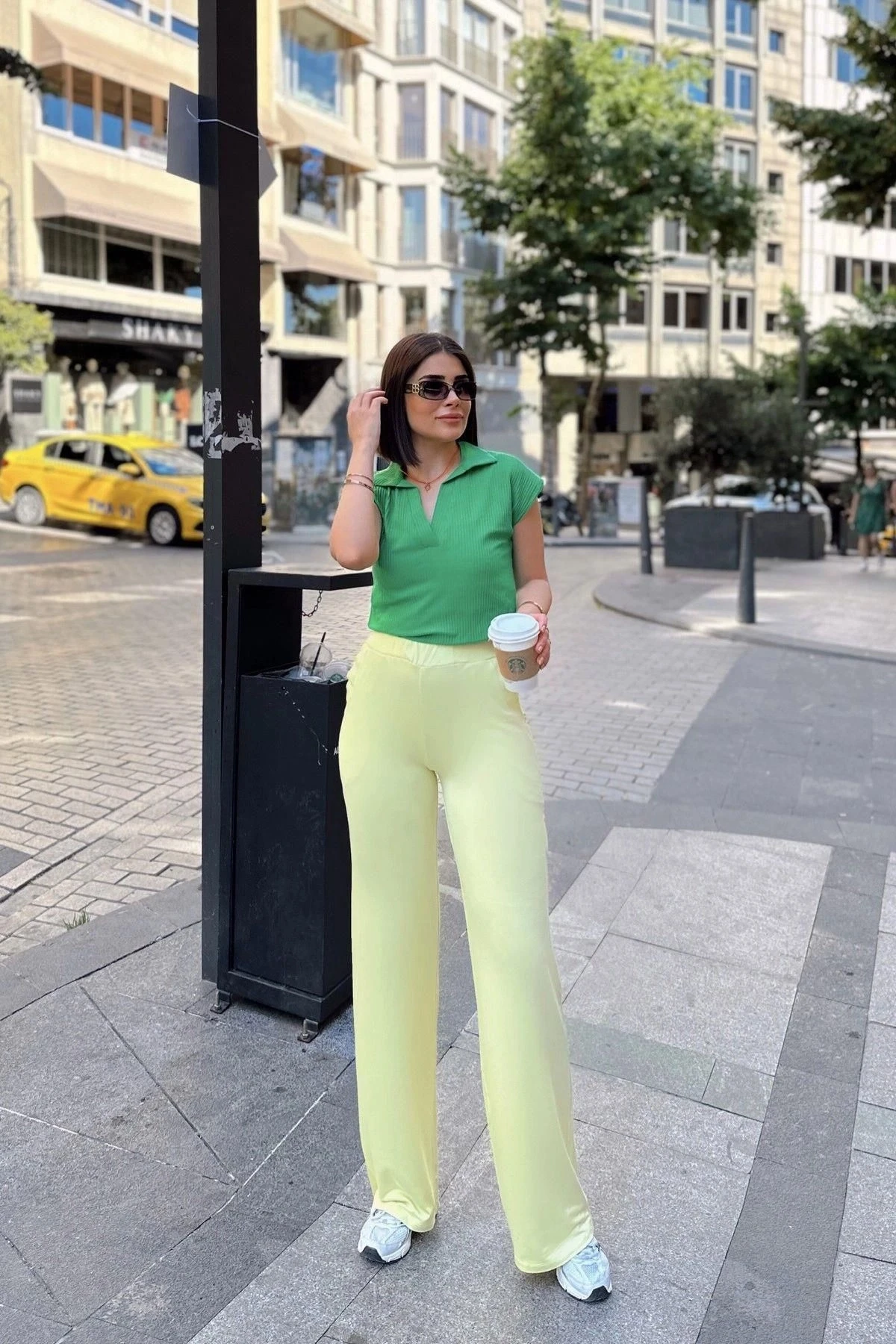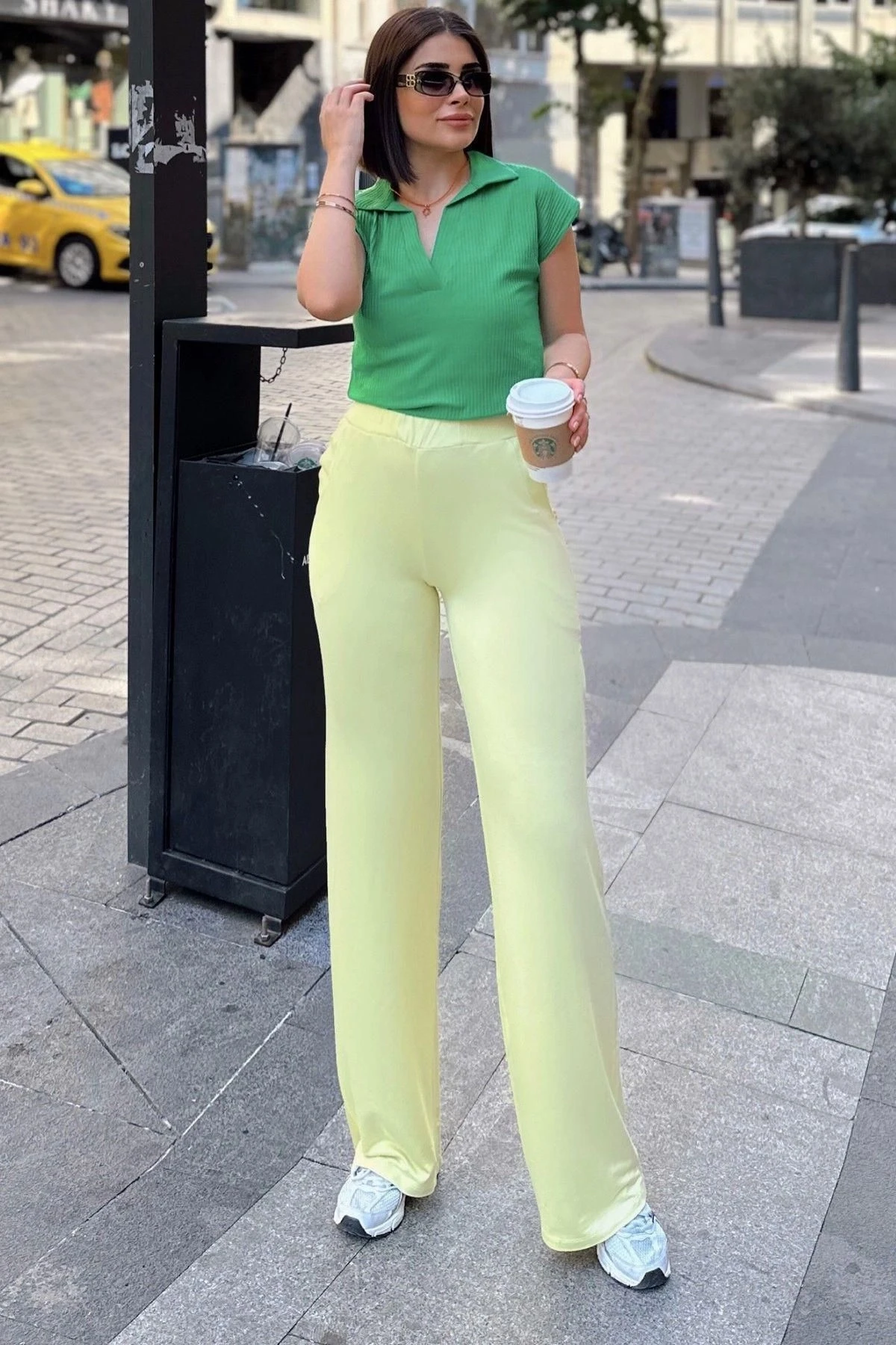 Bu Sarı İspanyol Bol Paça, Lastikli Bel, Yumuşak Dokulu Kumaş, Salaş & Rahat Kalıp/Kesim, Pantolon, konfor ve şıklığı bir araya getiren bir seçenektir.; %95 polyester ve %5 elastan içeren kumaşı, yumuşak dokusuyla vücuda hoş bir his verir ve hareket özgürlüğü sağlar.; Sarı renkli bu pantolon, canlı ve enerjik bir görünüm sunar.; İspanyol bol paça stili, salaş ve rahat bir duruş sergilerken, lastikli bel detayı da ekstra konfor sağlar.; Yumuşak dokulu kumaşı, cildinize zarif bir dokunuş sunar ve gün boyu rahatlık sağlar.; Salaş ve rahat kalıp/kesim, modern bir tarzı yansıtırken, aynı zamanda ferah bir giyim deneyimi sunar.; Bu pantolon, hem günlük hayatta hem de özel etkinliklerde stilinizi tamamlayacak bir parçadır.; Şık bir bluz veya gömlek ile kombinleyerek şık bir görünüm elde edebilir veya daha rahat bir tarz için basic bir tişörtle tamamlayabilirsiniz.; Sarı İspanyol Bol Paça, Lastikli Bel, Yumuşak Dokulu Kumaş, Salaş & Rahat Kalıp/Kesim, Pantolon, her mevsimde gardırobunuzun vazgeçilmez bir parçası olacak.; Şıklık, konfor ve renkli bir tarz arayanlar için ideal bir seçimdir.; Hem günlük hayatta hem de özel günlerde size rahatlık ve stil sunacak olan bu pantolonu keşfedin.
