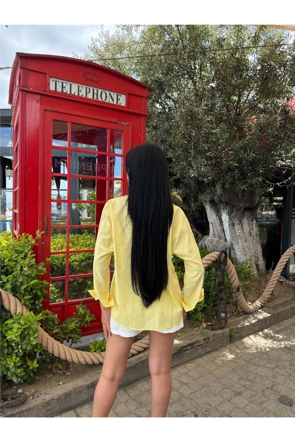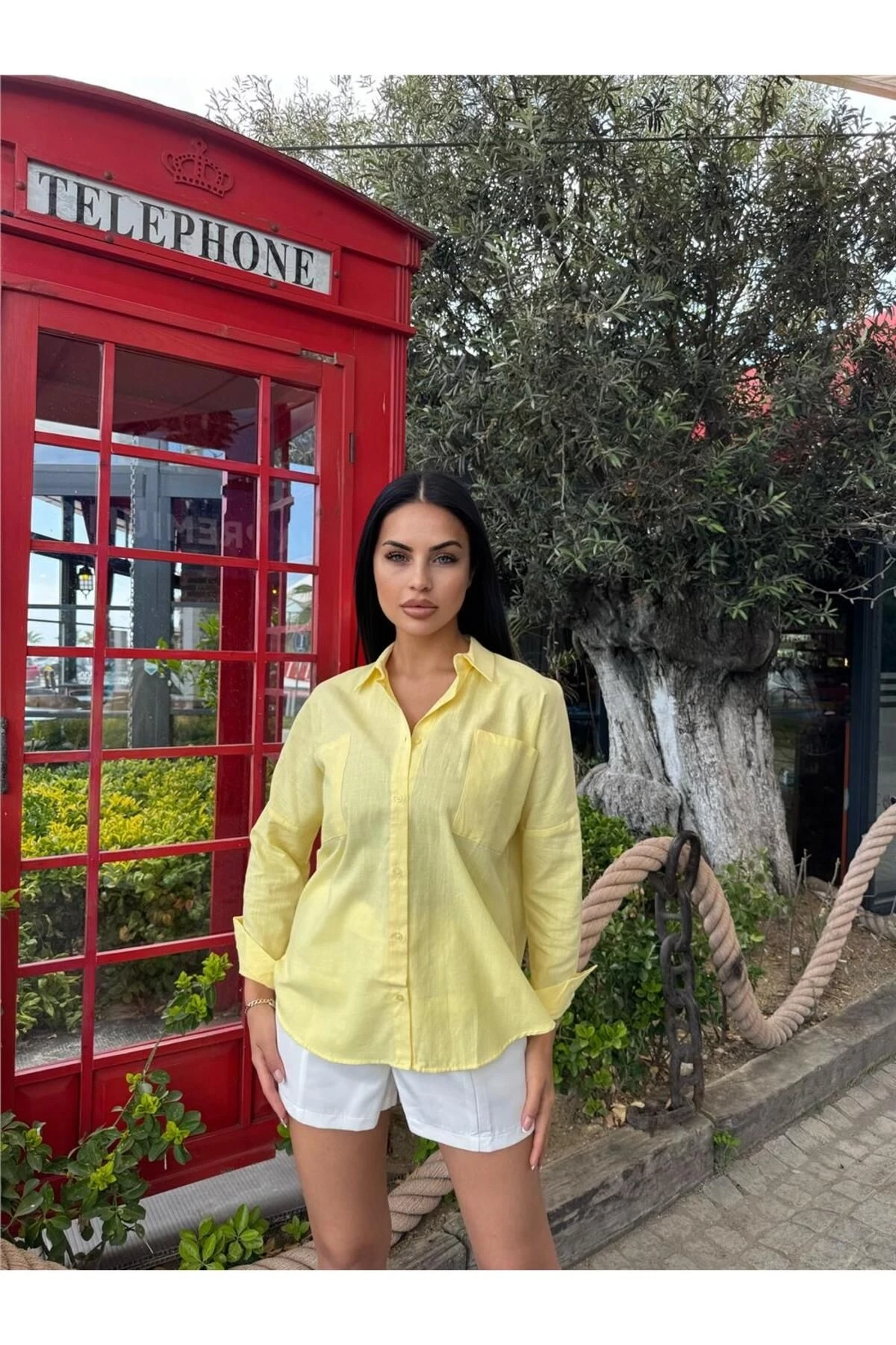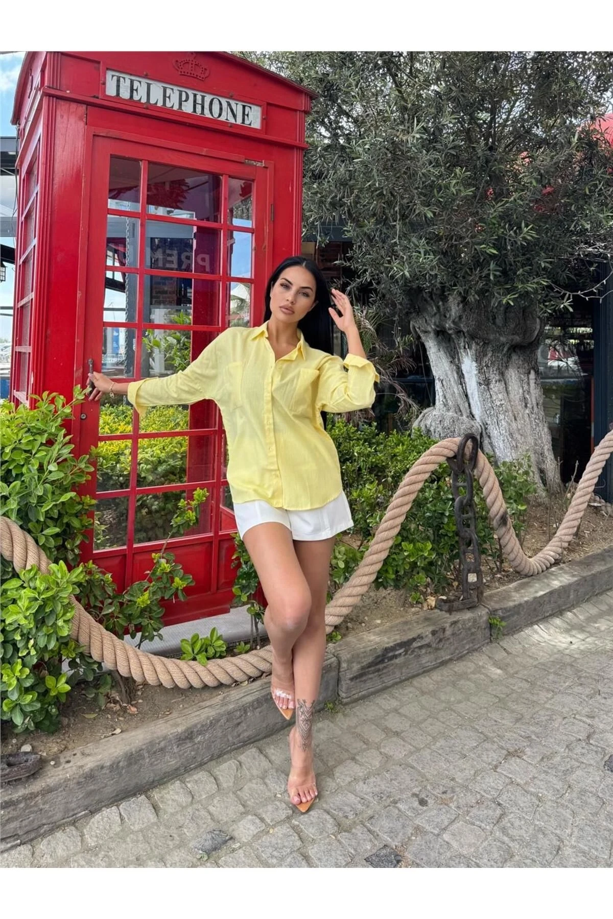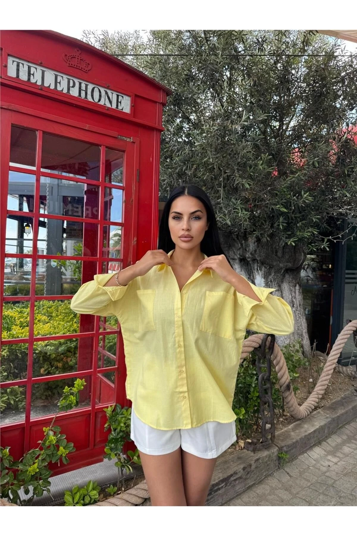 Sarı Oversize Cepli Pamuklu Polyester Gömlek