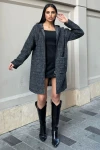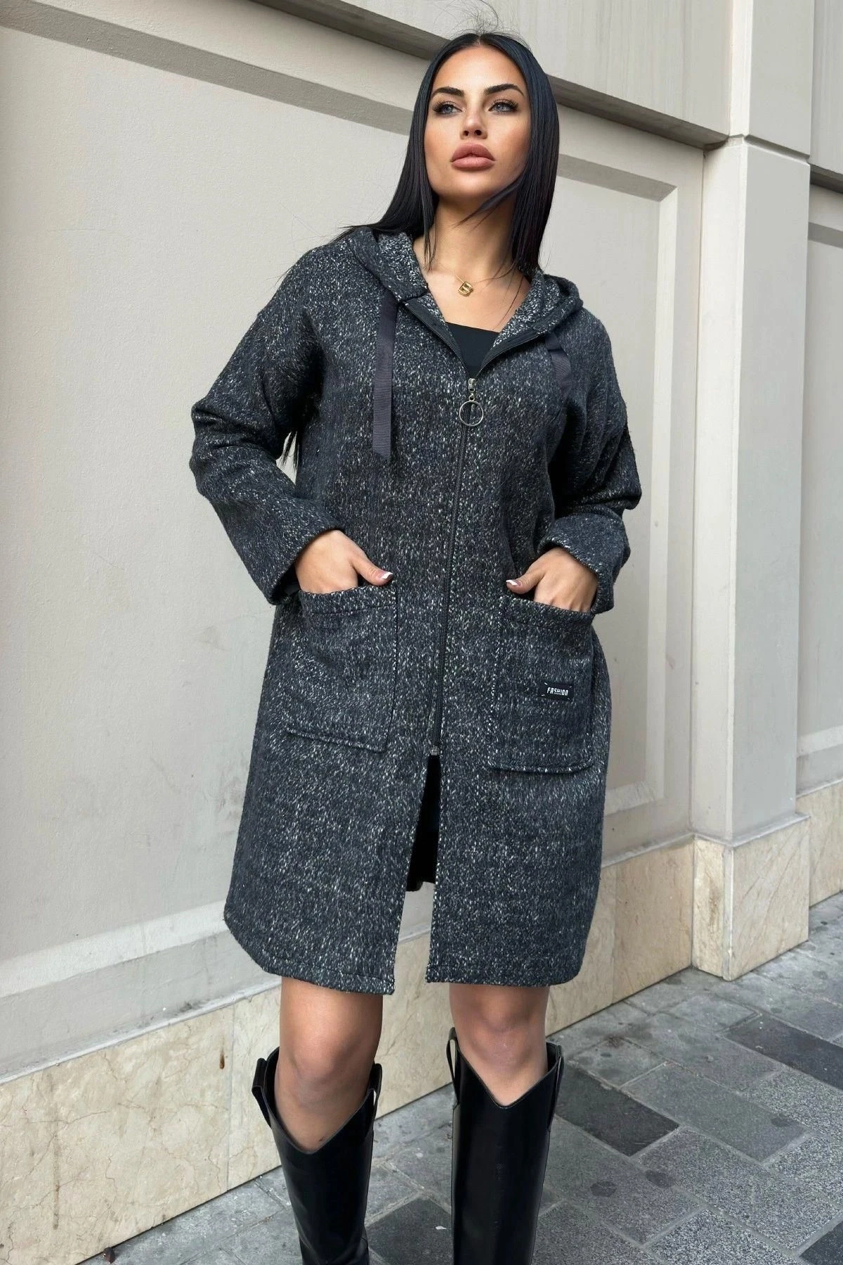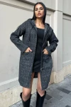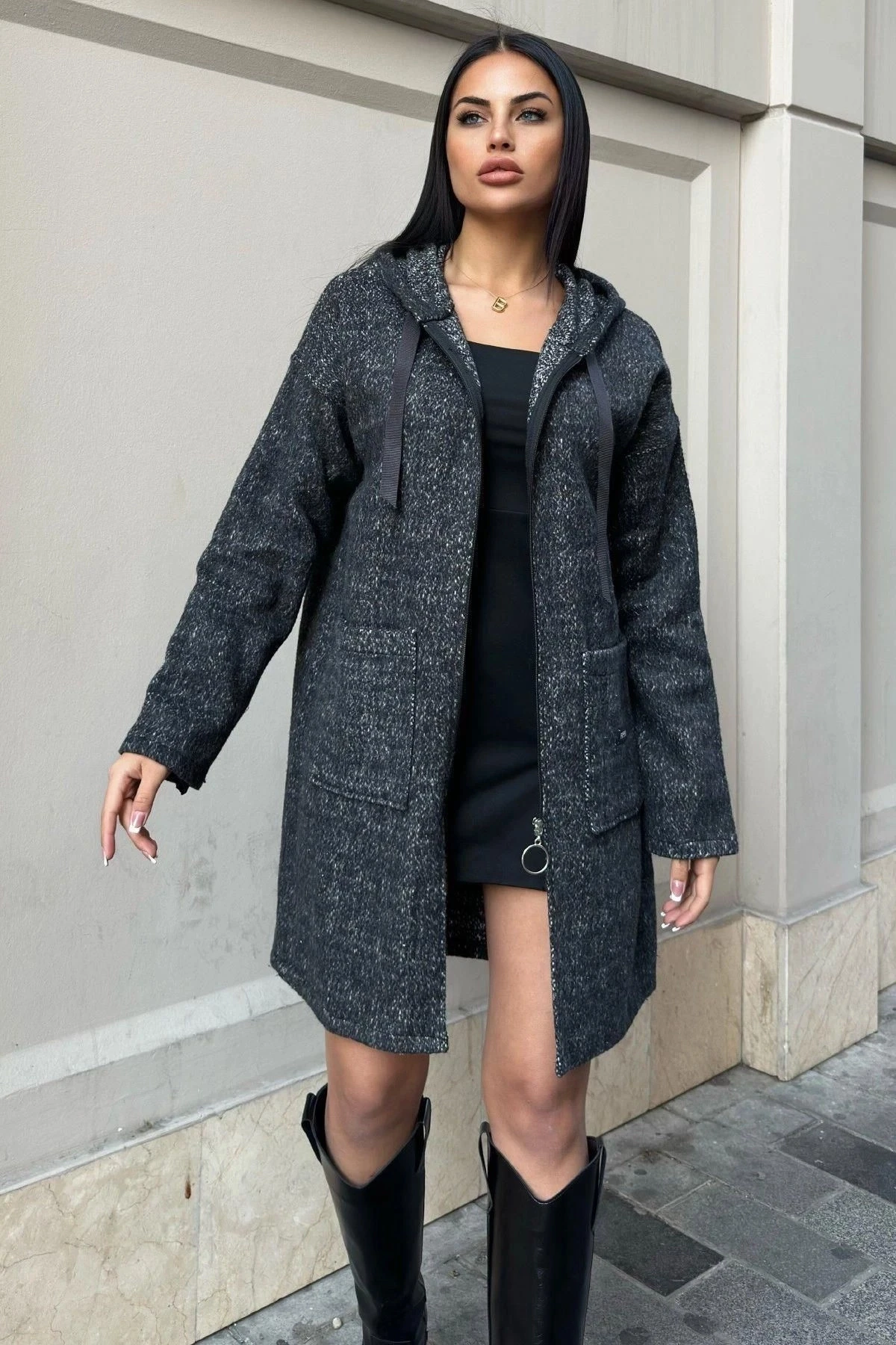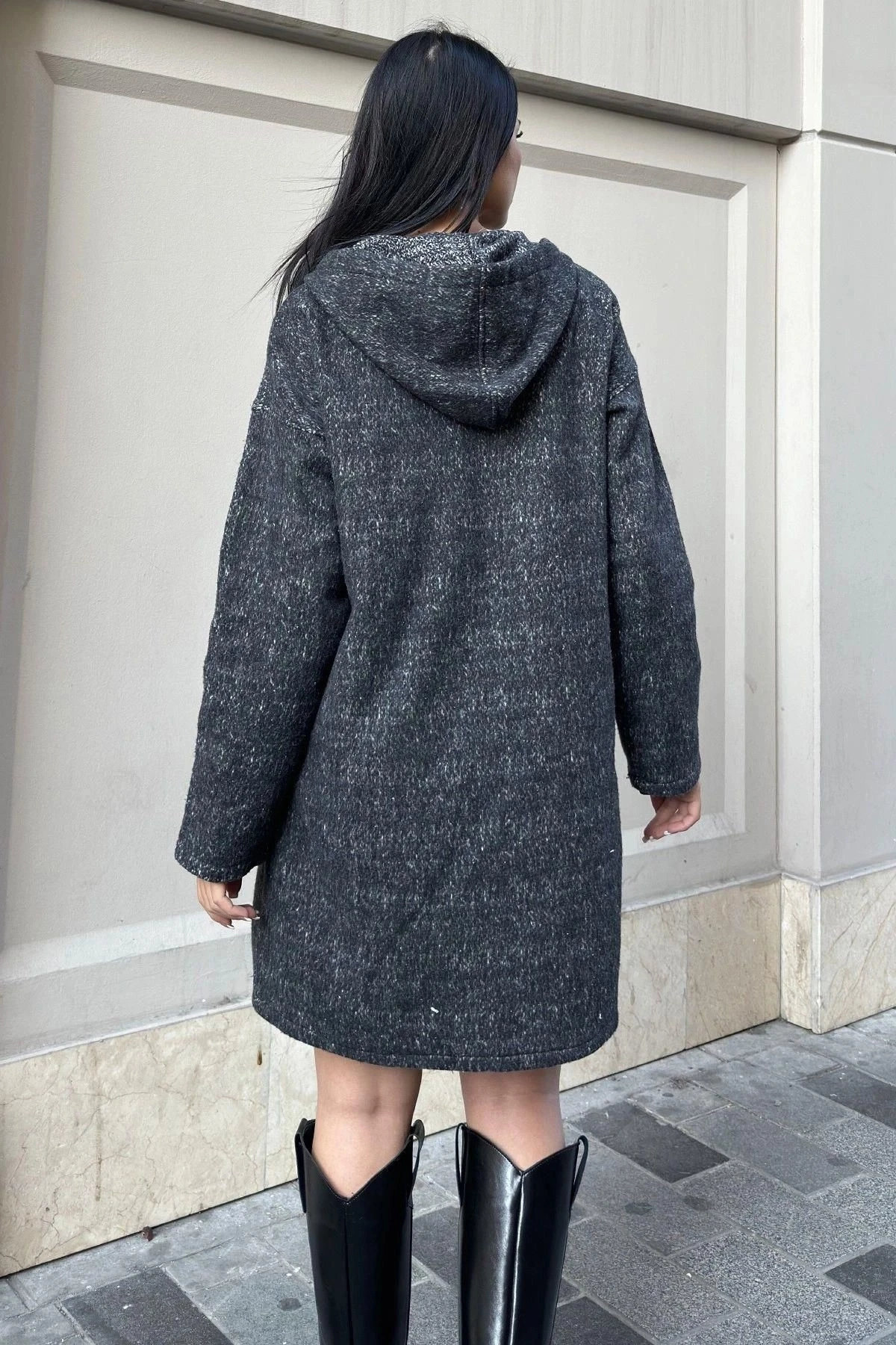 Siyah Arma Detaylı, Kapüşonlu, Kırçıllı Kaşe Hırka Ceket