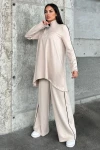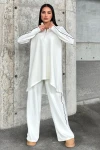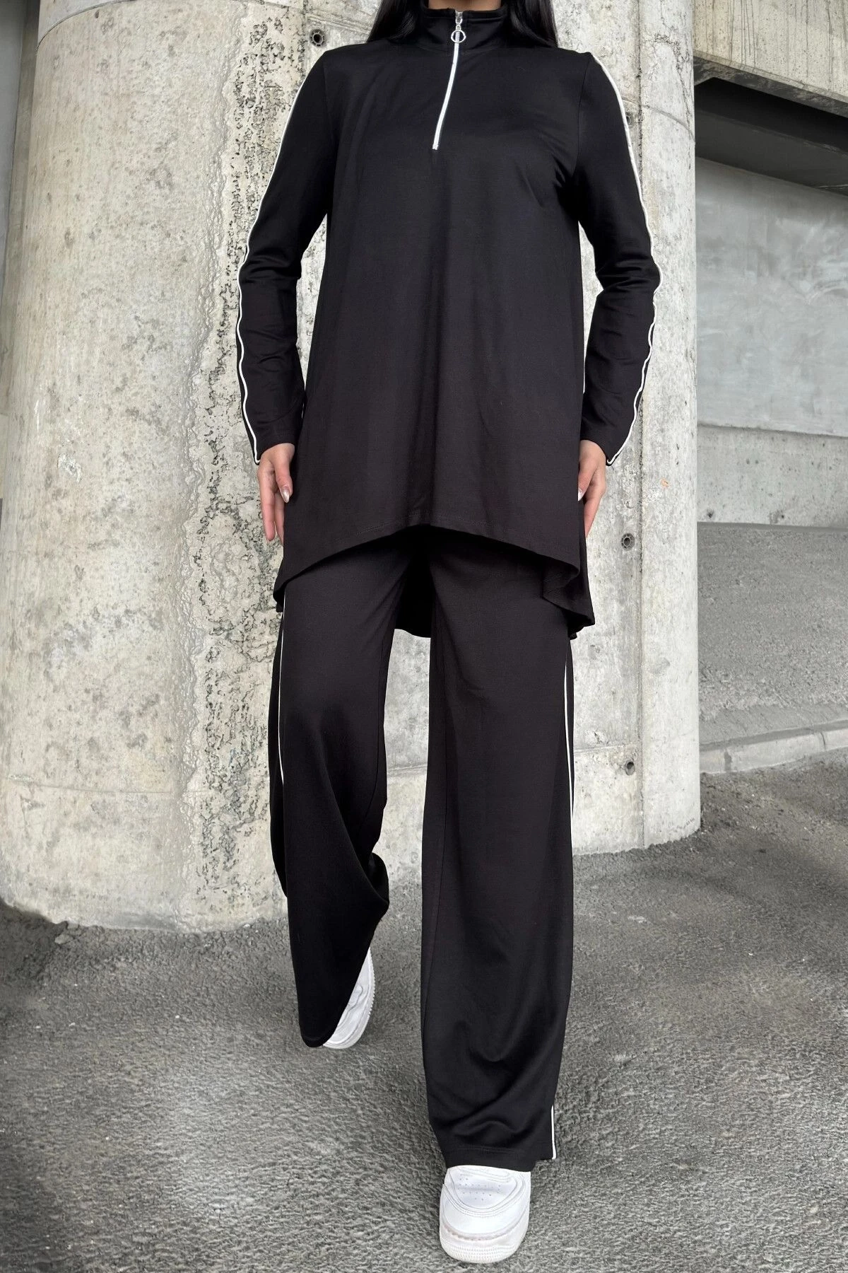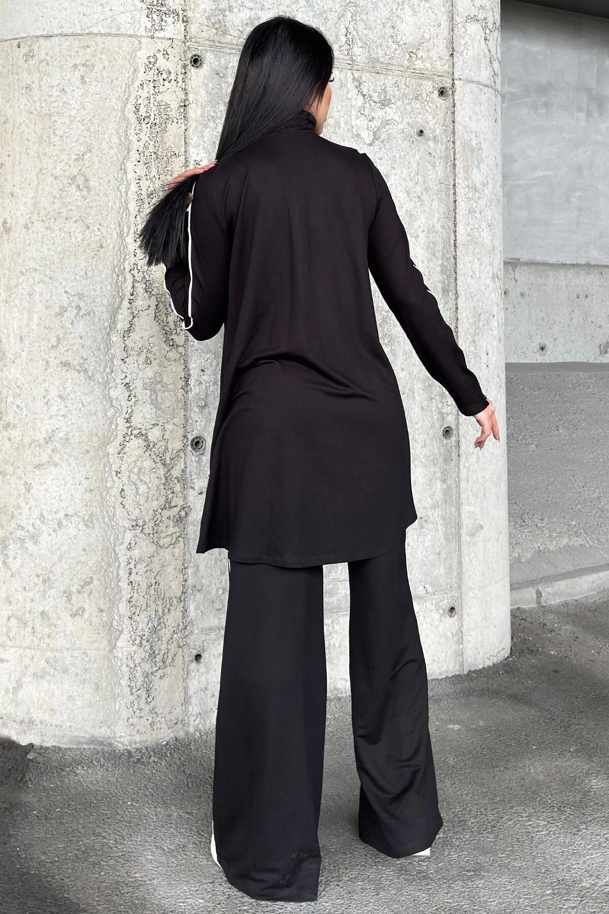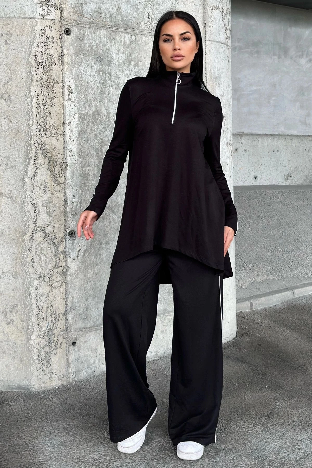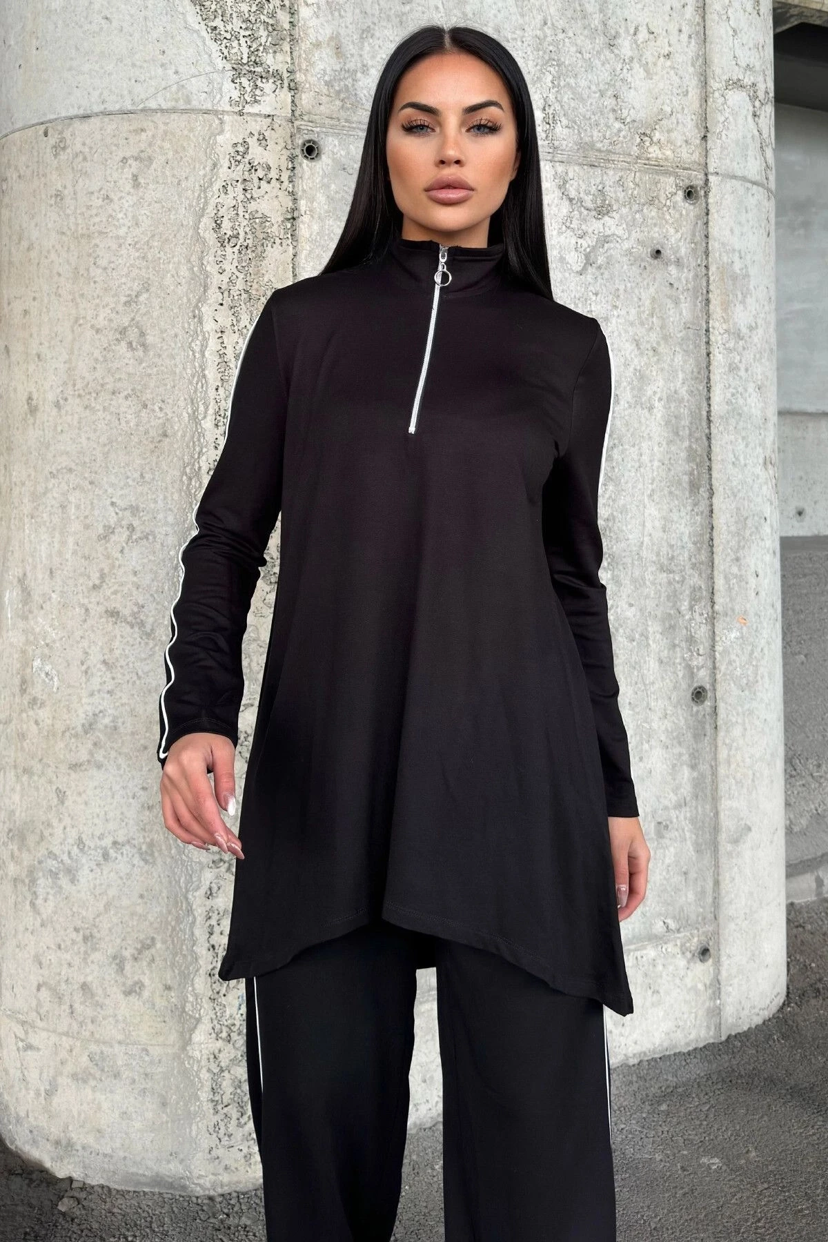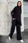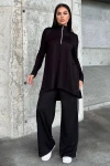 Siyah Asimetrik Kesim, Fermuarlı Bluz & Bol Paça Pantolon - Viskon İki İplik Kumaş Alt & üst Takım