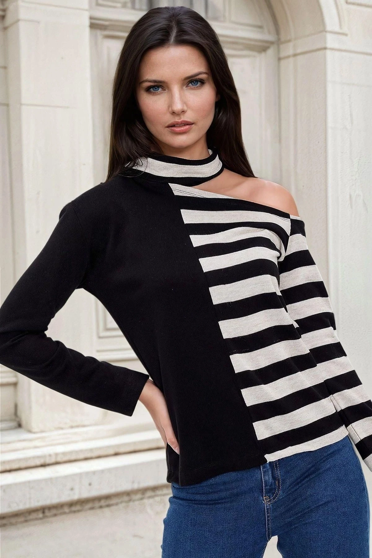 Siyah Bej Asimetrik Kesim, Renk Bloklu, Bluz