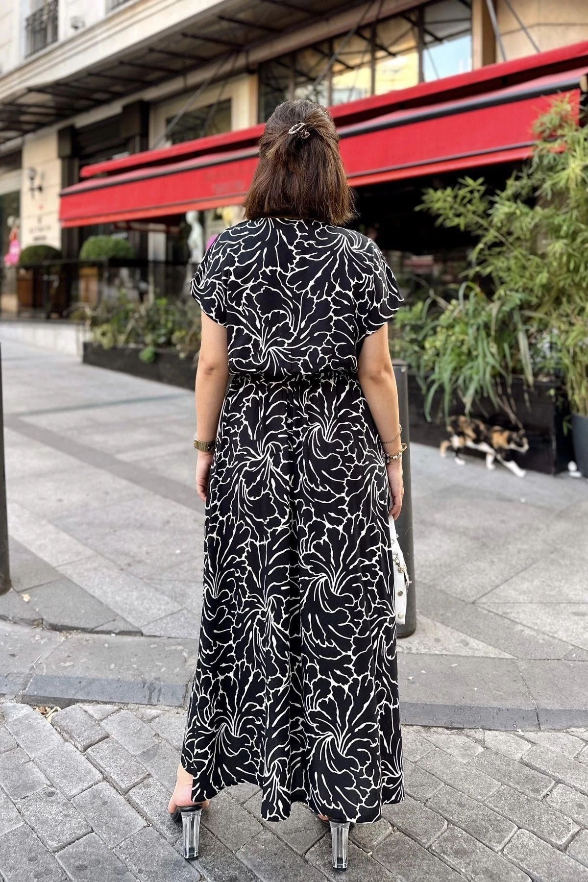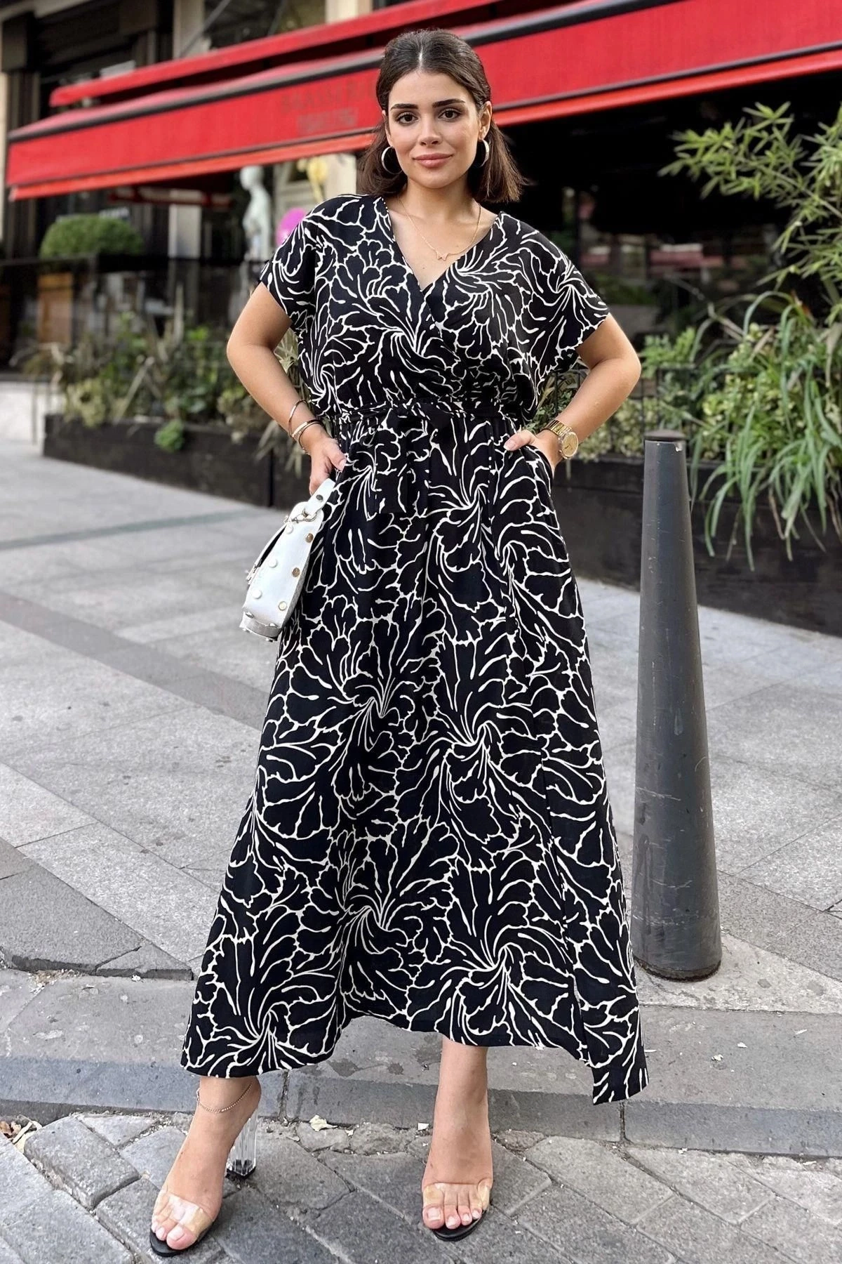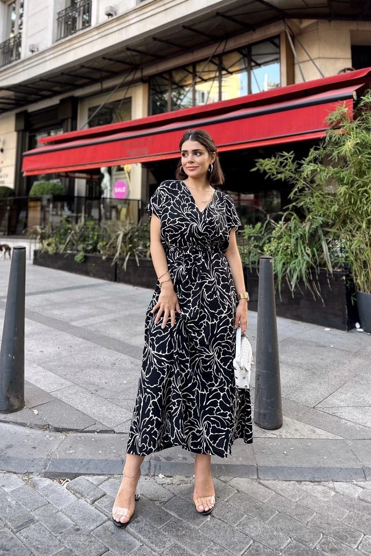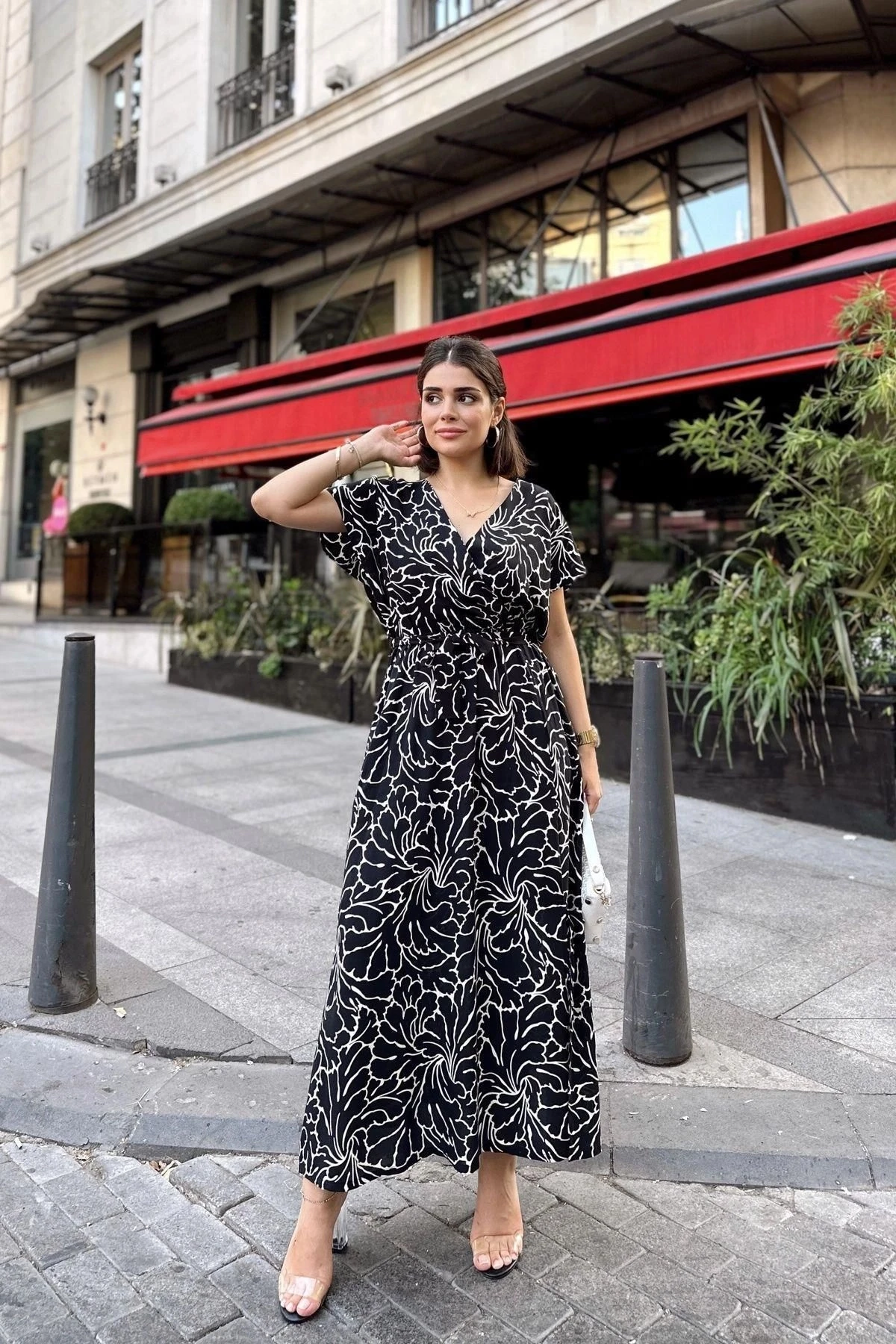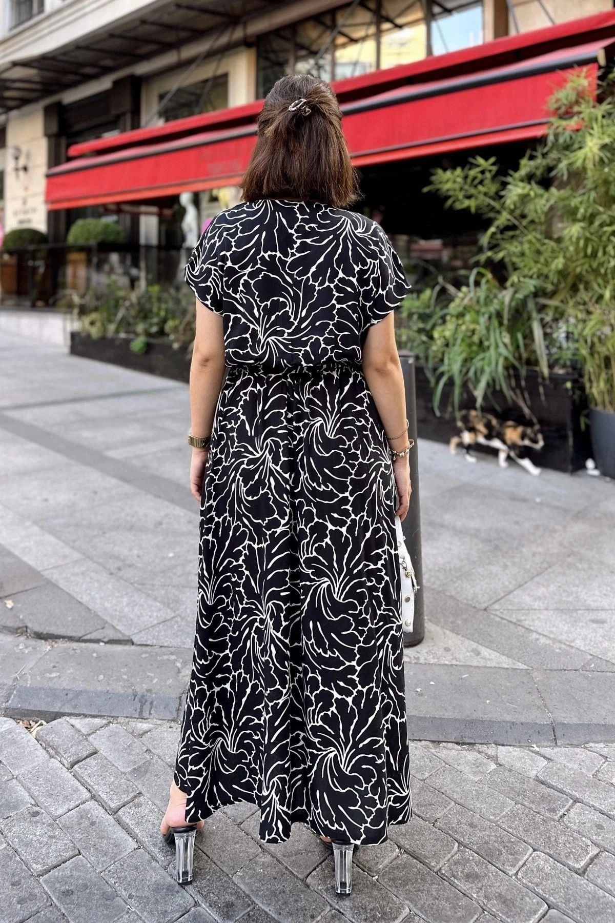 Siyah & Beyaz Desenli Kısa Kol, Kruvaze Beli Lastikli Önden Yırtmaçlı Uzun/Maksi Kiloş Elbise ile şıklığı ve rahatlığı aynı anda yaşayın! Bu özel tasarım elbise, modern ve zarif stili bir araya getirerek gardırobunuzun yıldız parçası olmaya aday.; Elbisenin kumaşı %100 viskozdan üretilmiştir.; Bu seçim, elbiseyi hafif ve rahat kılar.; Viskoz, yumuşak dokusu ve nefes alabilirliği ile bilinir, böylece sıcak havalarda bile rahat hissetmenizi sağlar.; Aynı zamanda elbisenin üzerinde yer alan siyah & beyaz desen, tasarımın çarpıcı ve göz alıcı bir görünüme sahip olmasını sağlar.; Kısa kollu tasarım, yaz aylarında serin ve rahat bir deneyim sunar.; Kruvaze beli lastikli detayı, hem şık bir vurgu eklerken hem de vücut hatlarınıza uyumlu bir şekilde oturmasını sağlar.; Önden yırtmaç detayı, elbiseye hareket ve akıcılık katarken aynı zamanda modern bir hava sunar.130 cm uzunluğu, farklı boy uzunluklarına uygun bir seçenek sunar.; Bu uzunluk, uzun ve zarif bir görünüm sağlayarak her adımda şıklığınızı sergilemenizi kolaylaştırır.; Siyah ve beyaz renklerin desenlerle buluştuğu bu elbise, zıtlıkların ve dengelemenin mükemmel bir örneğidir.; Hem klasik hem de çağdaş bir tarzı yansıtırken aynı zamanda enerjik ve sofistike bir hava yaratır.; Siyah & Beyaz Desenli Kısa Kol, Kruvaze Beli Lastikli Önden Yırtmaçlı Uzun/Maksi Kiloş Elbise ile özel günlerde veya günlük şıklığınızda fark yaratın! Bu elbise, zarif detaylar ve modern tasarımıyla sizi etkileyici bir şekilde tamamlamak için bekliyor.