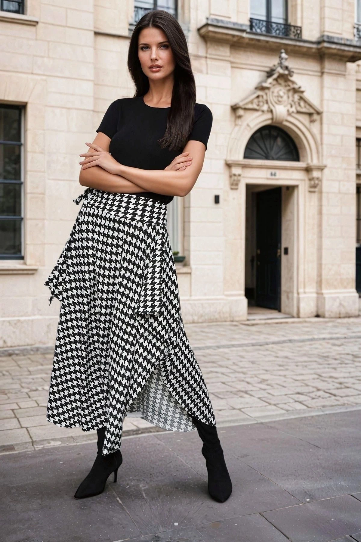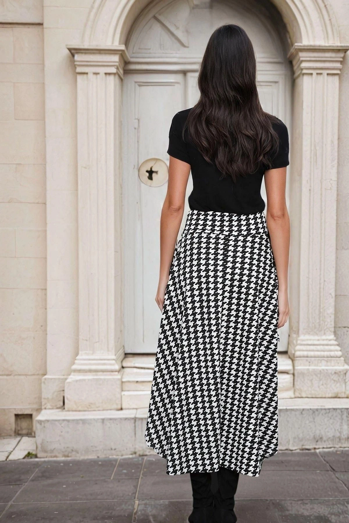 Siyah Beyaz Kazayağı Desenli, Asimetrik Kesim, Uzun Etek