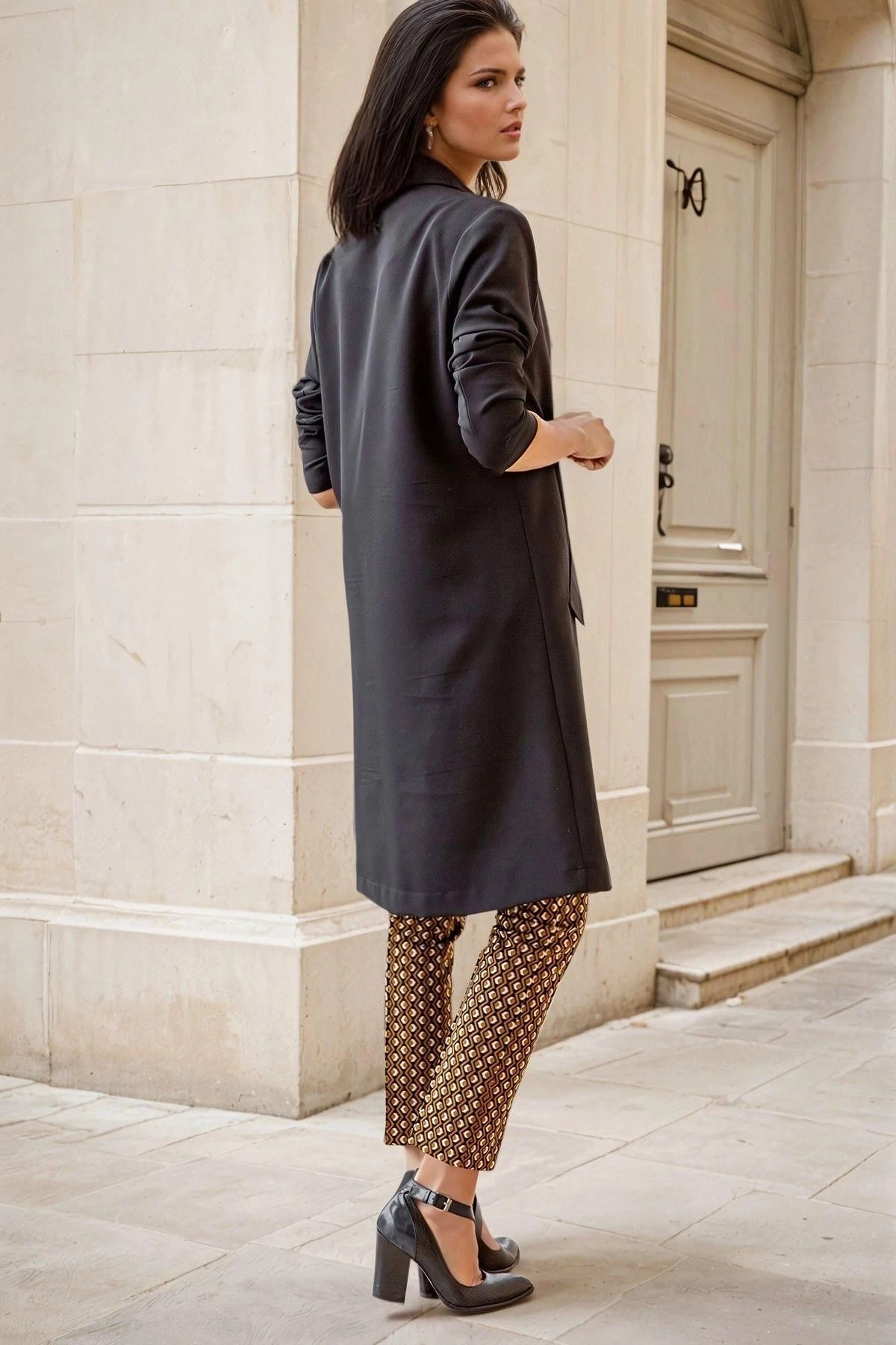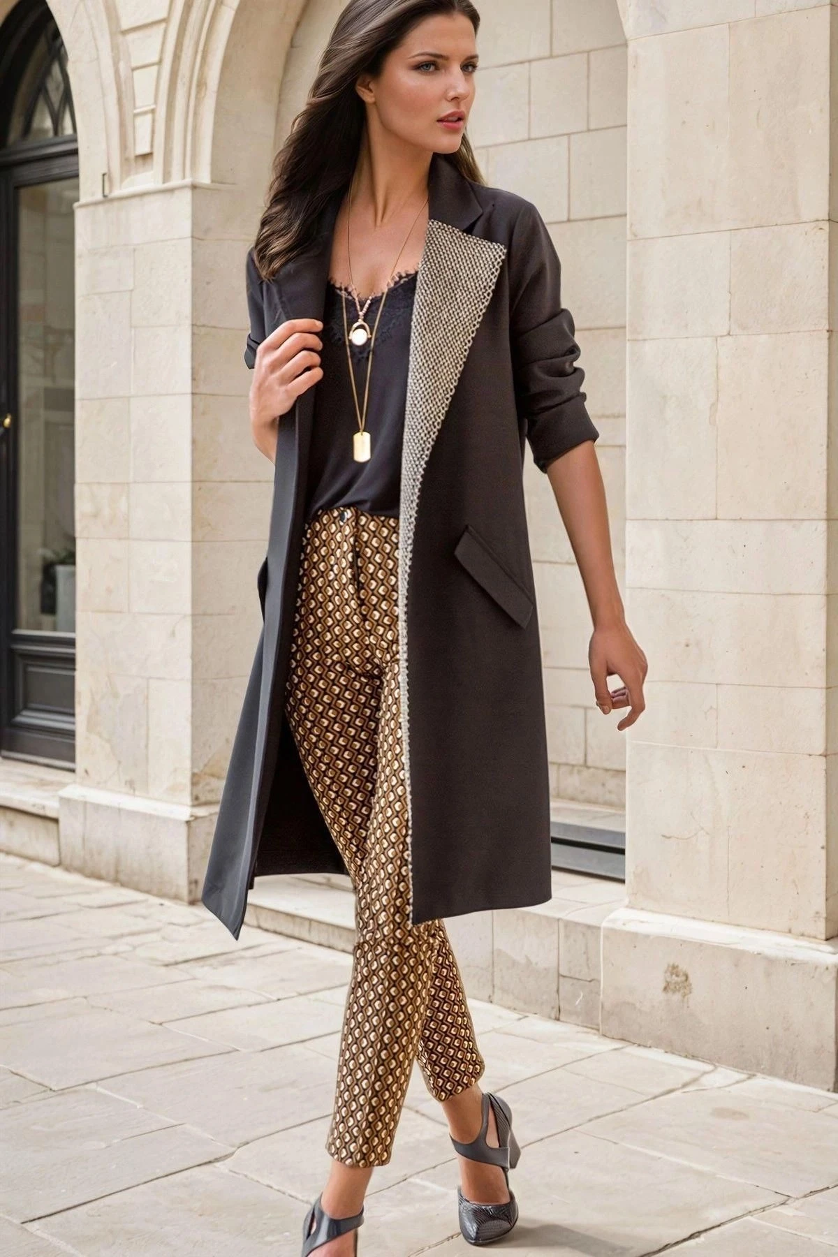 Siyah Ceket Yaka, Desenli, Kapak Cepli, Boyfriend Ceket