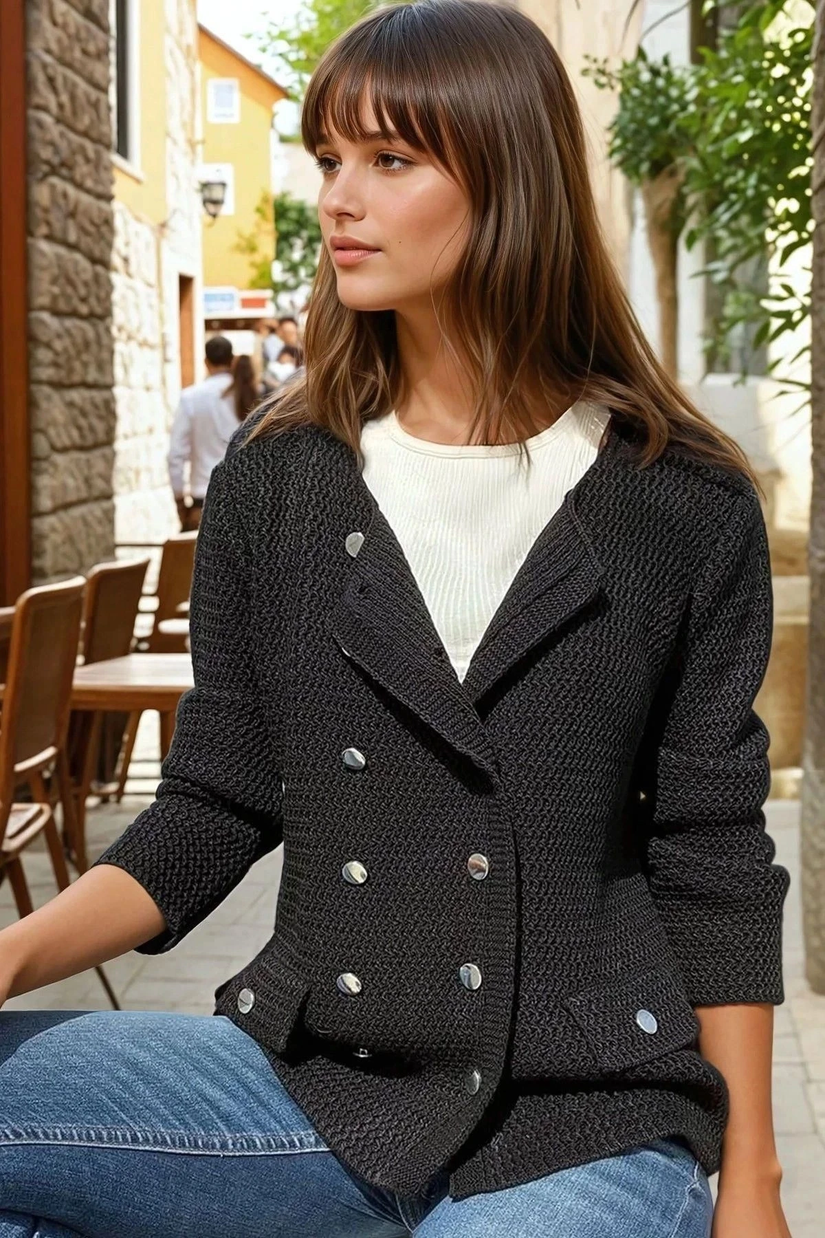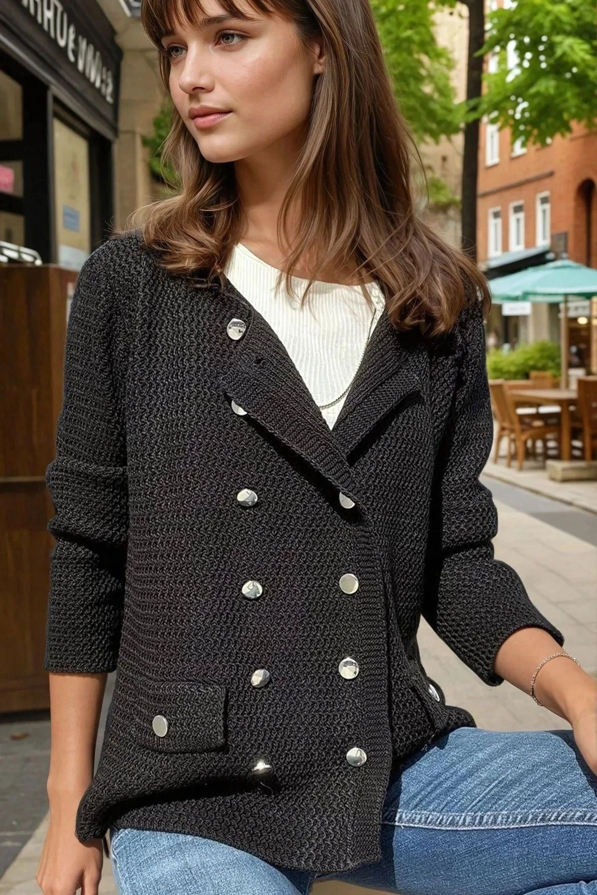 Siyah Çift Sıra Düğmeli Cep Detaylı, Özel Dokulu Örme Triko Ceket Hırka