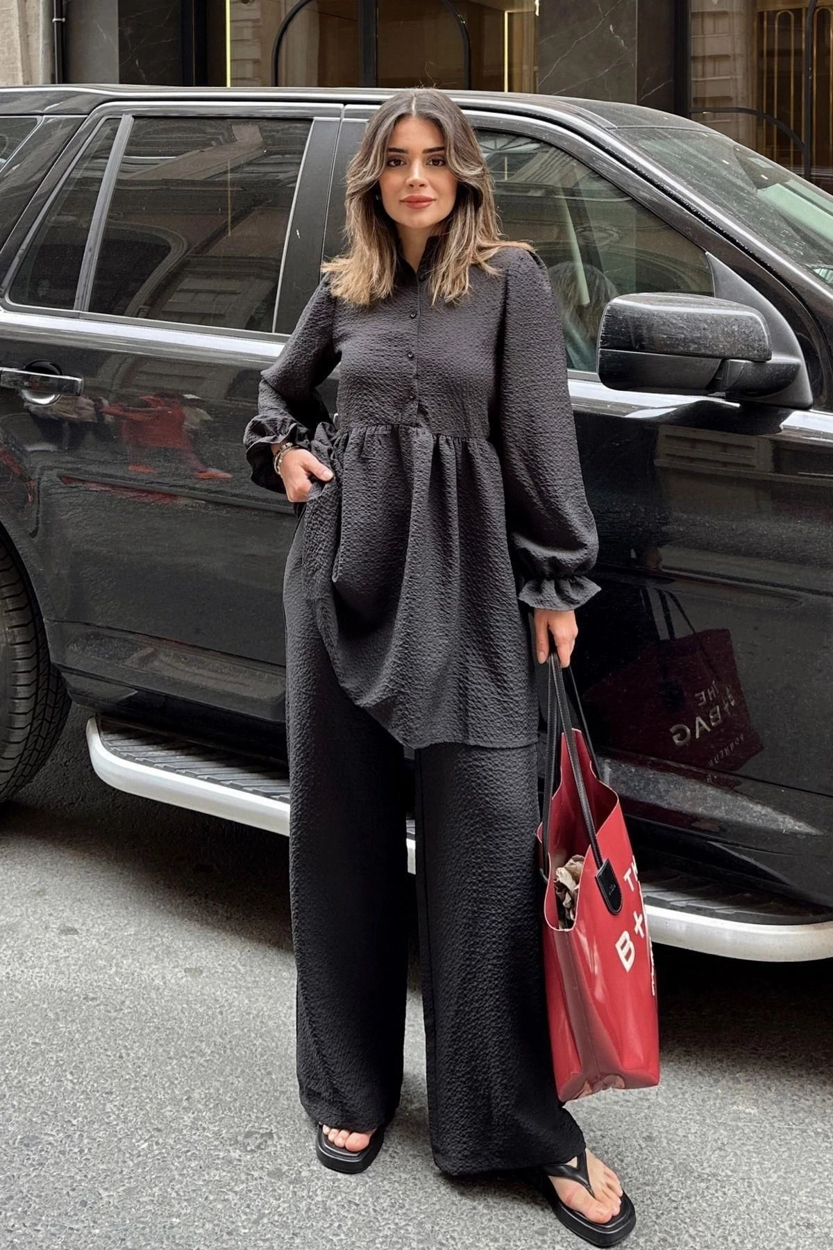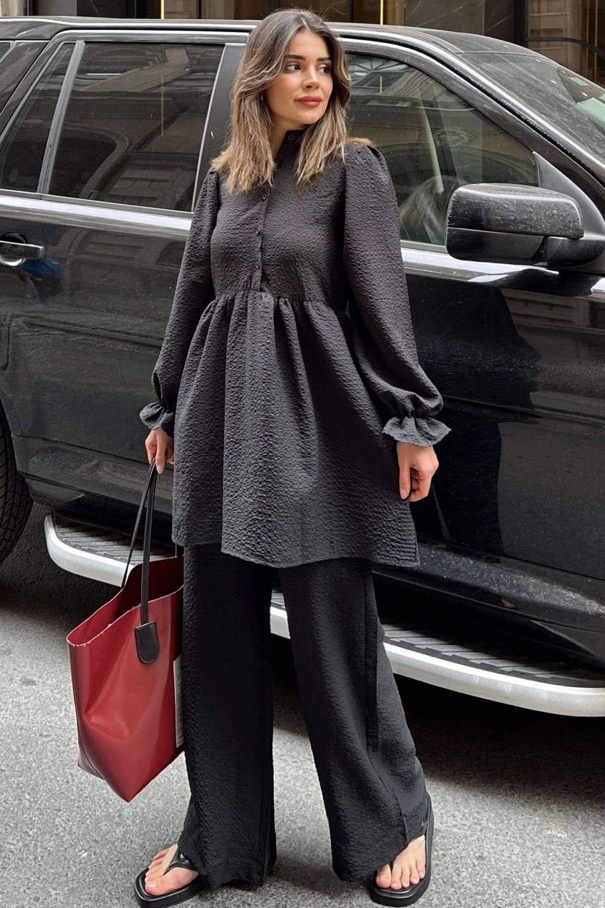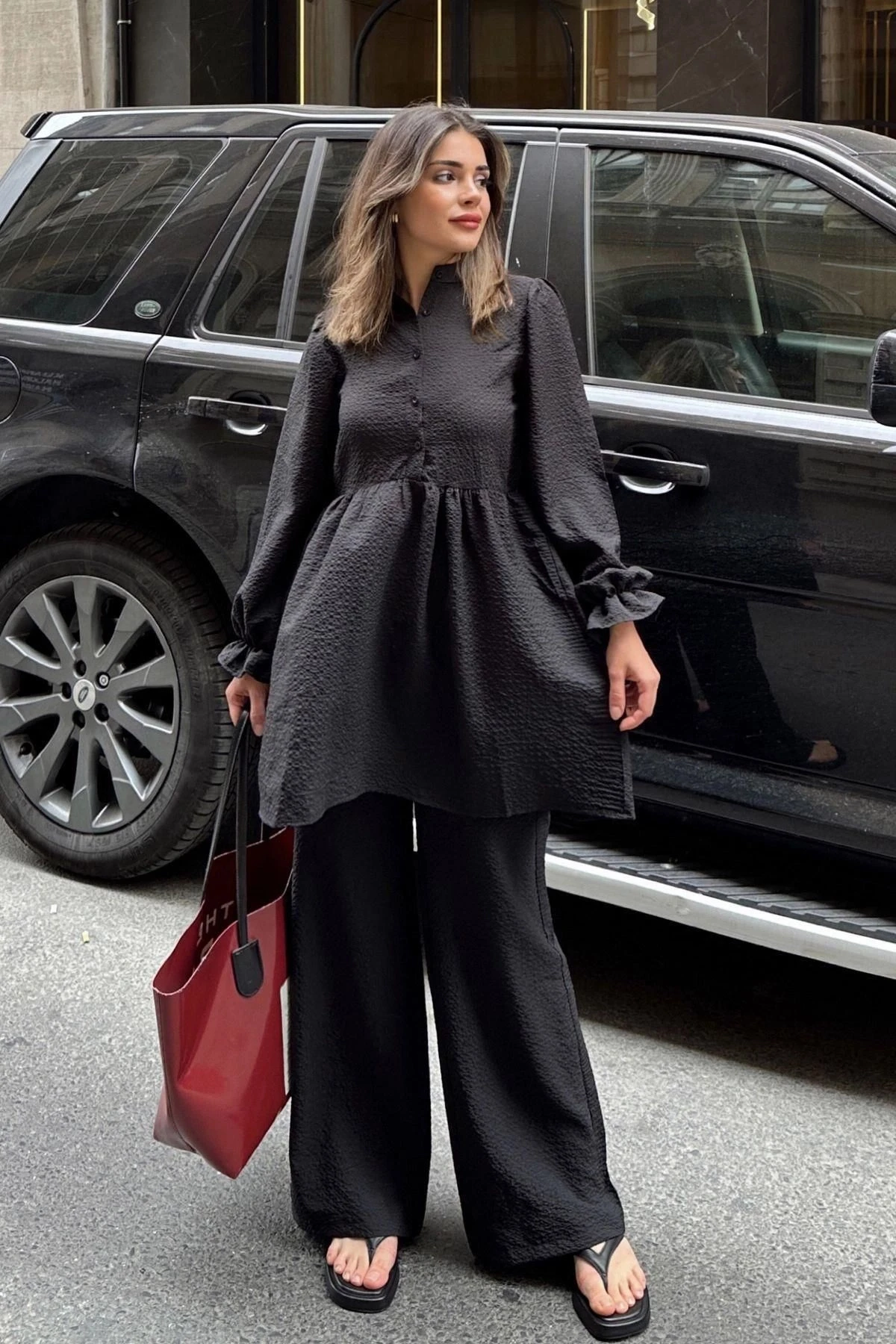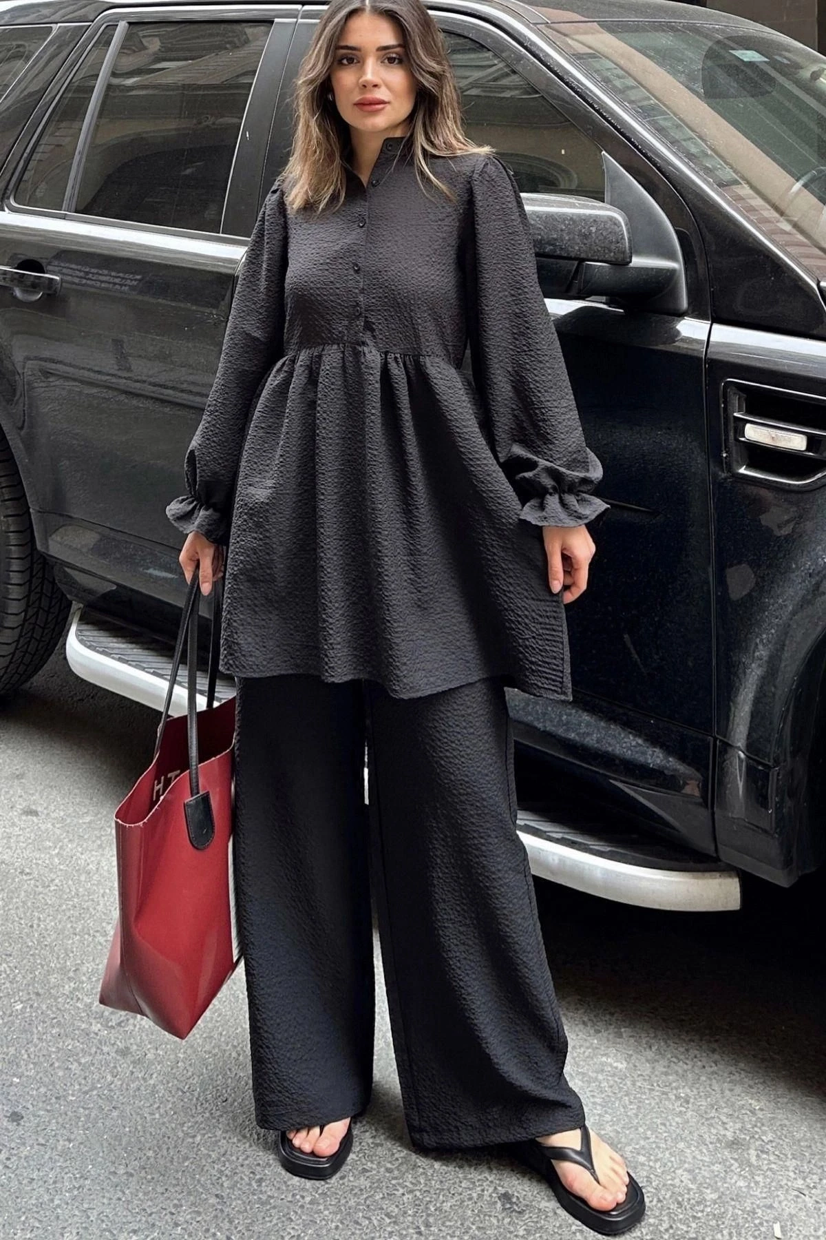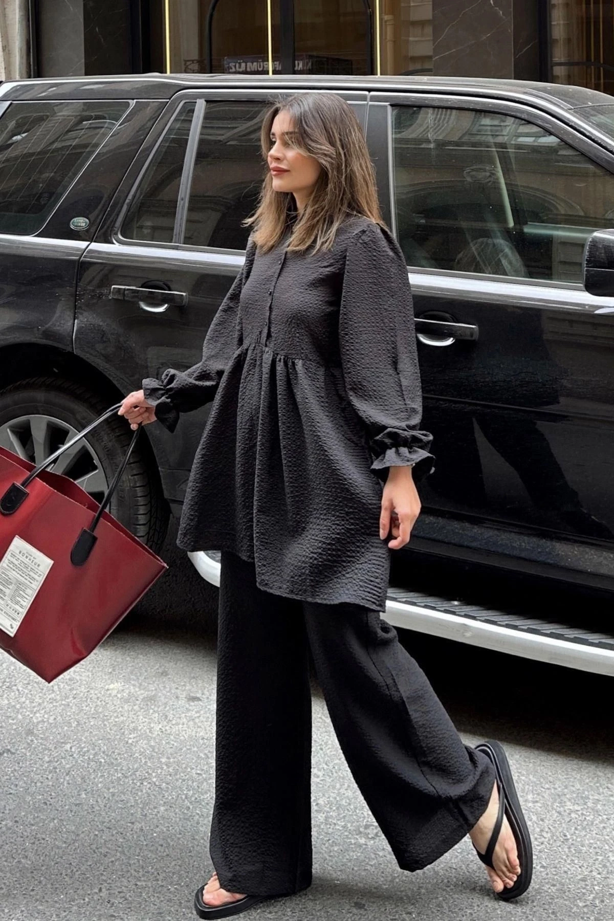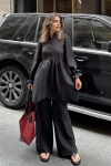 Siyah Hakim Yaka, Balon Kol, Tunik & Bol Paça Pantolon - Fırfırlı Salaş Alt & Üst Pamuklu Takım