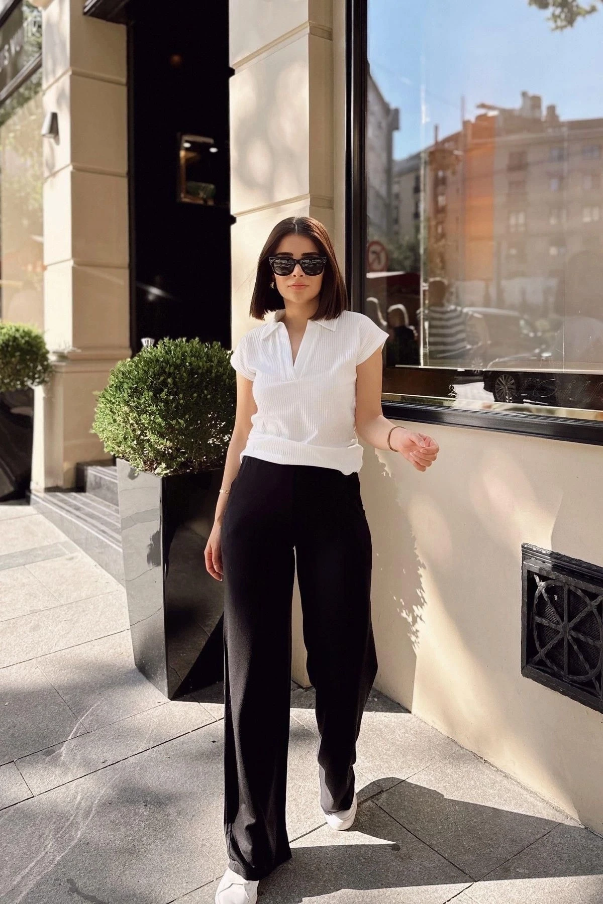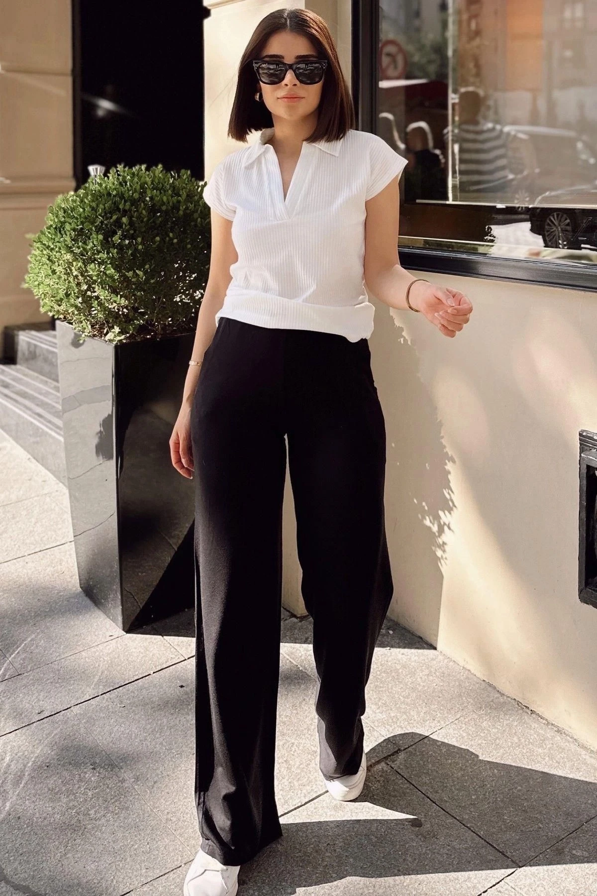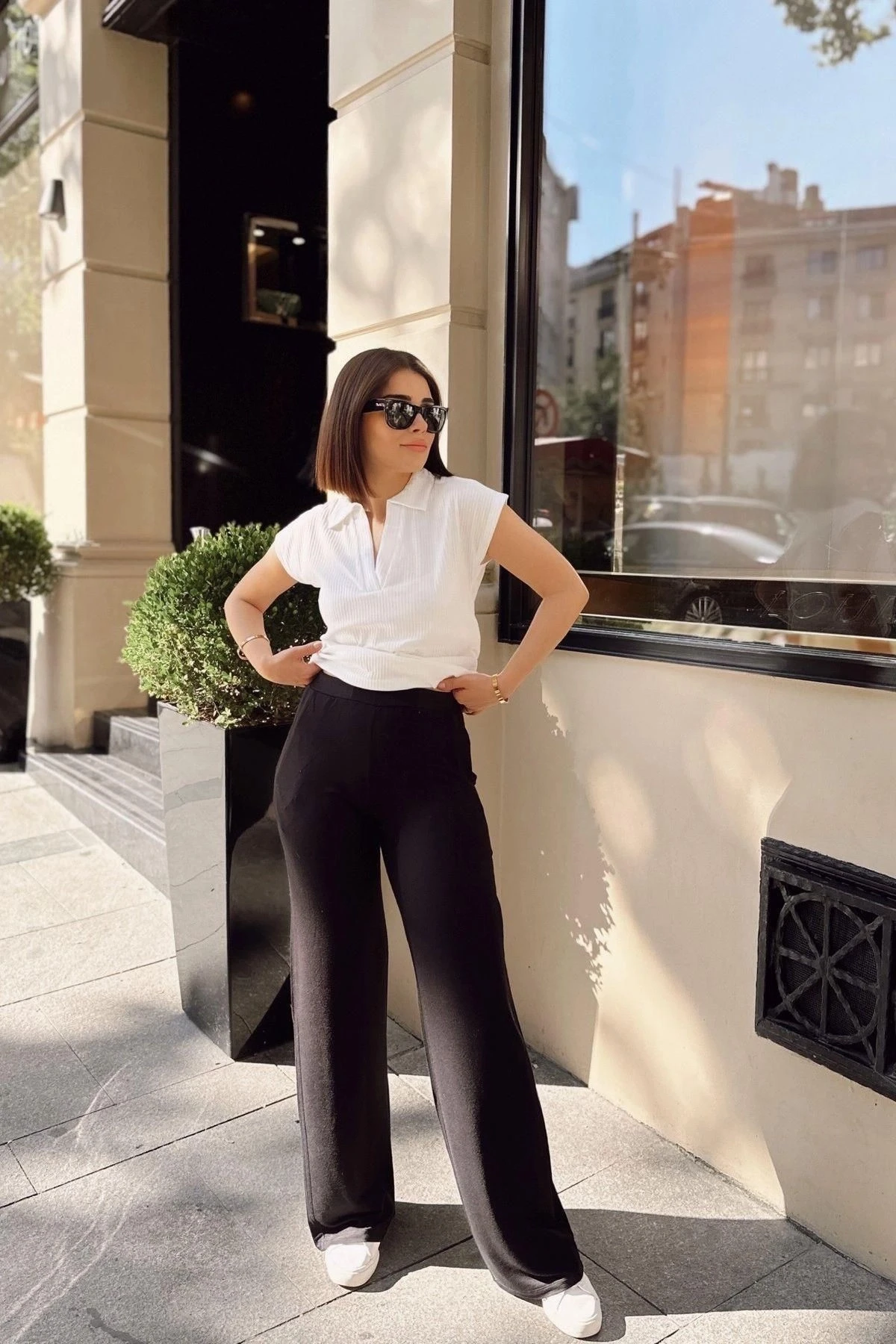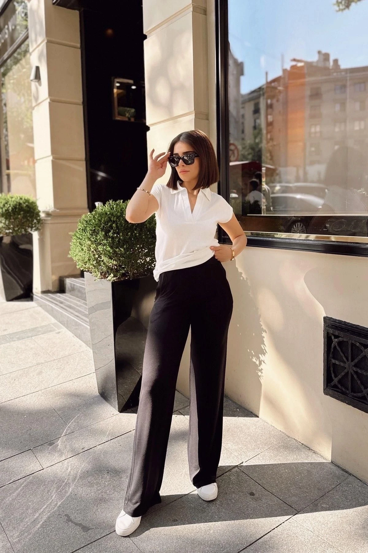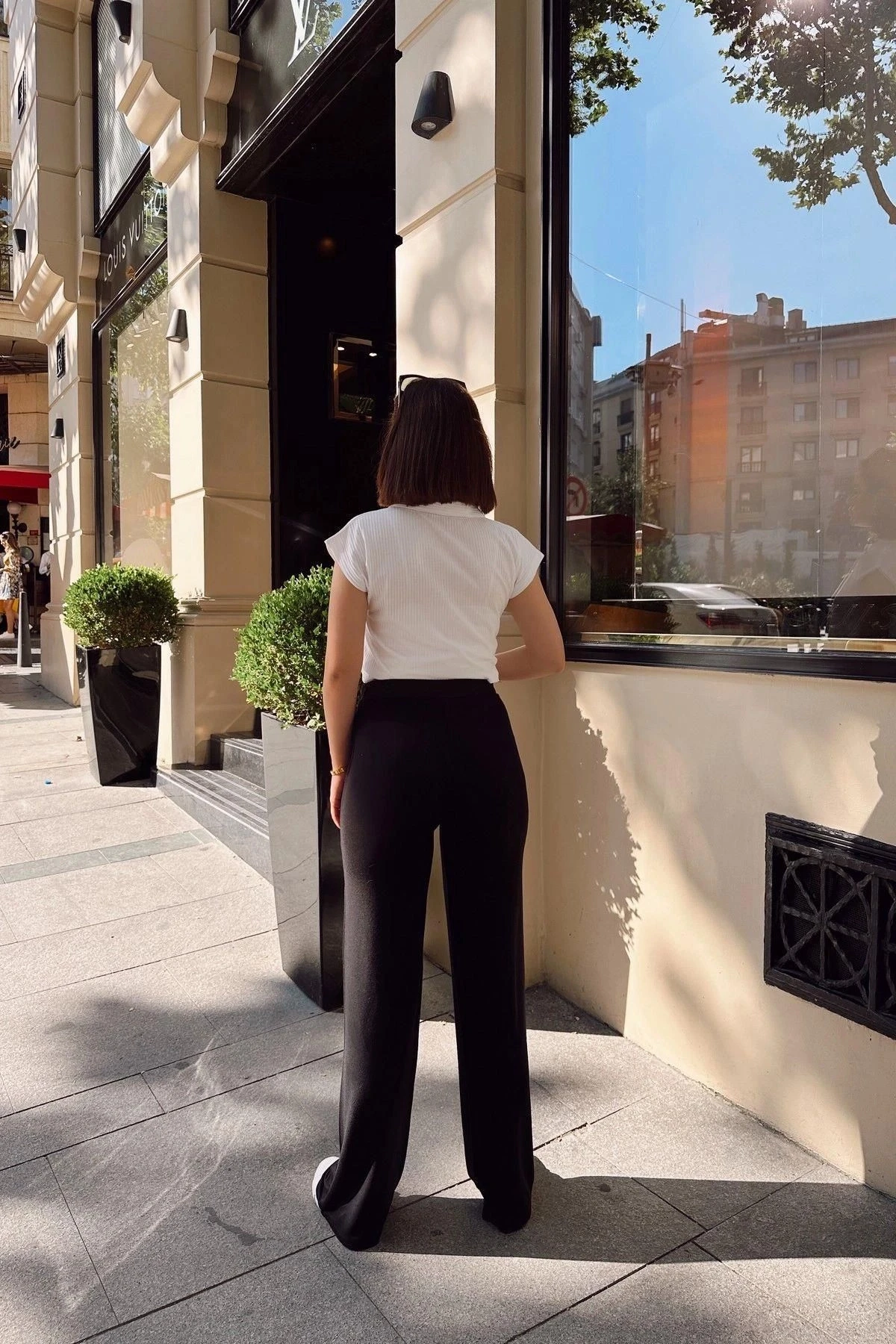 Bu Siyah İspanyol Bol Paça, Lastikli Bel, Yumuşak Dokulu Kumaş, Salaş & Rahat Kalıp/Kesim, Pantolon, tarzınızı yansıtan bir seçenektir.; %95 polyester %5 elastane kumaş yapısıyla pantolon, hem rahatlık hem de şıklık sunar.; Siyah renk, pantolonu zamansız ve şık bir seçenek haline getirir.; İspanyol bol paça ve salaş kesim, modern ve rahat bir görünüm elde etmenizi sağlar.; Lastikli bel, pantolonun rahat bir şekilde oturmasını ve esneklik sağlamasını sağlar.; Yumuşak dokulu kumaş, pantolonun giyim konforunu artırır.; İnce bir elastane katkısı, pantolonun hareket özgürlüğünü ve esnekliğini artırır.; Bu sayede pantolon, günlük kullanımda rahatlıkla tercih edilebilir.; Siyah İspanyol Bol Paça, Lastikli Bel, Yumuşak Dokulu Kumaş, Salaş & Rahat Kalıp/Kesim, Pantolon, hem şık hem de rahat bir tarz yaratmak isteyenler için ideal bir seçenektir.; Günlük kombinlerinizde veya özel bir etkinlikte stilinizi tamamlamak için tercih edebilirsiniz.; Bu pantolon, kaliteli kumaşı, rahat kesimi ve şık tasarımıyla gardırobunuzun vazgeçilmez bir parçası olabilir.; Siyah İspanyol Bol Paça, Lastikli Bel, Yumuşak Dokulu Kumaş, Salaş & Rahat Kalıp/Kesim, Pantolon ile tarzınızı yansıtabilir ve farklı kombinler oluşturabilirsiniz.
