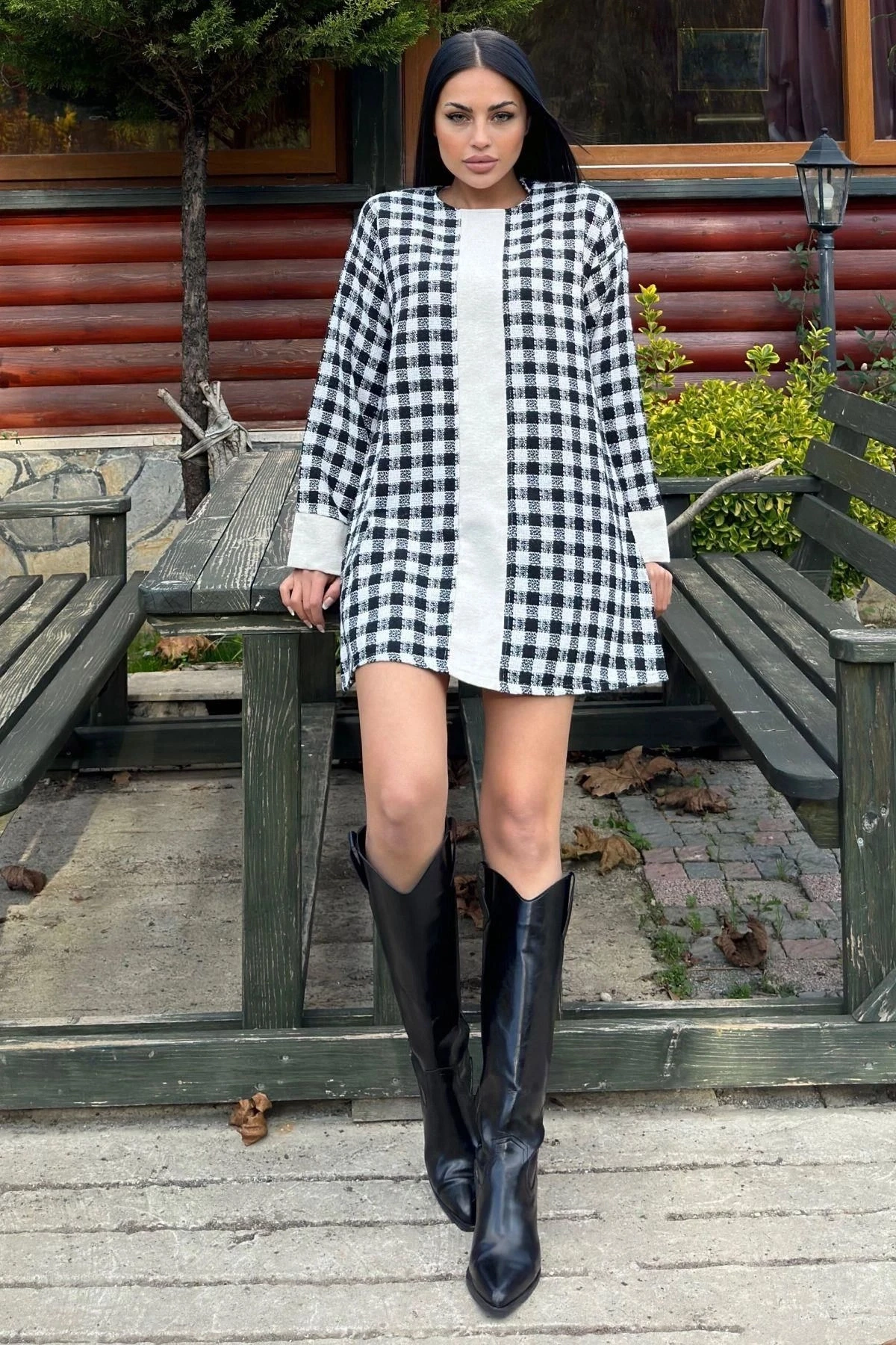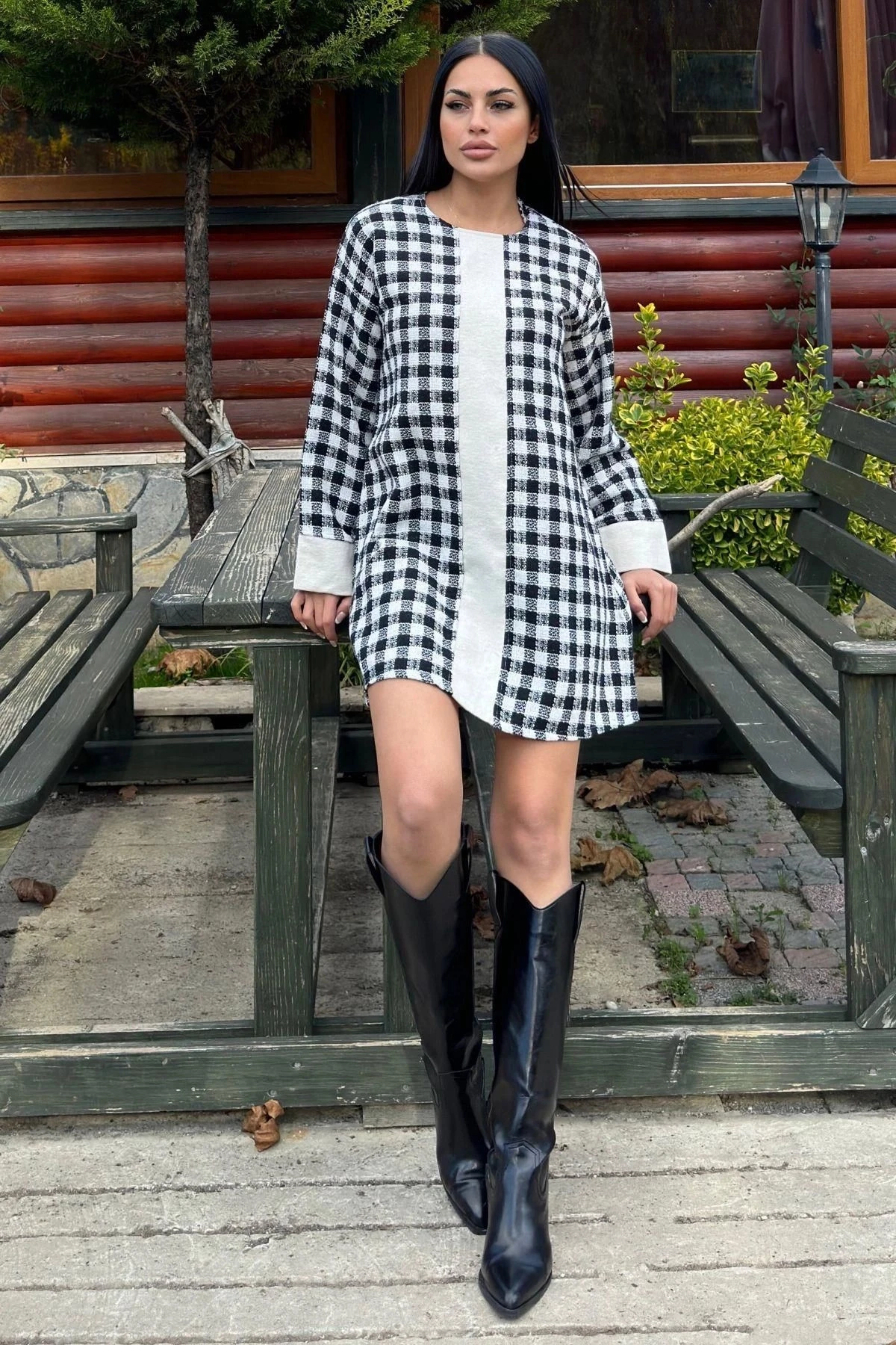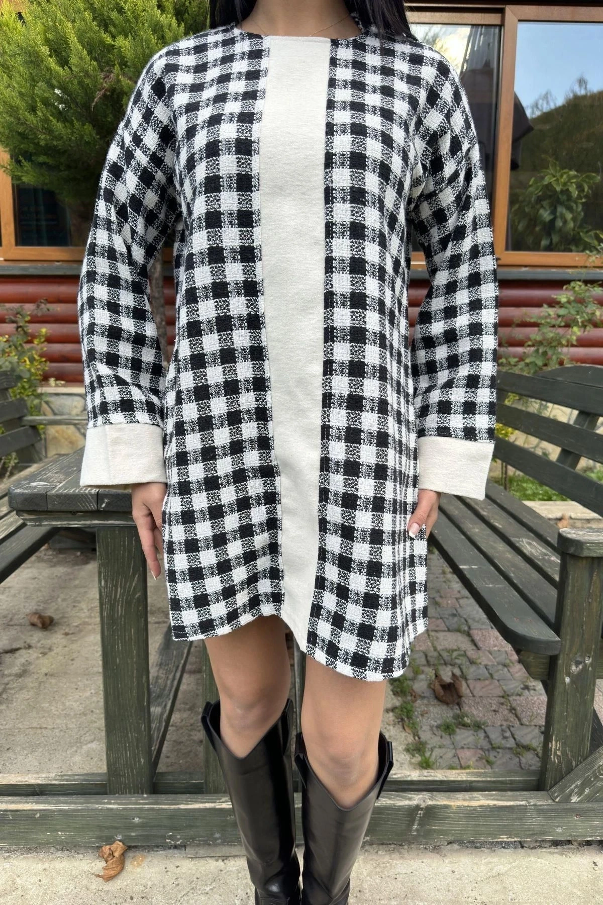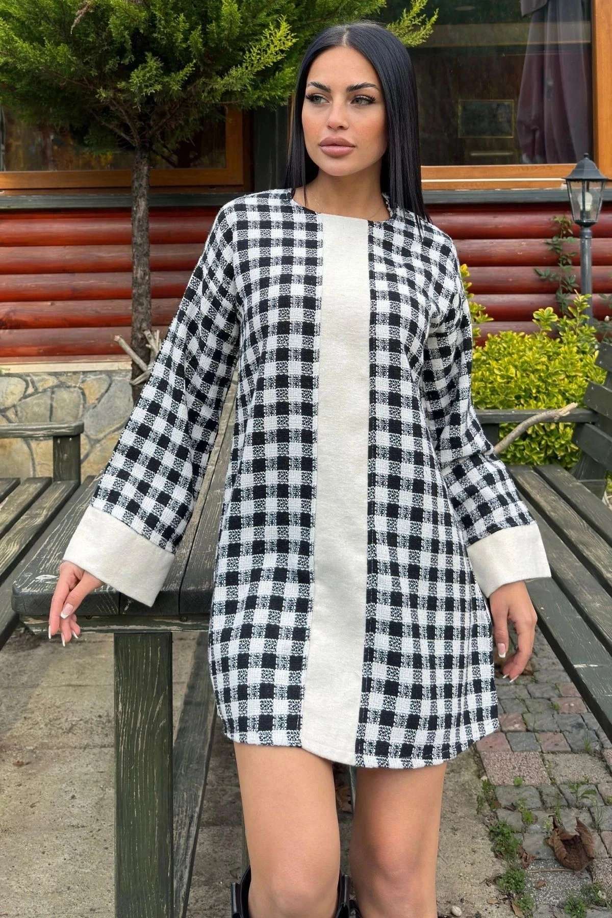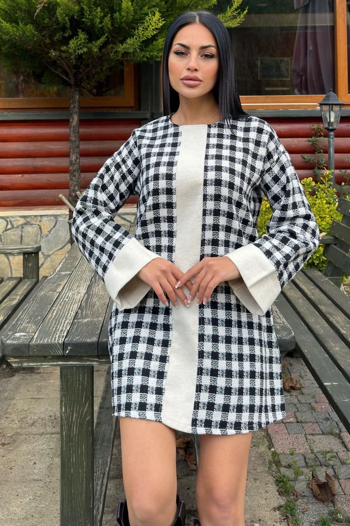 Siyah Kare Desenli Şanel Kumaş, Geniş Manşet Detaylı, Salaş Midi Elbise