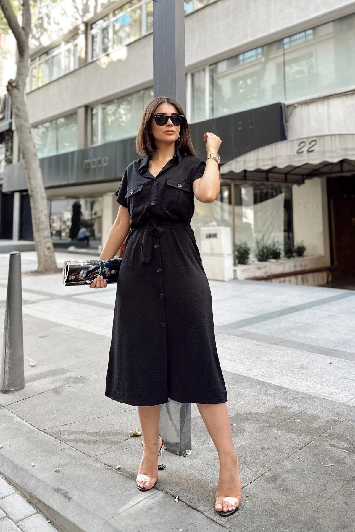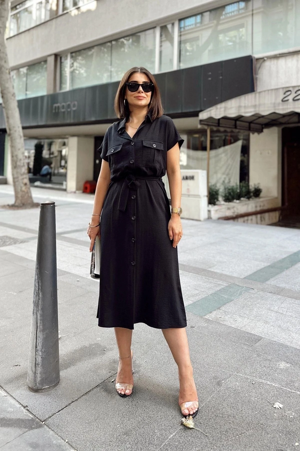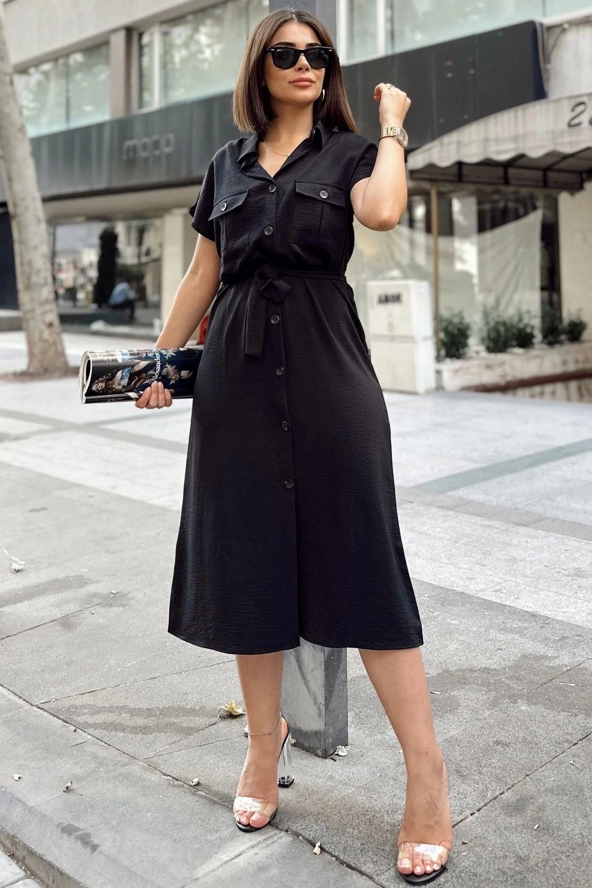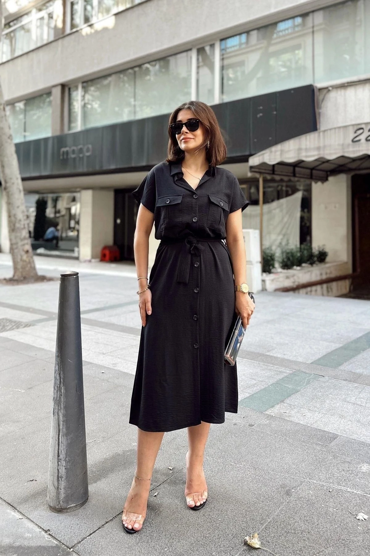 Siyah Kısa Kol, Gömlek Yaka, Düz Desen, Çift Cepli, Aerobin Kumaş, Kuşaklı Maxi Elbise ile şıklık ve rahatlığı bir araya getirin.; Bu özel tasarım elbise, hem günlük kullanıma hem de özel etkinliklere uygun stiliyle sizi cezbedecek.; %60 polyester ve %40 cotton karışımı olan kumaş, elbisenin hem yumuşaklığını hem de dayanıklılığını artırırken, kolay bakım sağlar.; Aerobin kumaşın hafifliği ve rahatlığı, elbisenin giyim konforunu üst seviyeye taşır.; Kısa kollu tasarım, elbiseye dinamik bir hava katar ve kolay hareket etmenizi sağlar.; Gömlek yaka detayı ise şıklığı ve zarafeti ön plana çıkarır.; Düz deseni ve çift cepli tasarımı, elbiseye modern bir dokunuş katar ve işlevselliği artırır.; Cepler, elbisenin kullanışlılığını yükselterek günlük eşyalarınızı taşımanızı kolaylaştırır.; Kuşaklı tasarım, elbisenin bel kısmını vurgular ve bedeninize uyumlu bir görünüm sağlar.; Bu özellik aynı zamanda belinizi şekillendirerek elbisenin zarif kesimini ön plana çıkarır.120 cm uzunluğu, elbisenin ayak bileklerinize doğru uzanarak maxi bir görünüm sunmasını sağlar.; Bu uzunluk, zarif ve şık bir tarz yakalamanızı destekler.; Siyah rengi, asaleti ve şıklığı temsil eder.; Bu elbise, her türlü mekanda ve etkinlikte rahatlıkla kullanabileceğiniz şık bir seçenektir.; Siyah Kısa Kol, Gömlek Yaka, Düz Desen, Çift Cepli, Aerobin Kumaş, Kuşaklı Maxi Elbise ile tarzınızı yansıtın ve her anı özel kılın.; Hem rahatlığı hem de şıklığı bir arada sunan bu elbise, gardırobunuzun vazgeçilmezi olabilir.